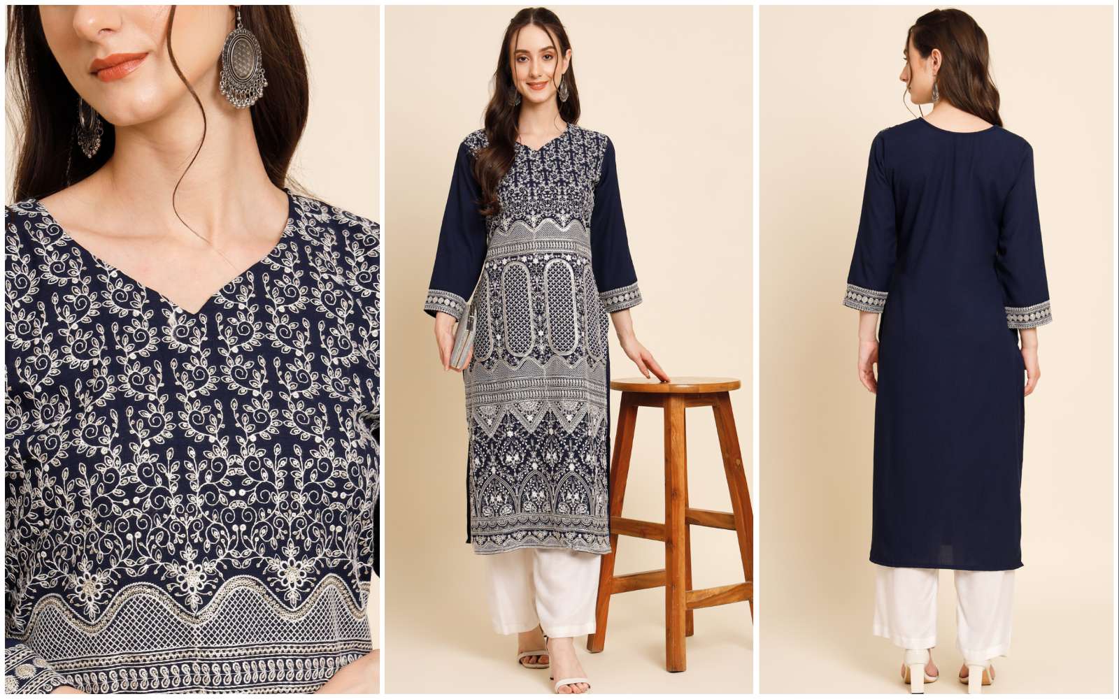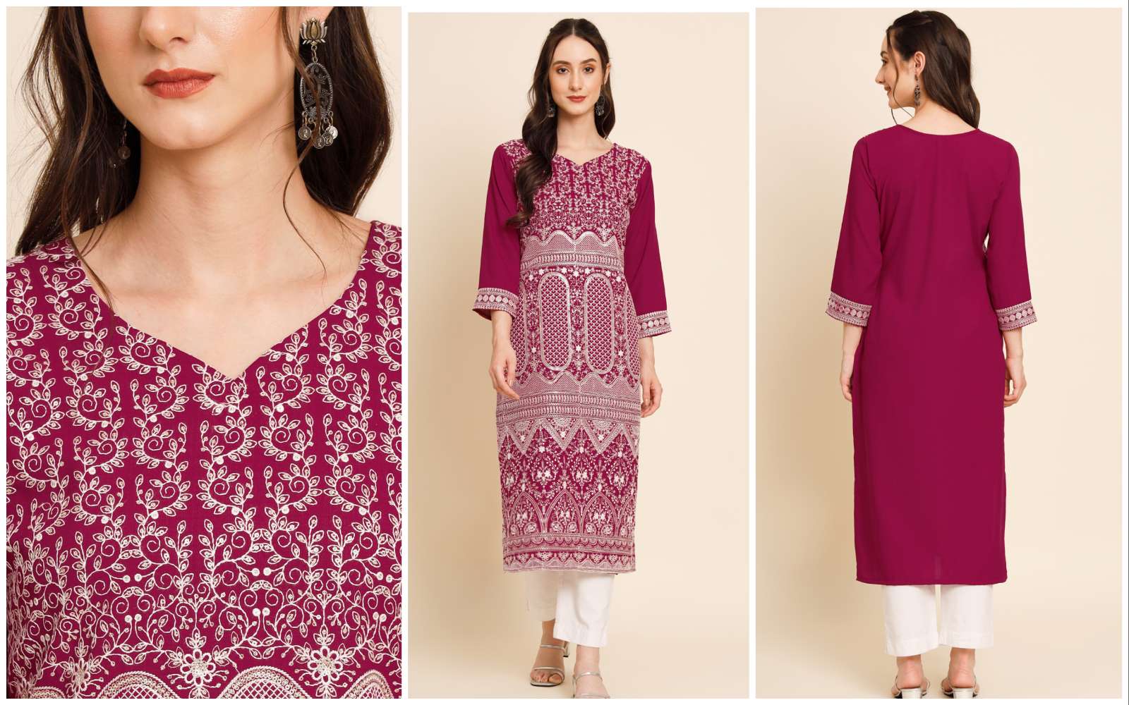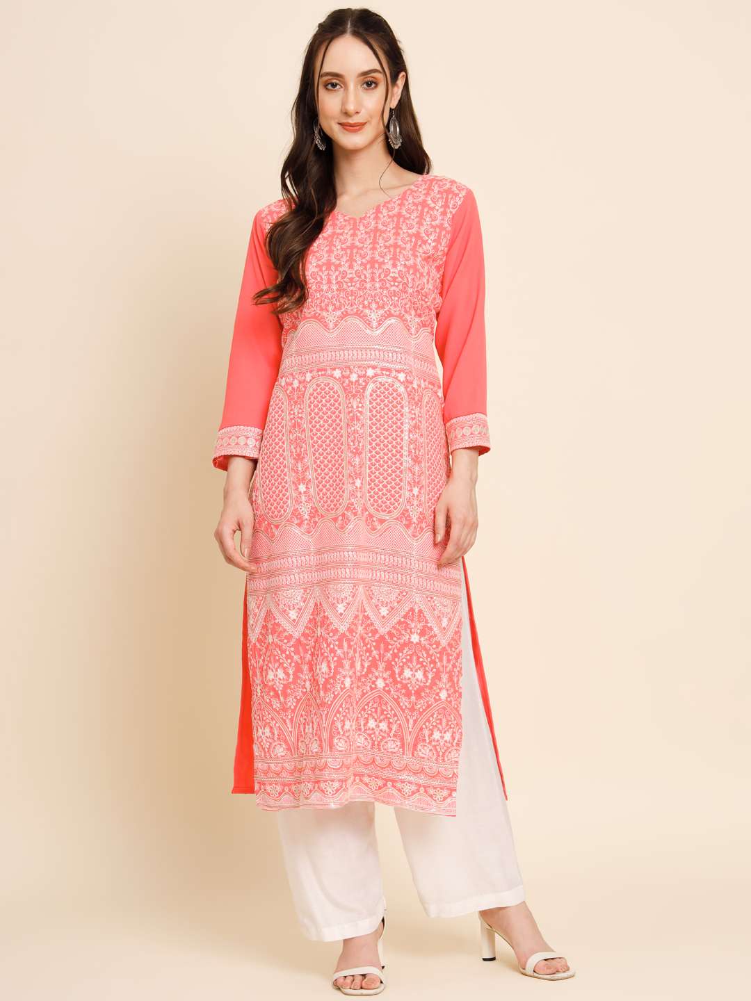 Kartavya Butter crepe Kurta with Embroidery Work Straight Shape Three Quarter Sleeves Sweetheart Neck |