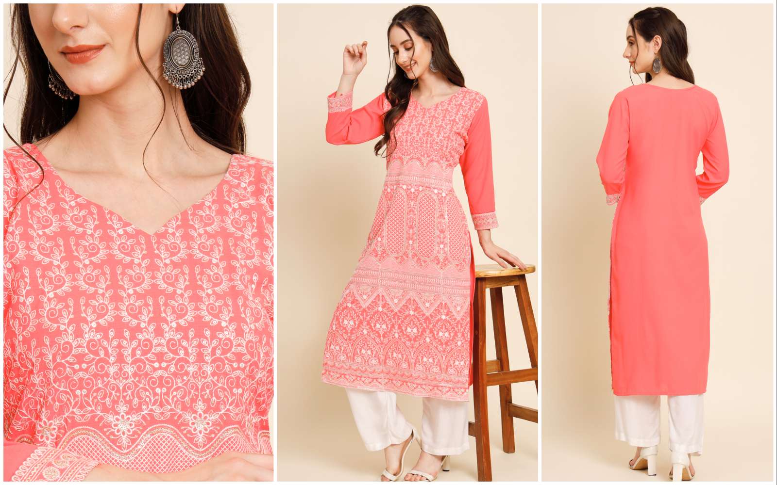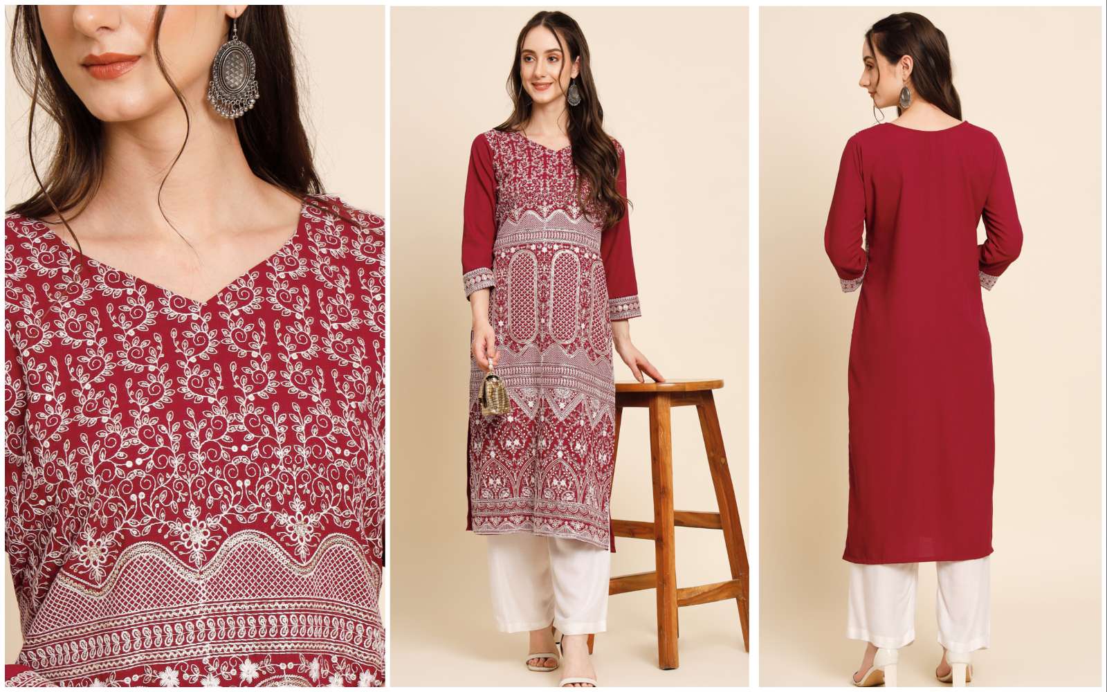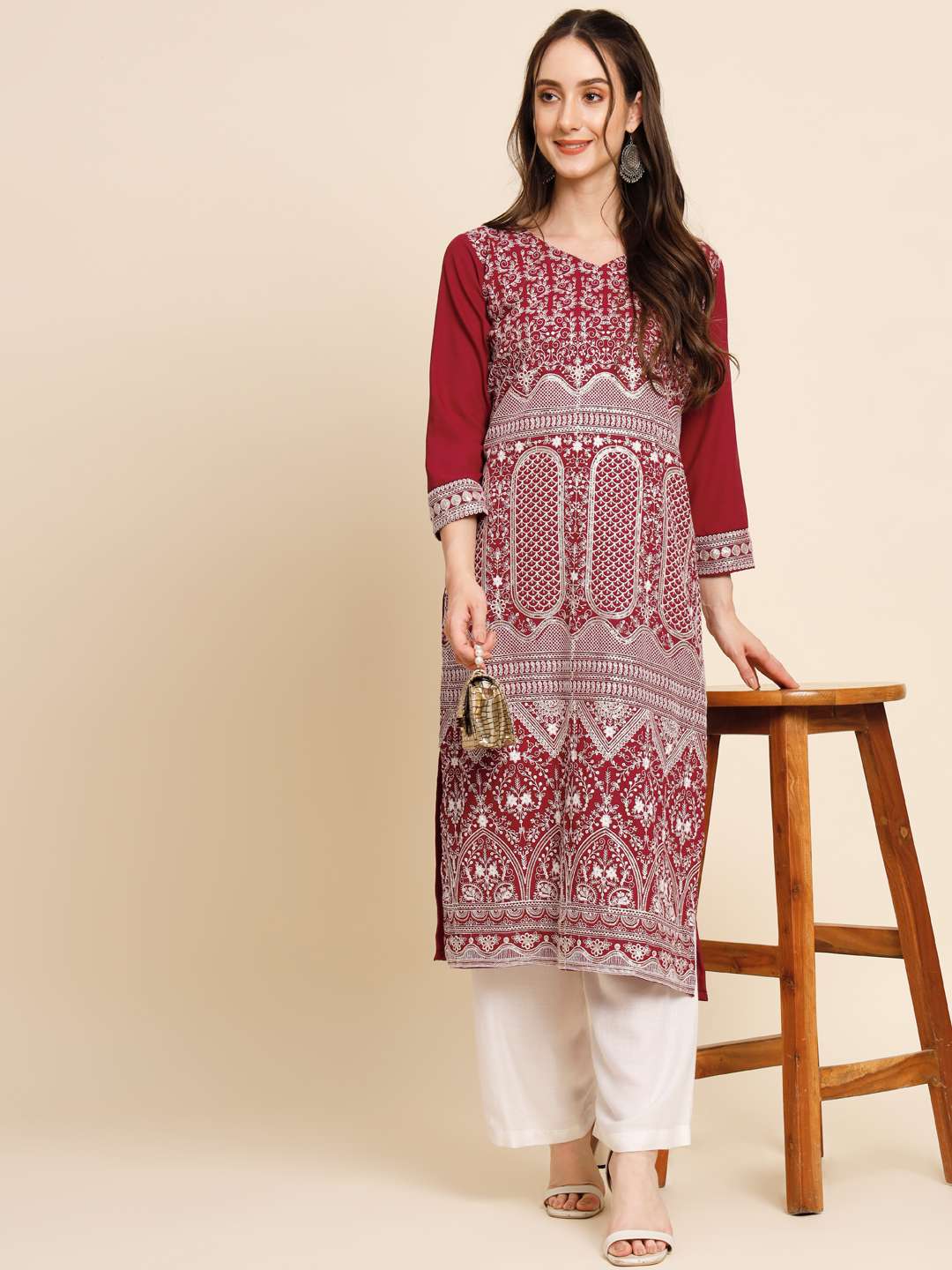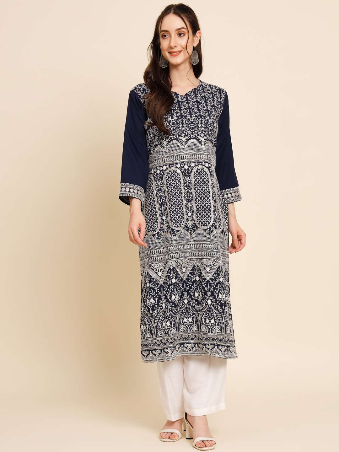 Kartavya Butter crepe Kurta with Embroidery Work Straight Shape Three Quarter Sleeves Sweetheart Neck |