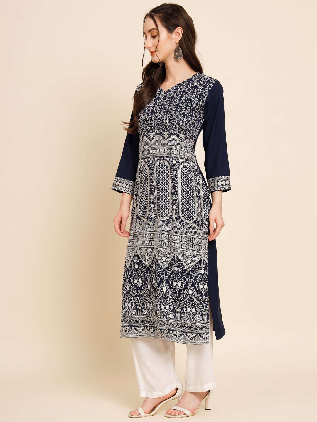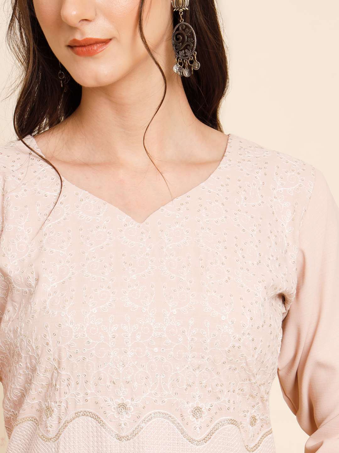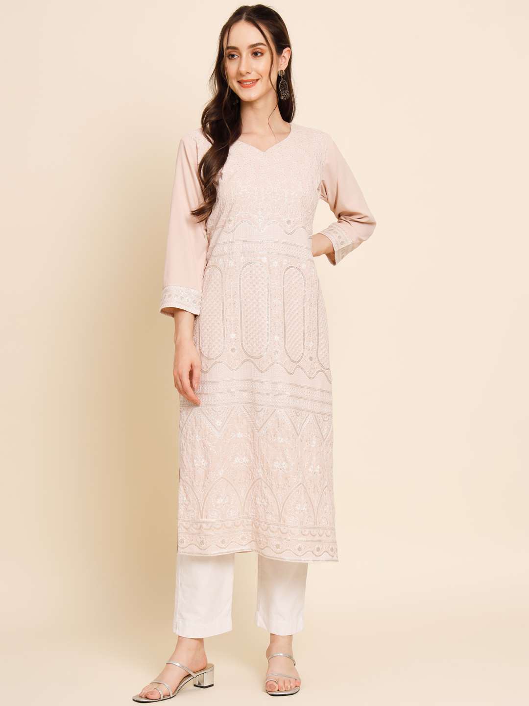 Kartavya Butter crepe Kurta with Embroidery Work Straight Shape Three Quarter Sleeves Sweetheart Neck