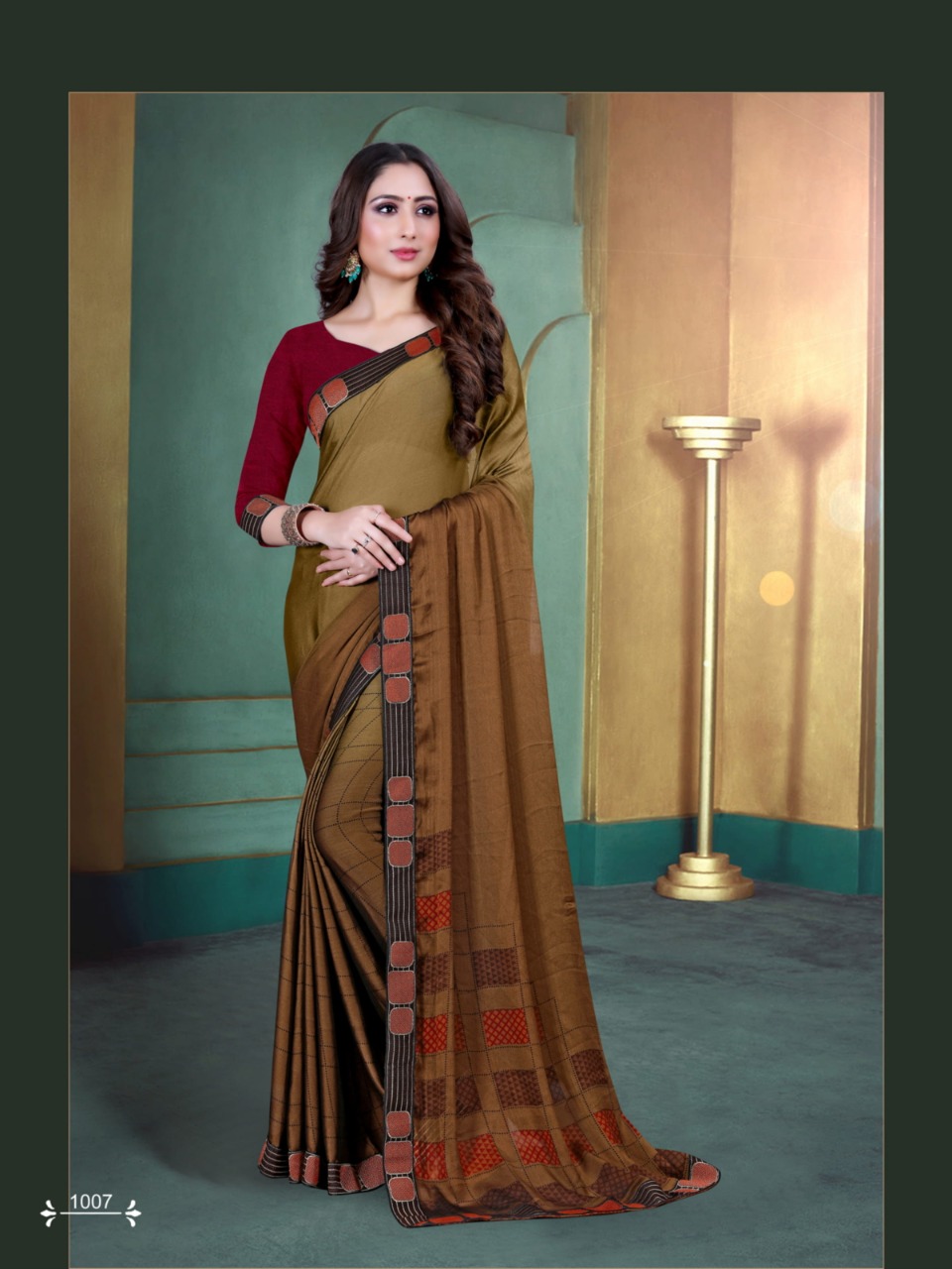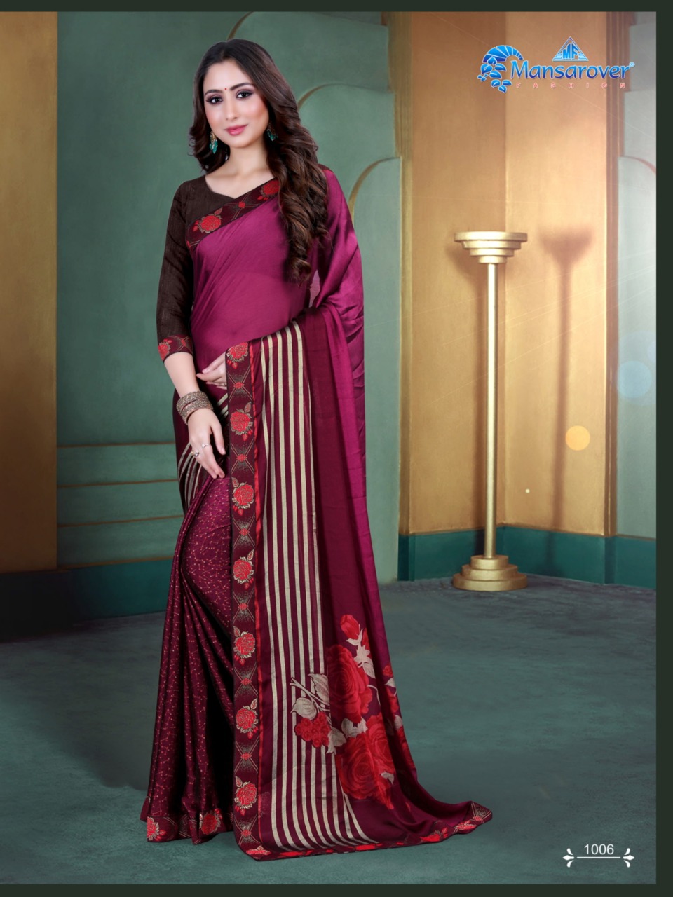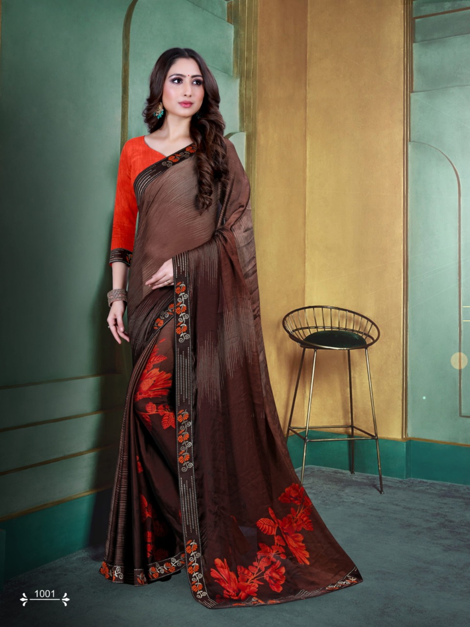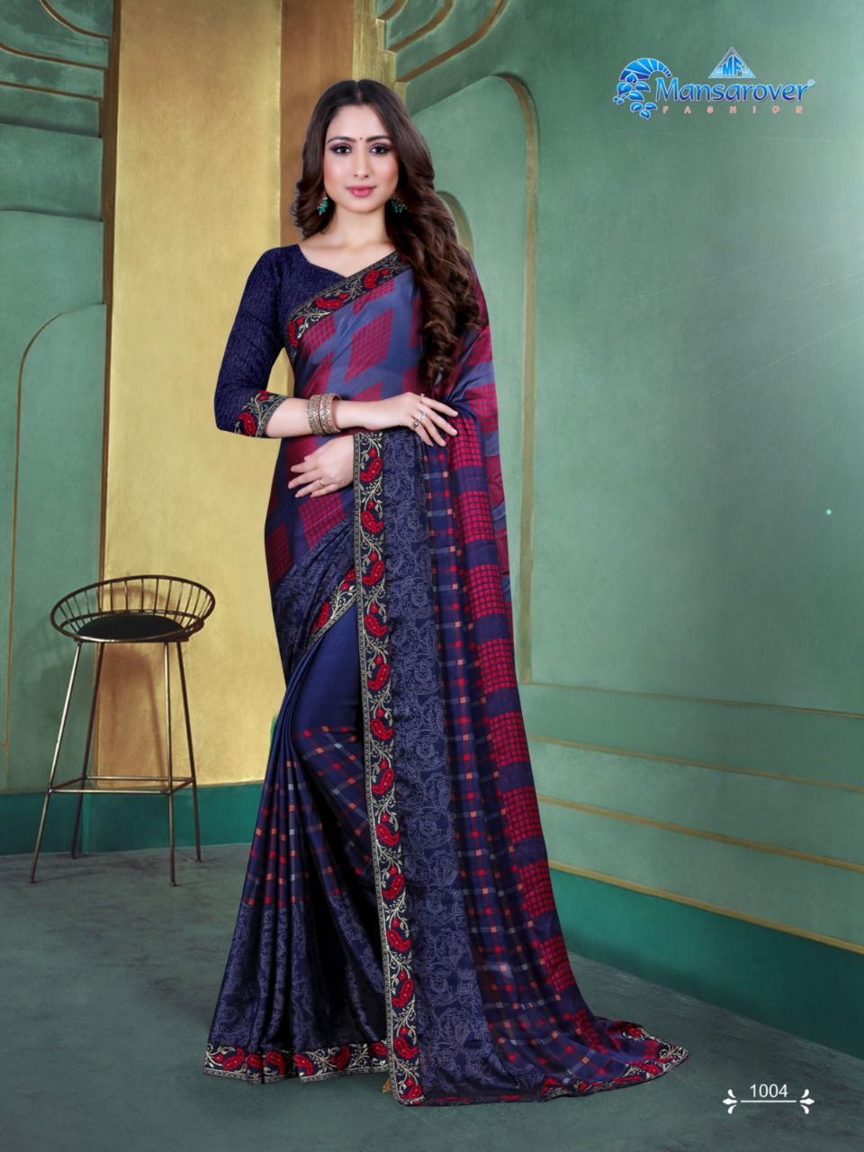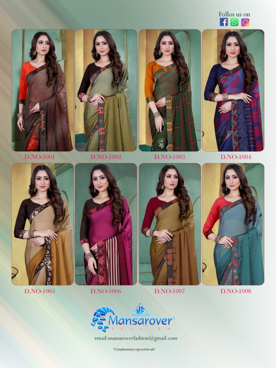 KARUNA Brand:- MANSAROVER FASHION Rate:- 525/- _Fabric:- BLACK MOSS CHIFFON PRINT WITH EXCLUSIVE MAHARANI BODER Total Designs:- 08 _Packing pcs :- set to set Matching :- SINGLE COLOR Cut :- WITH BLOUSE Delivery from today |