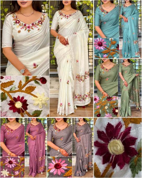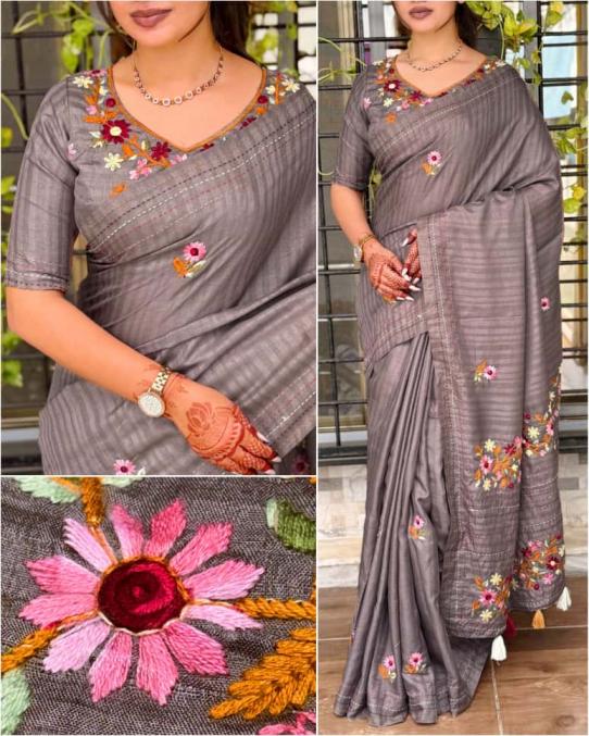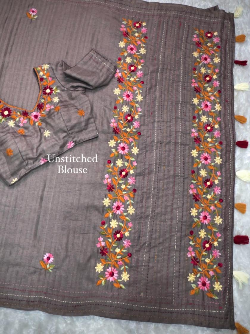 Design-kashmiri Wrapped in the poetry of heritage, this tusser cotton saree is where tradition meets pure grandeur. The rich tusser saree glows with fine thread kashmiri style Embroidery Fabric- SIZE- Pattern- Notice Saree embroidery is made from pure cotton thread, so, normal thread snag is common in saree embroidery. RATE : 1500/- +GST |