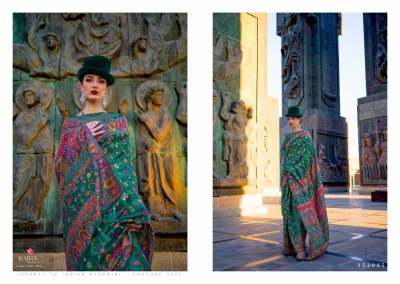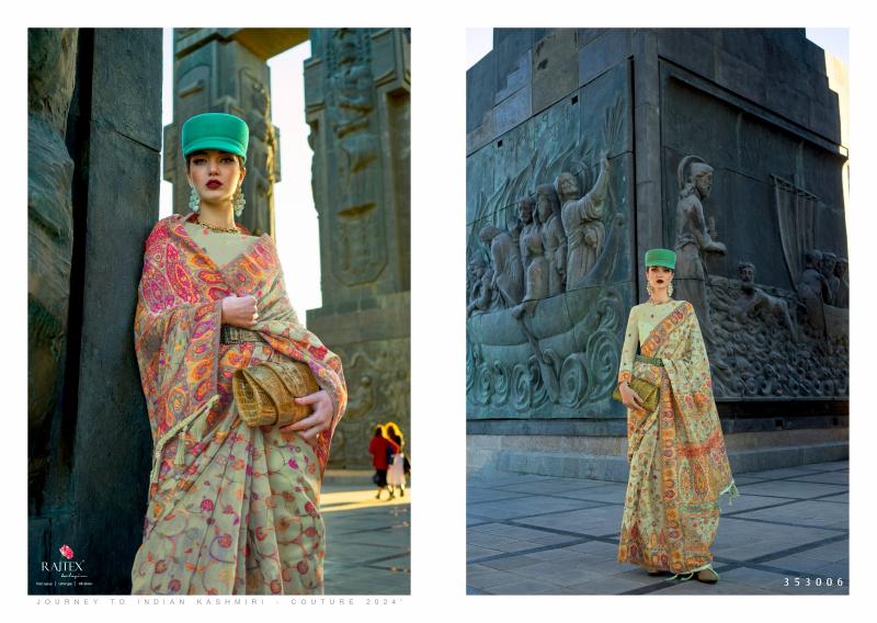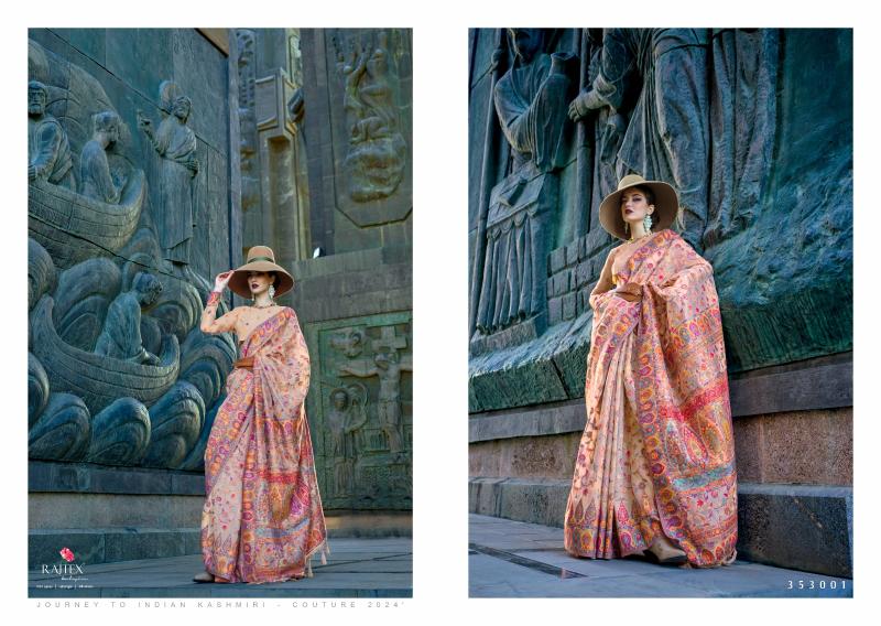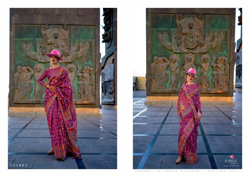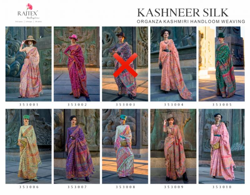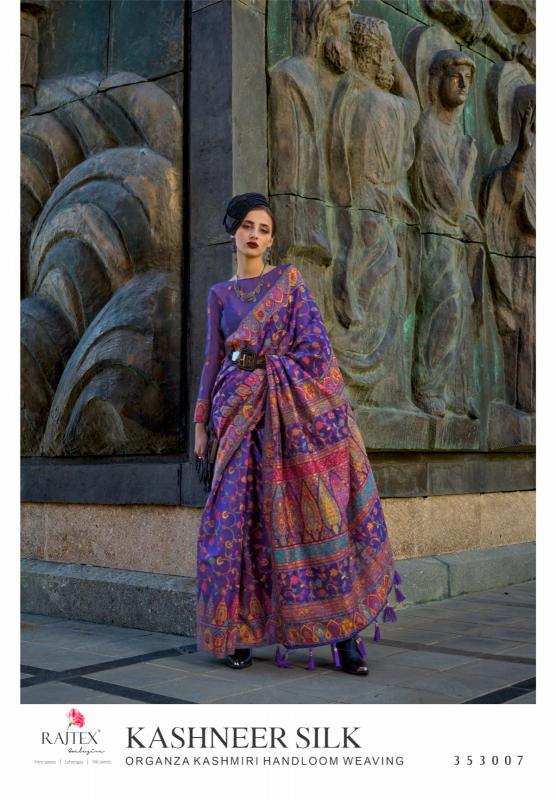 Experience a grand feel with this majestic Kashmiri Pashmina Organza Silk Saree. Fused with the softest pashmina silk fabric, this spectacular saree has its embellished designs interwoven through its border that exude a luxurious aura. Create an unforgettable look that will be treasured when you drape this masterpiece for every special occasion. Brand Name: Rajtex Fabrics Series: 353001 To 353010 Price: 2050 +5%Gst Saree Fabric: Kashmiri Pashmina Organza With Handloom Weaving Blouse: Kashmiri Pashmina Organza Silk Occasion: Festival Wear,Party Wear |