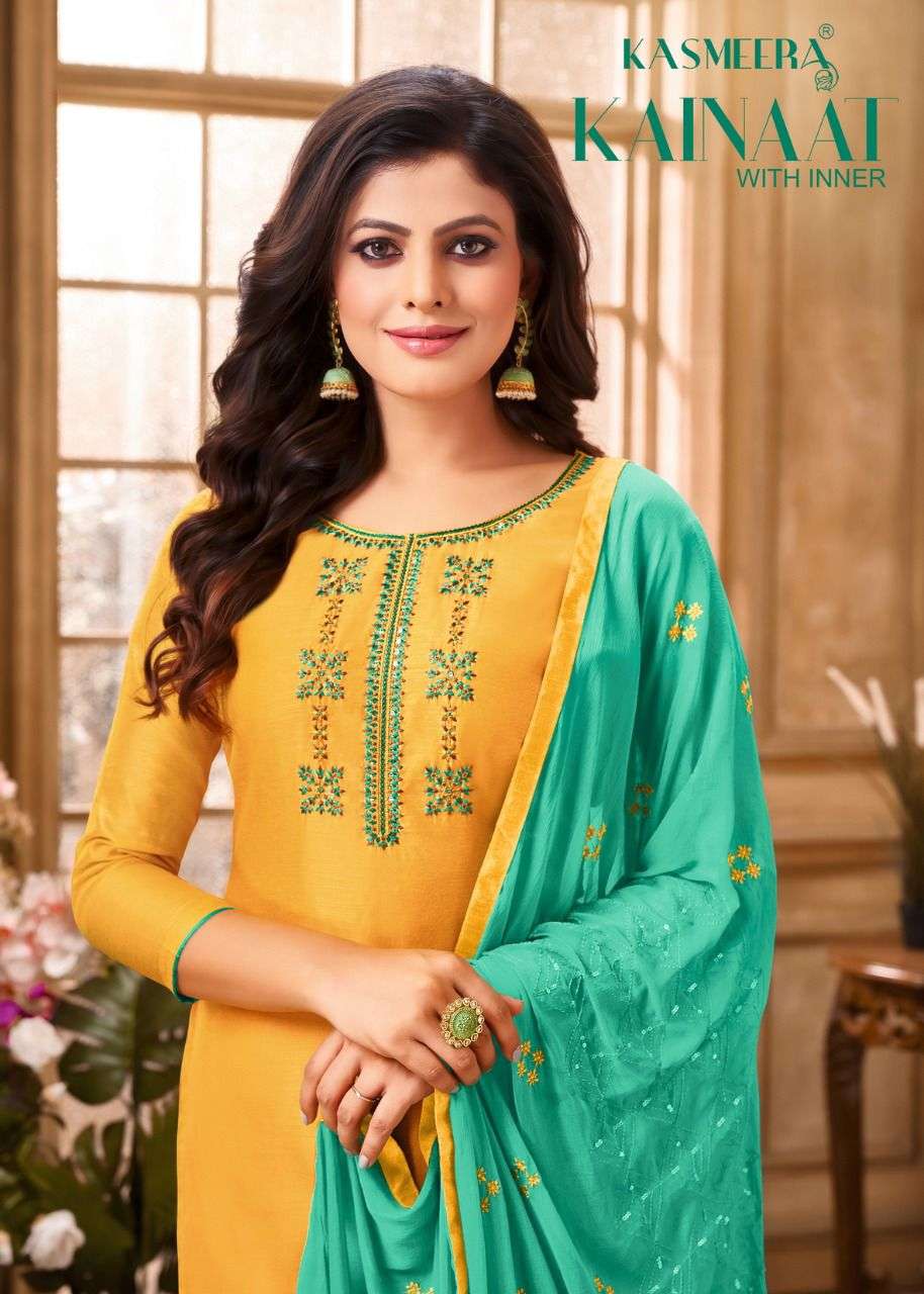 👗KASMEERA👗 ————KAINAAT———. Top 👗 - MODAL SILK WITH EMBROIDERY WORK (with innar)(2.5 mtr) Bottom👖 - SOILD COTTON (2 mtr) Dupatta 🏳️🌈 - NAZMIN DUPATTA WITH EMBROIDERY (2.25) INNER:- cotton