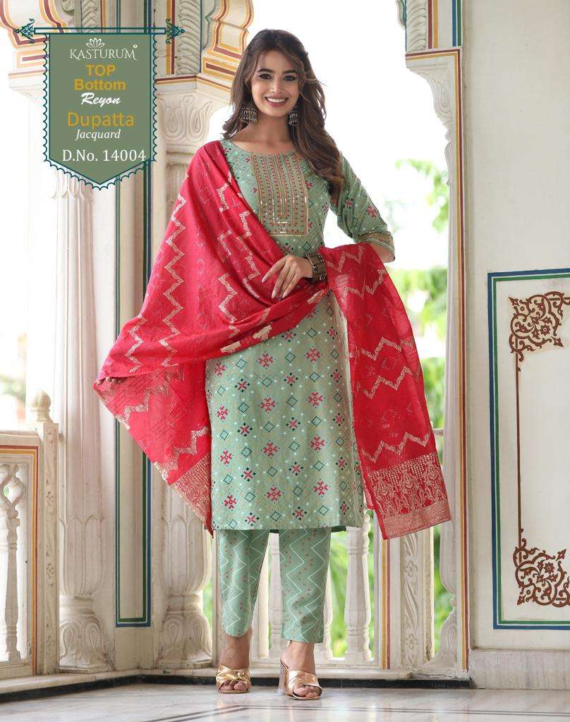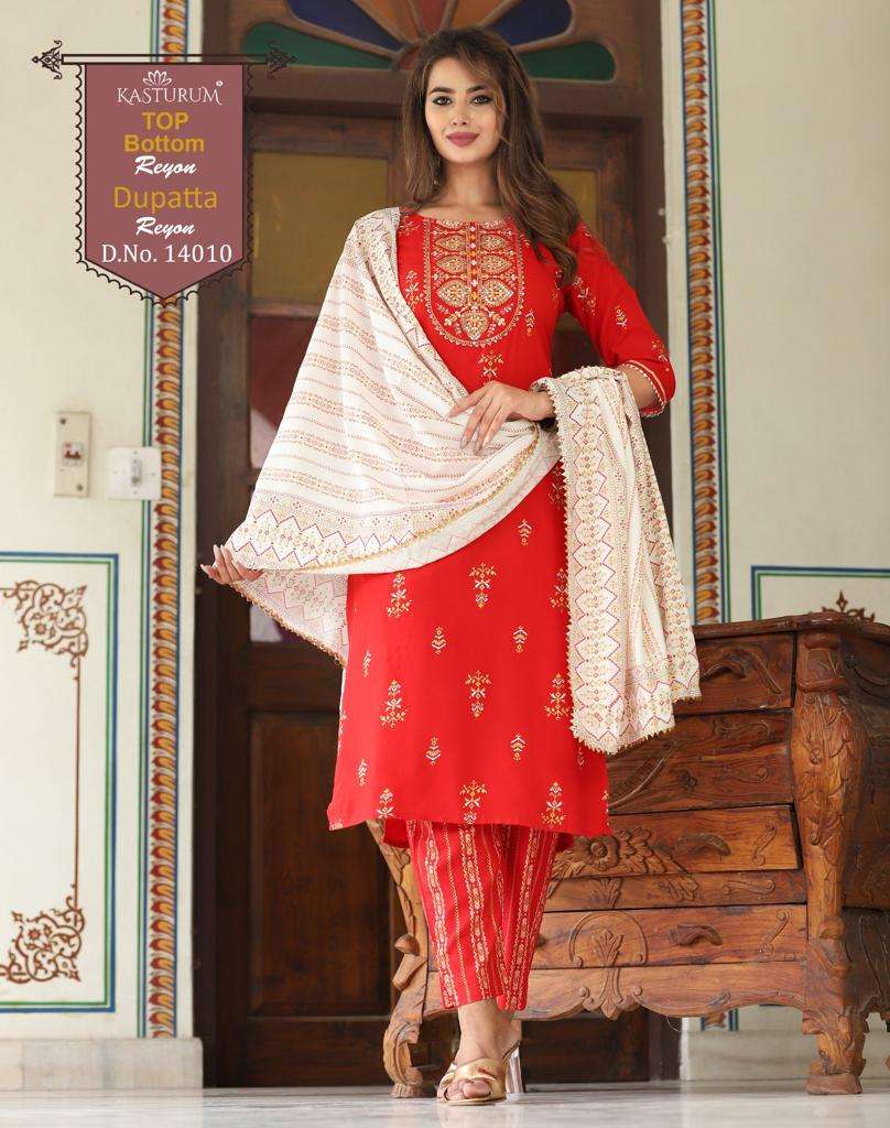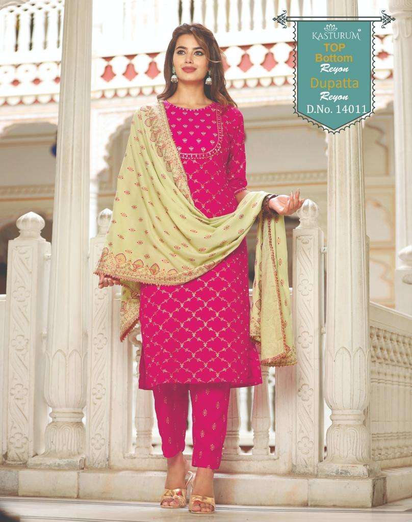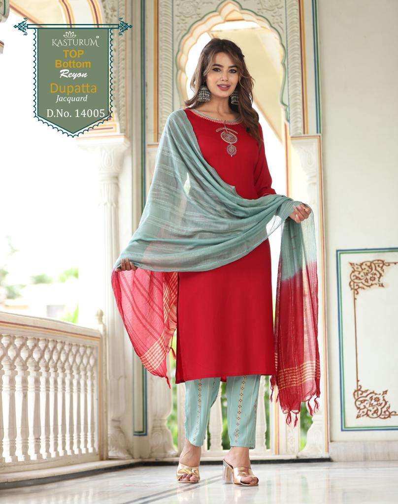 kasturum 14004-140012 readymade rayon kurti with pant and chanderi dupatta combo set