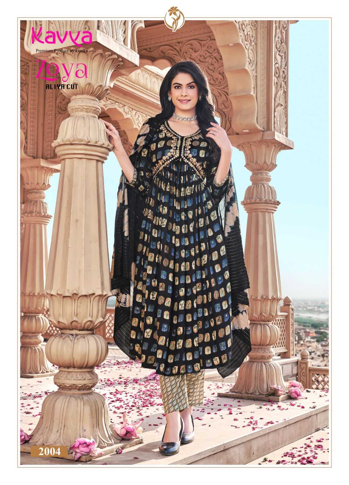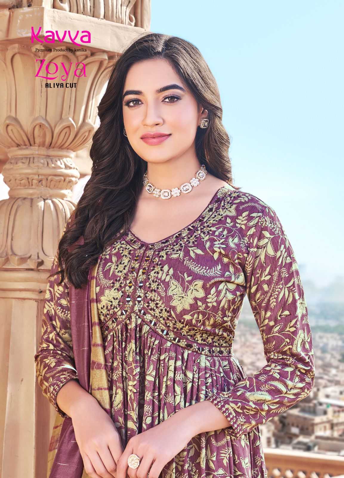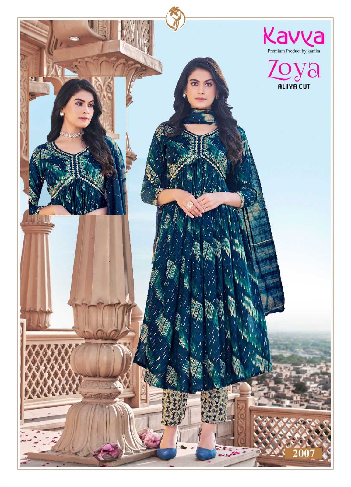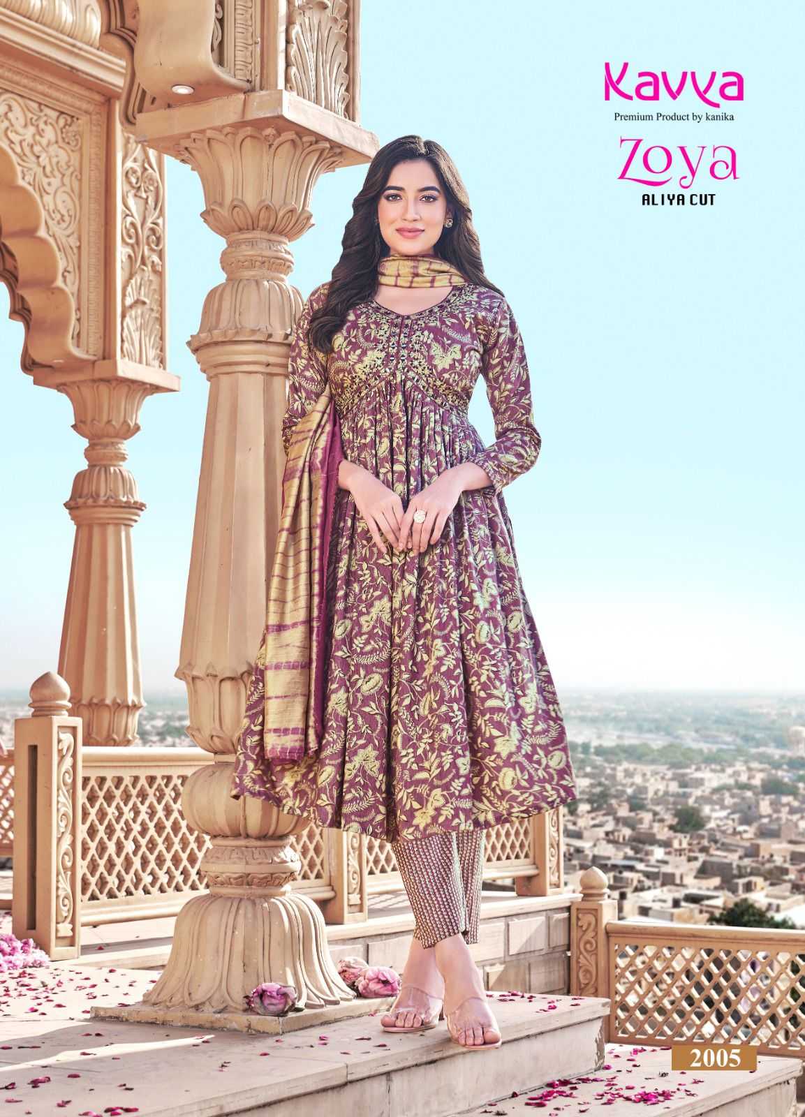 Launching new catalouge KAVYA ZOYA VOL 2 STYLE * : ALIYA CUT FABRIC : Premium quality Rayon foil print top and Rayon print bottom with chanderi cotton dupatta Top : Embrodiery on top with 46 inch height bottom : comfort fit premium quality stiched pants Size :- M TO 3XL |