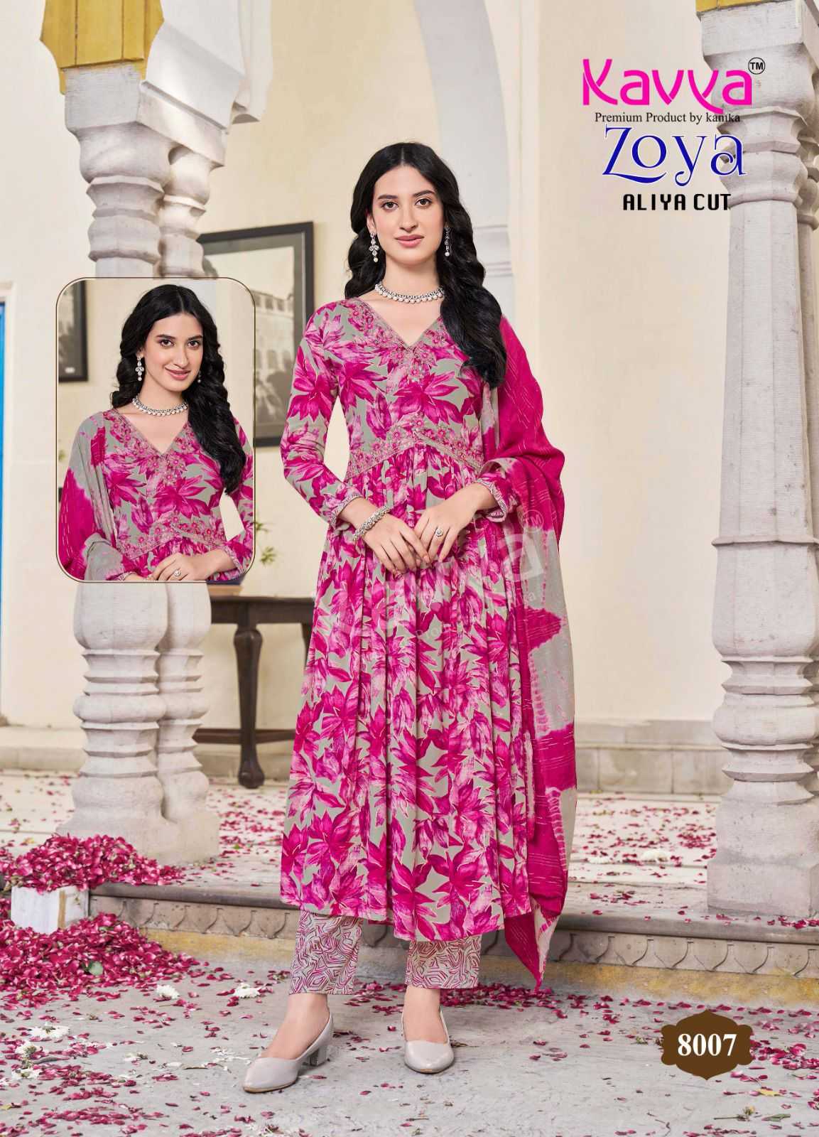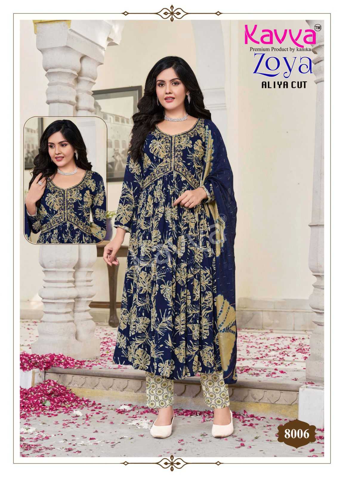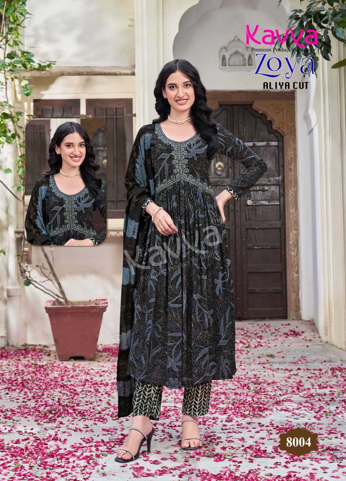 kavya zoya vol 8 readymade aliya cut rayon print stylish 3pcs suit