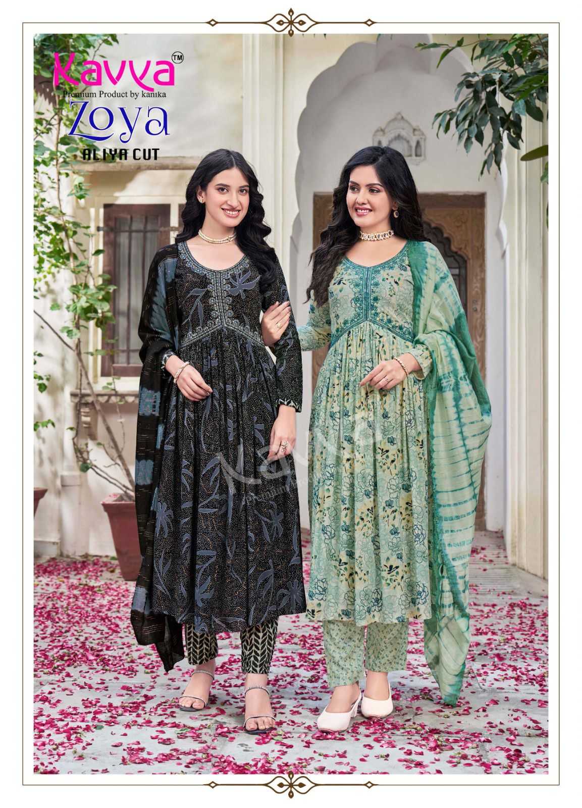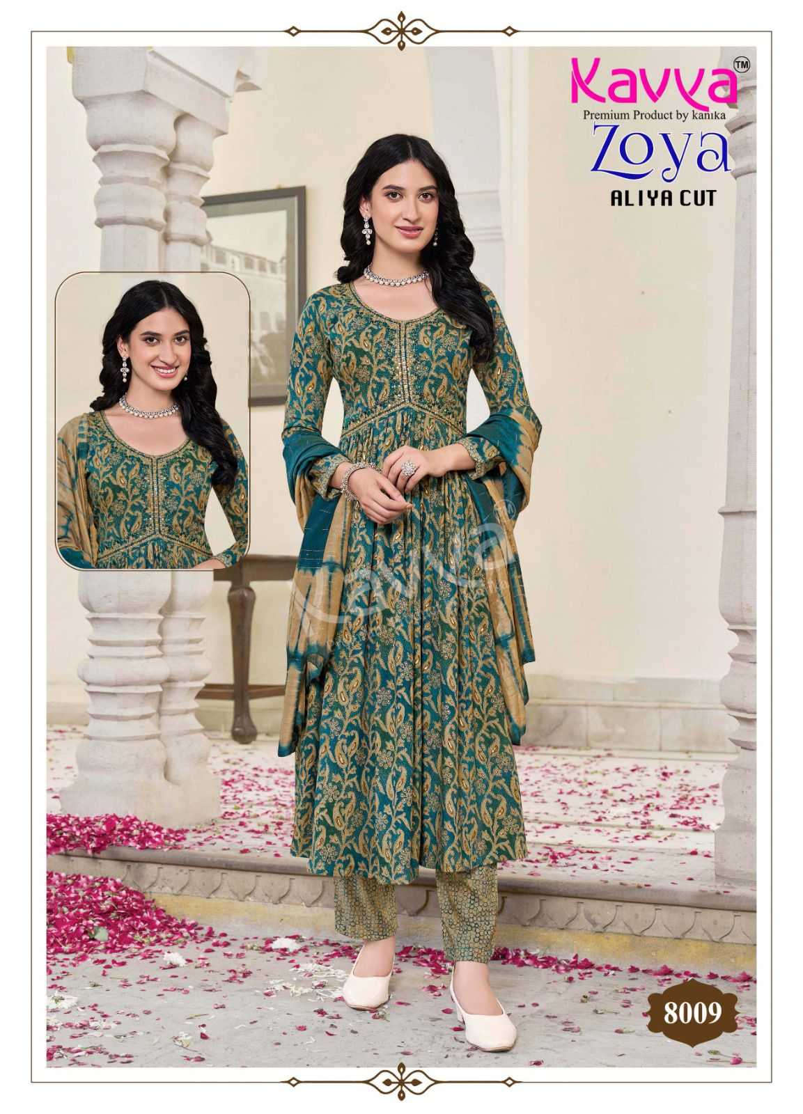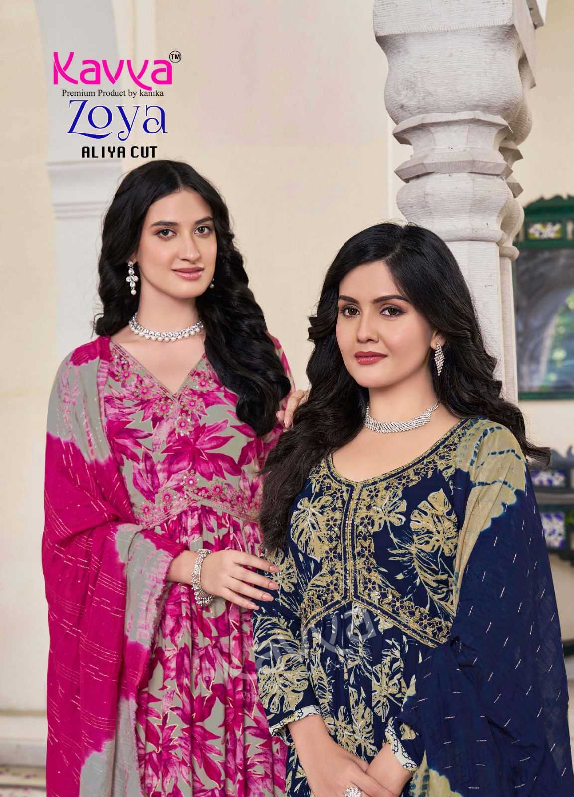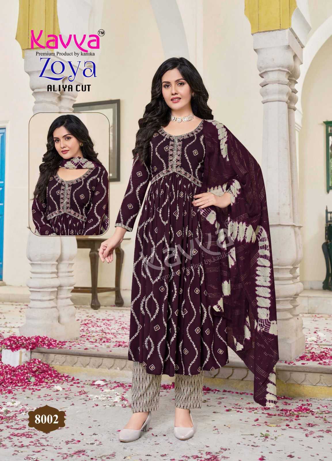 kavya zoya vol 8 readymade aliya cut rayon print stylish 3pcs suit