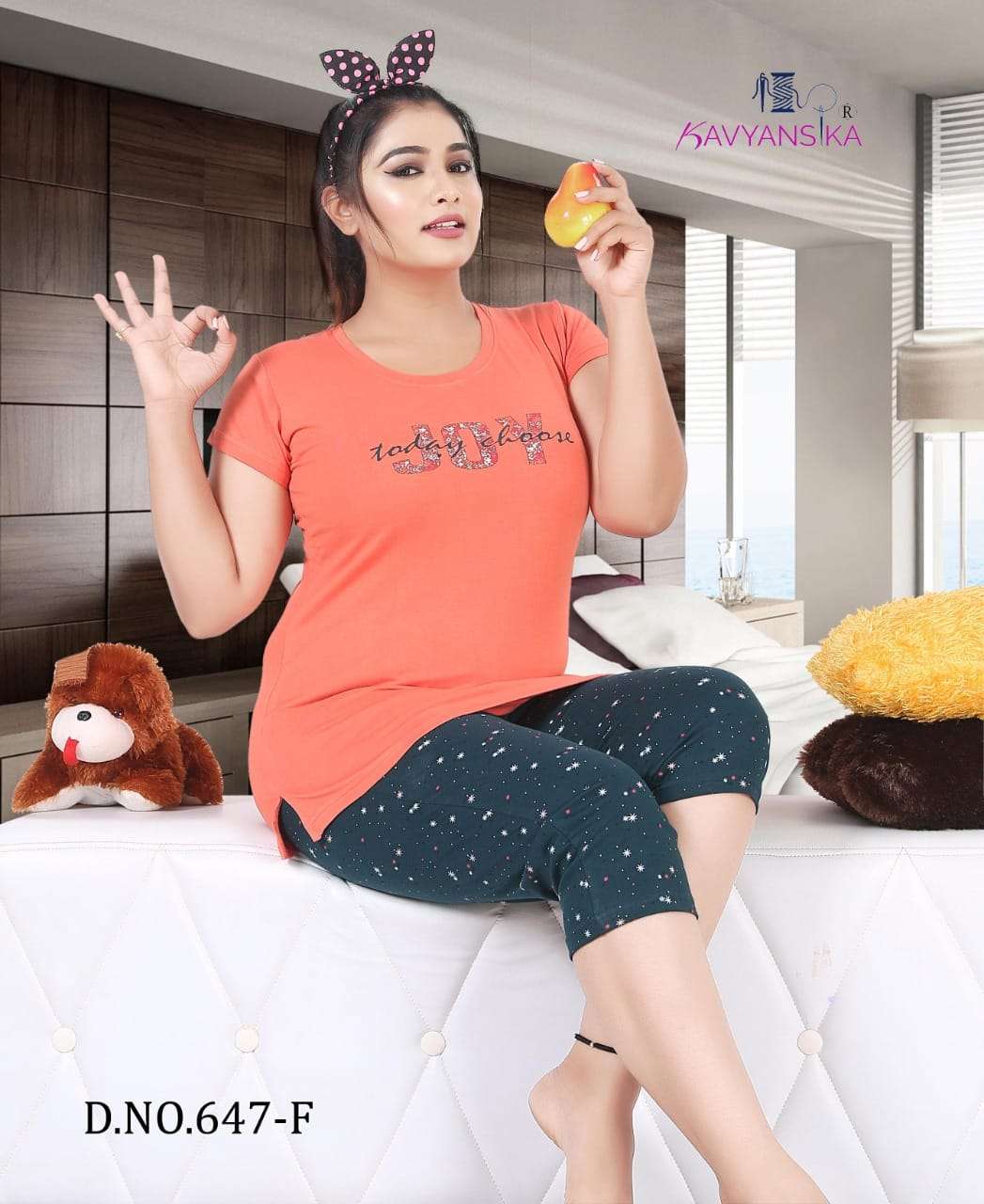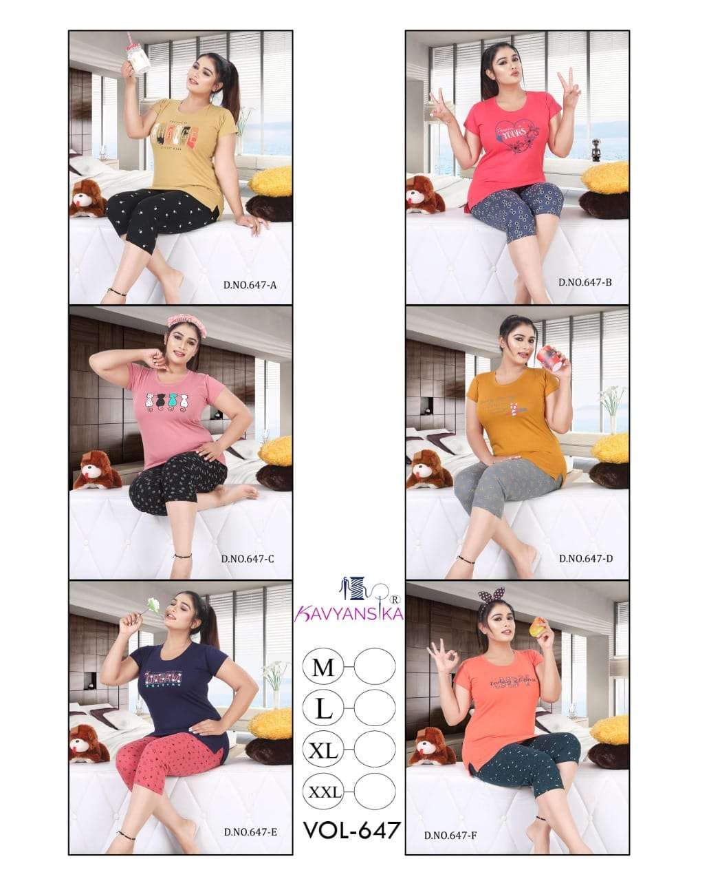 "Catalog Name: Hosiery Vol 647 Brand name: Kavyansika Type: Capri Night Suits Fabric Detail: Premium Hosiery Cotton Night Suit Size and Rate M 370 L 380 Xl 390 Xxl 400 Set to set .. No of pcs: 6 Gst: 5 % |