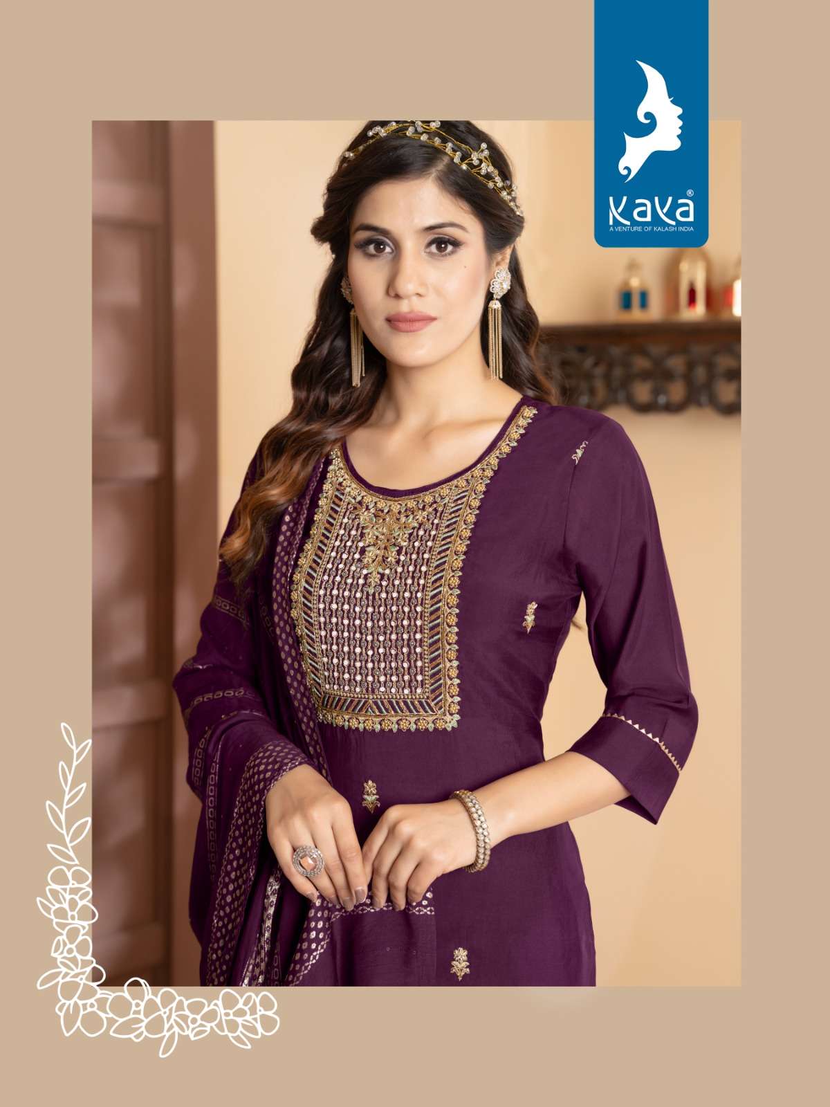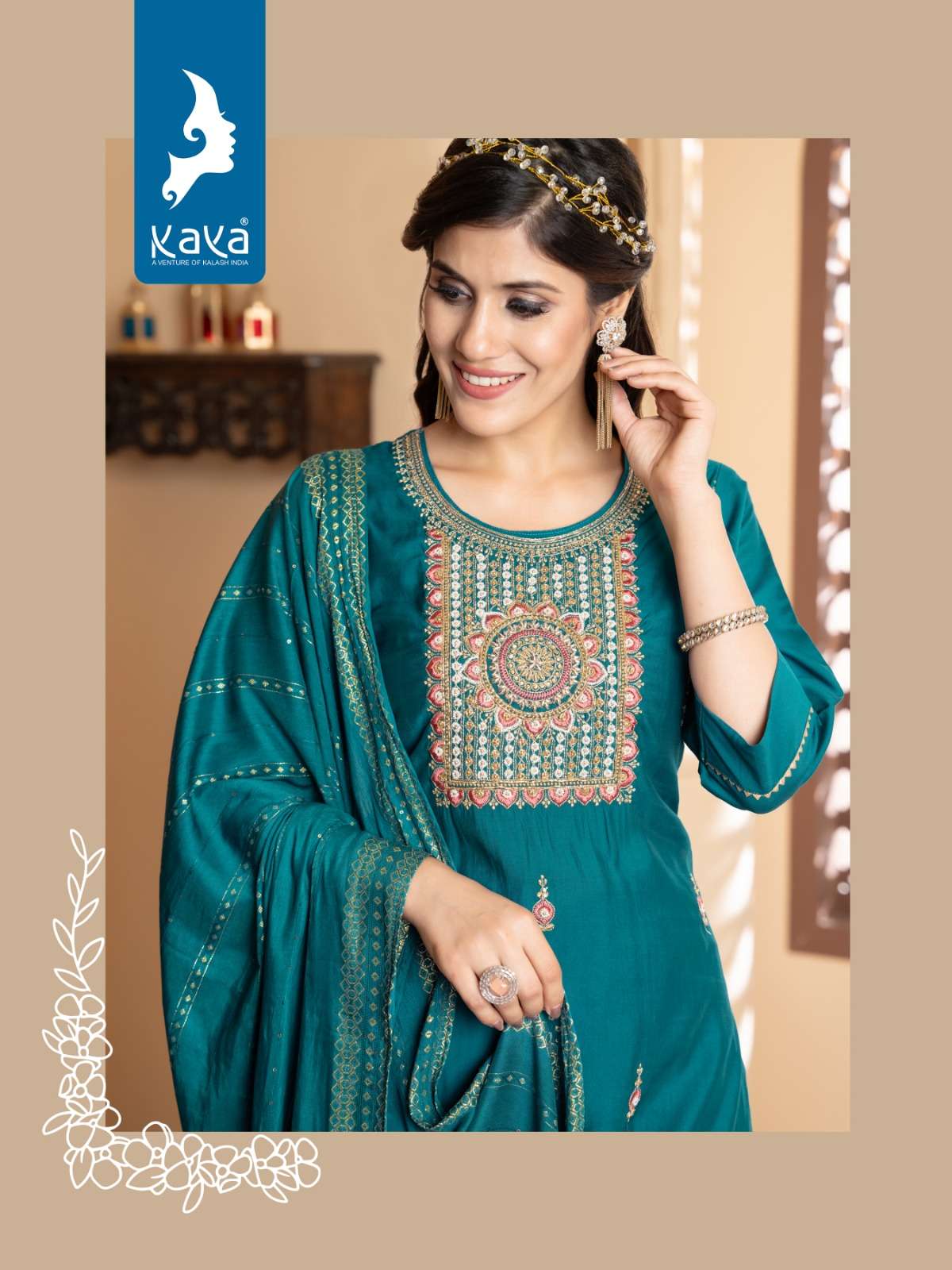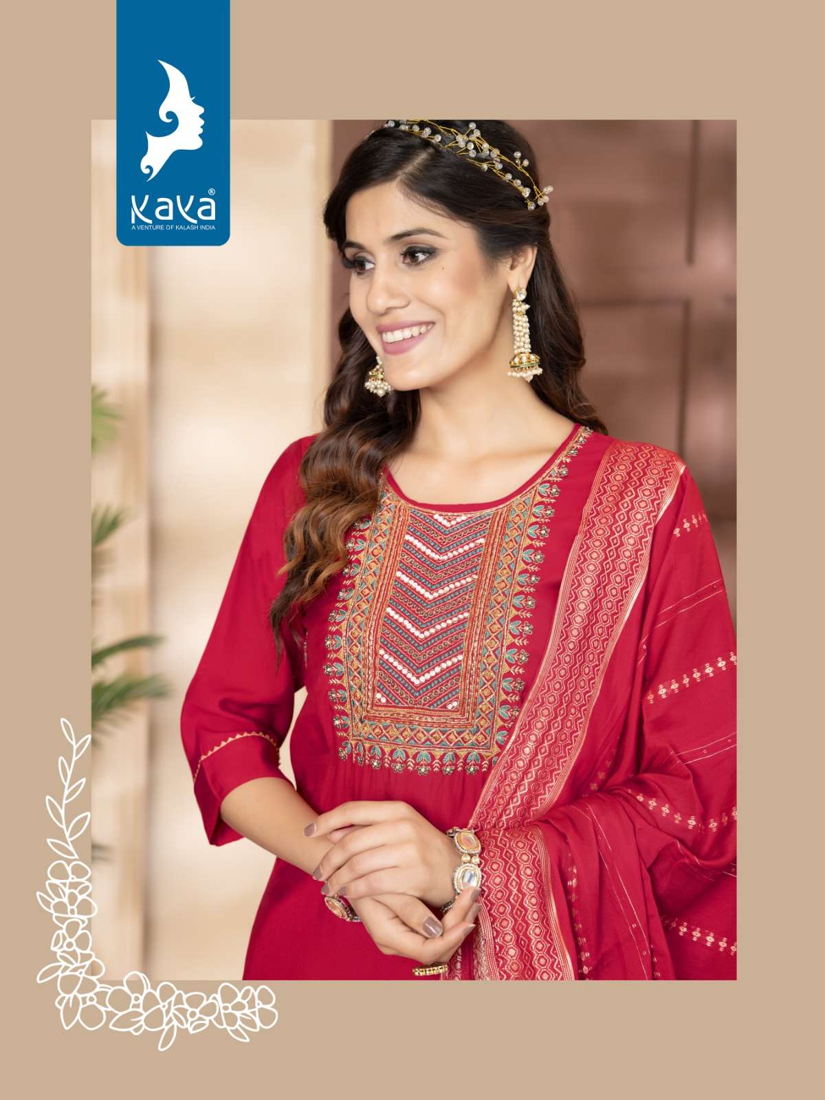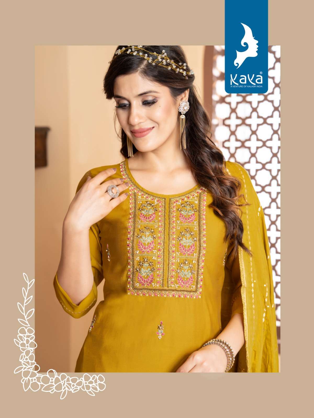 kaya present juhi fancy work straight kurti with pant and dupatta catalog