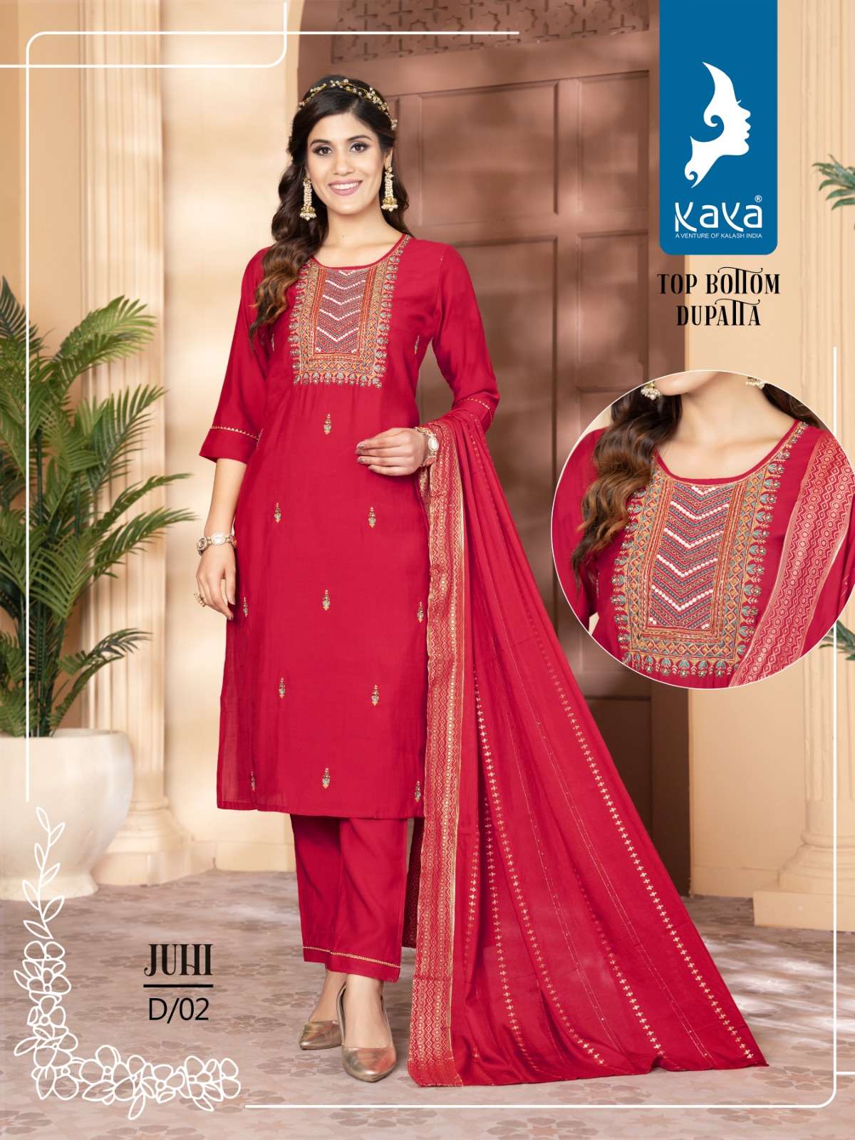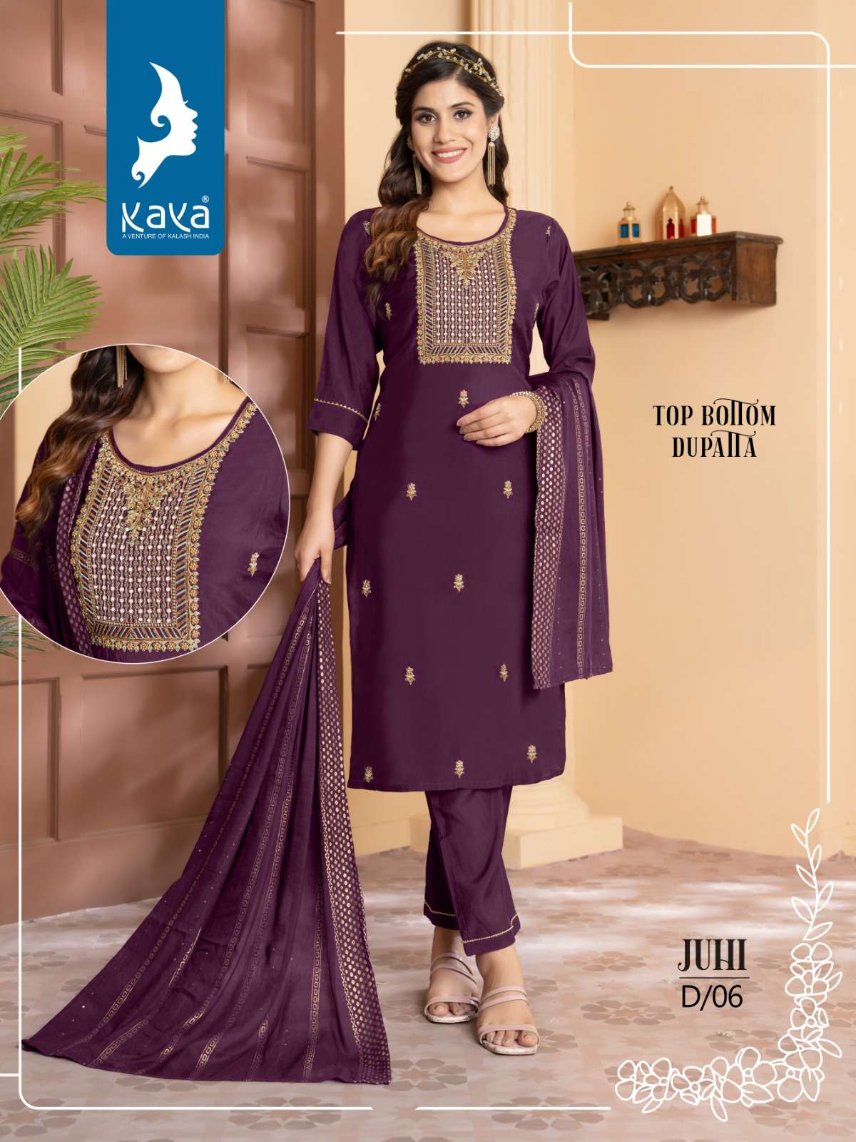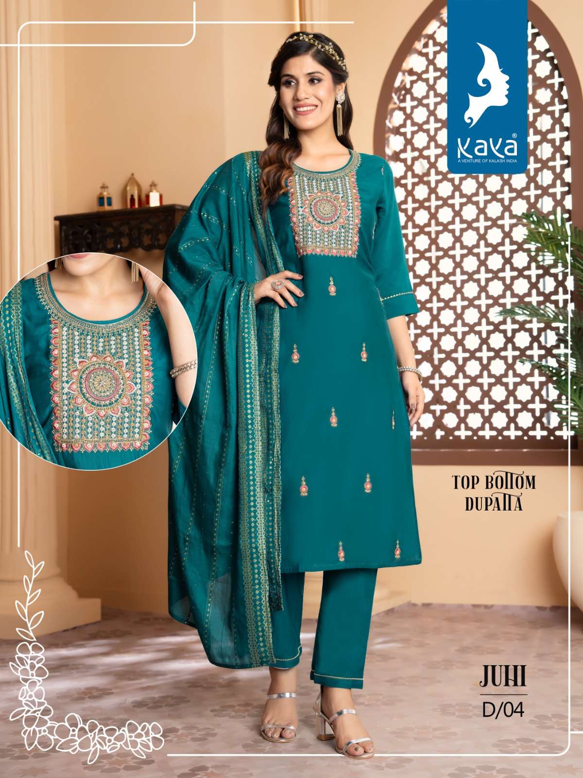 kaya present juhi fancy work straight kurti with pant and dupatta catalog