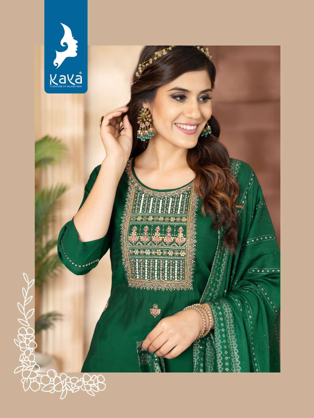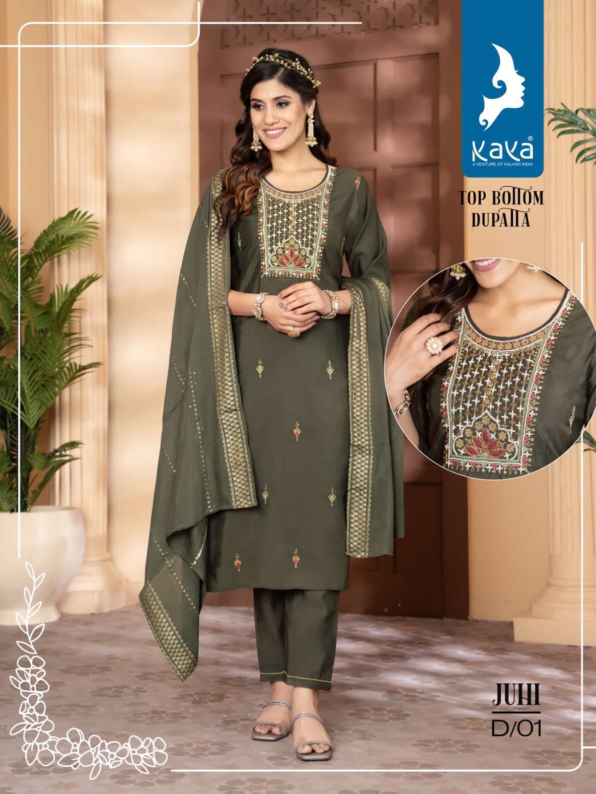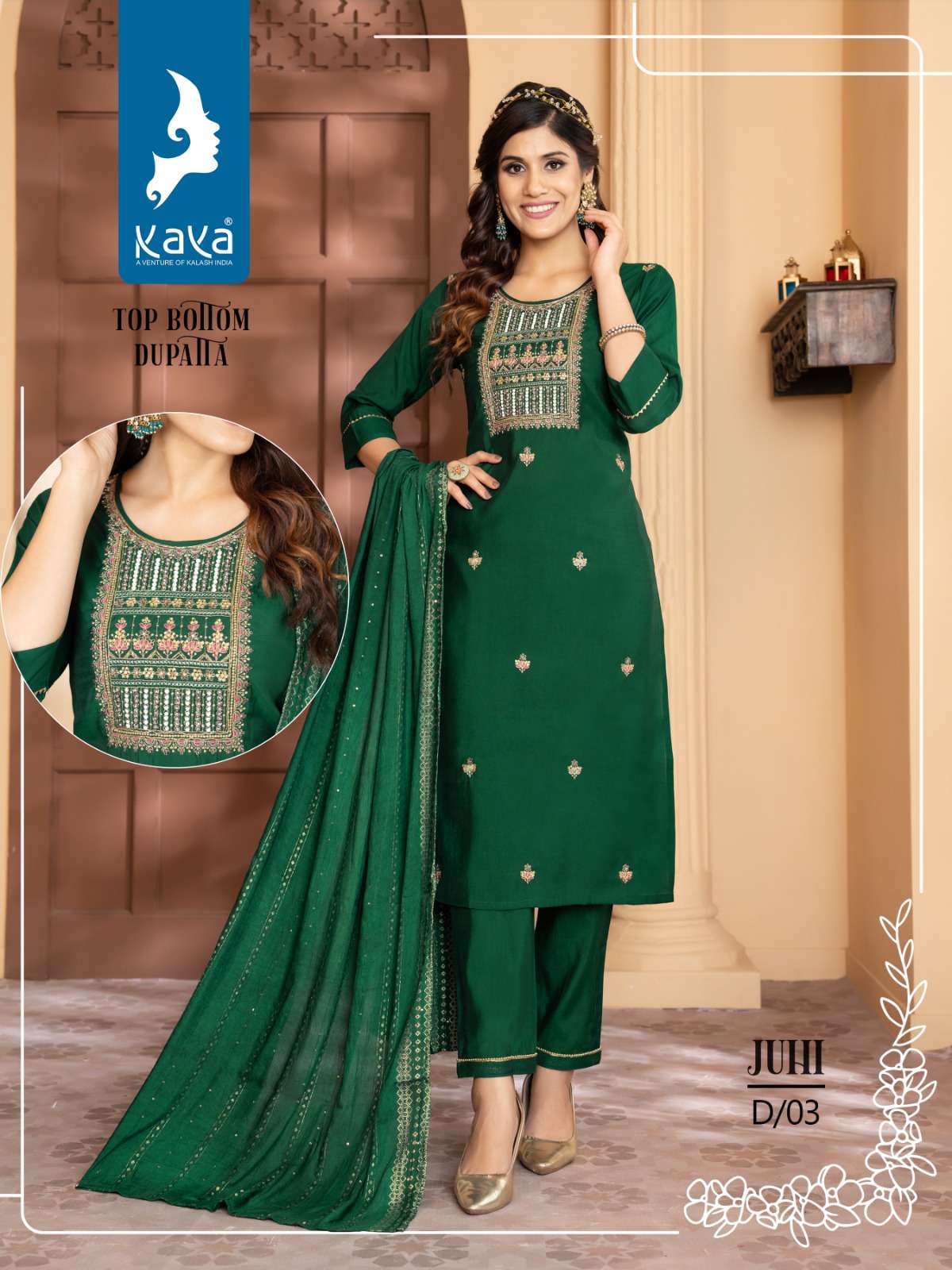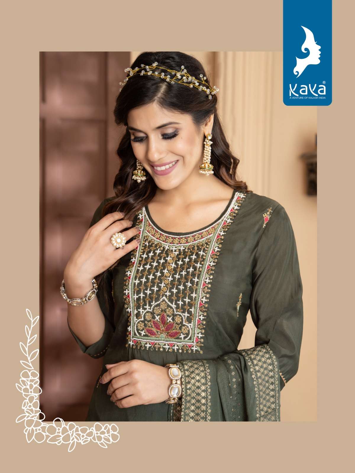kaya present juhi fancy work straight kurti with pant and dupatta catalog