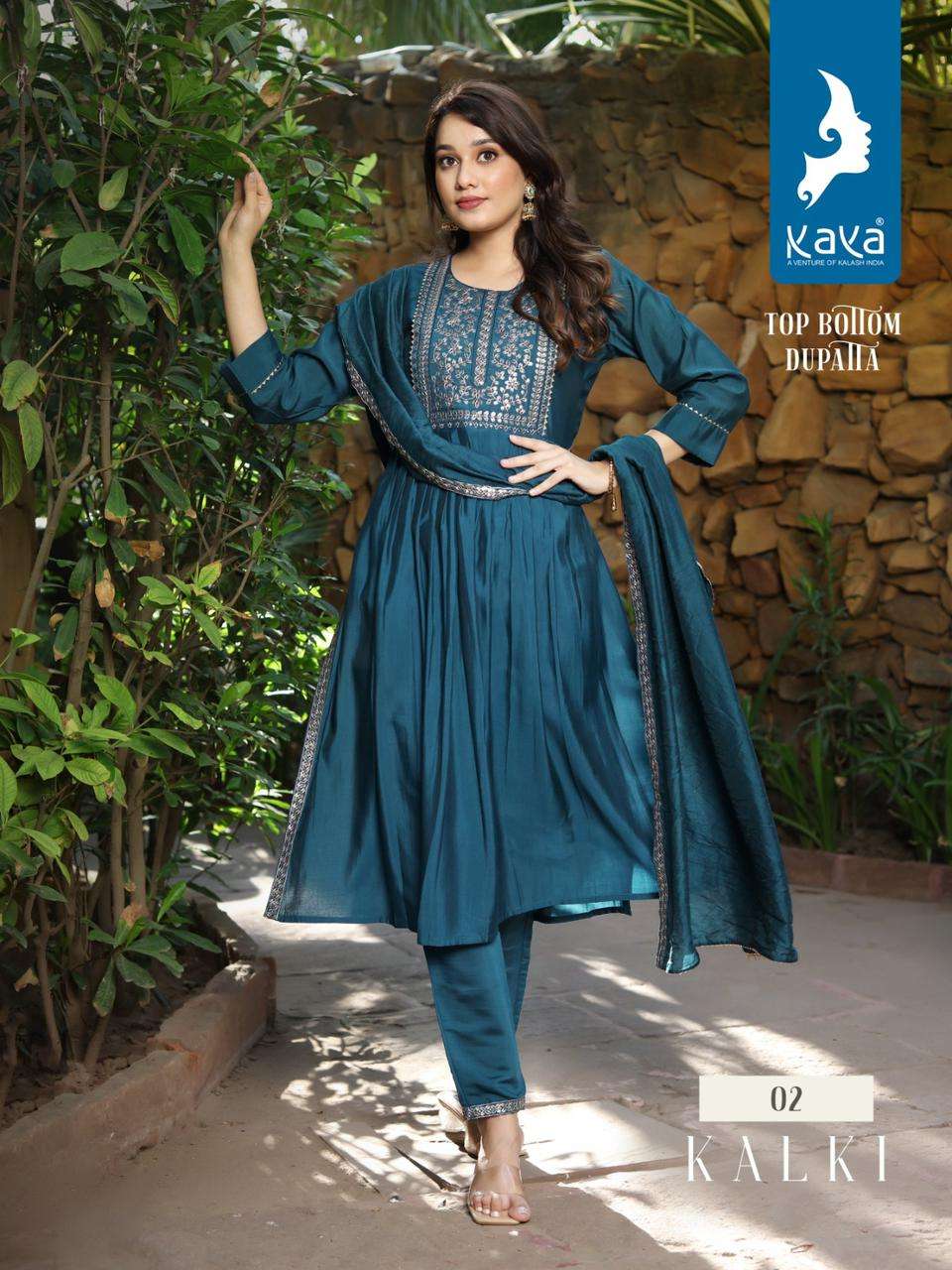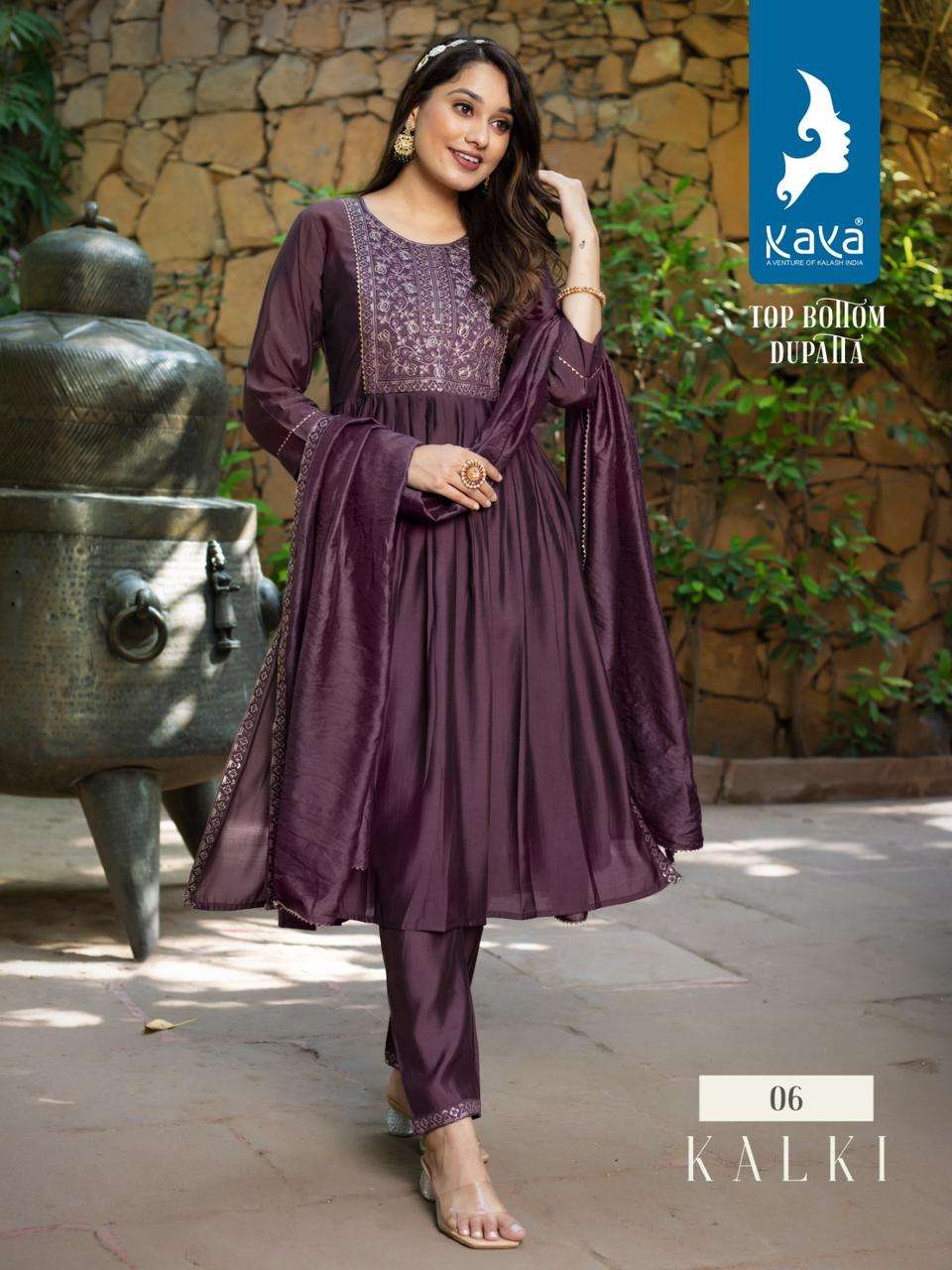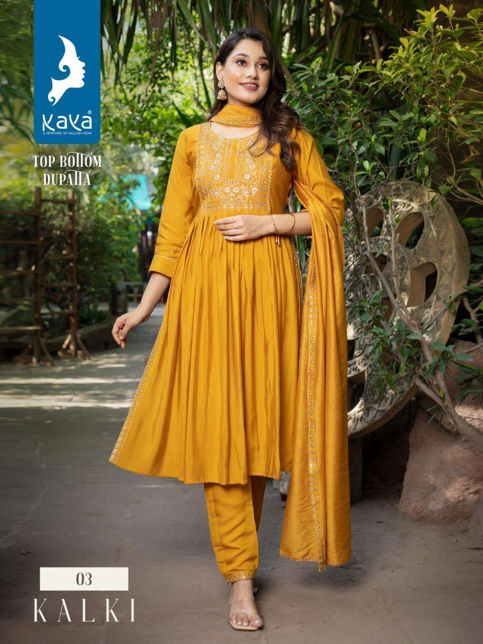 kaya present kalki fancy 3pcs set best designs colours nayra cut kurti with pant and work dupatta