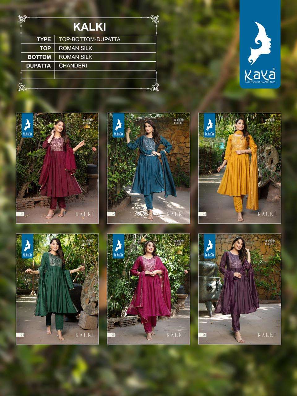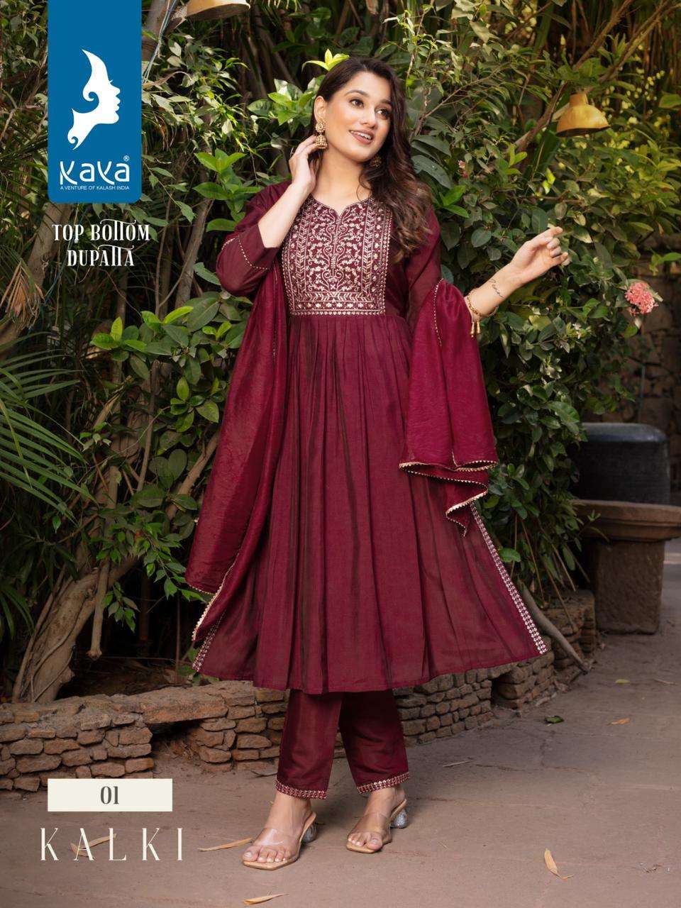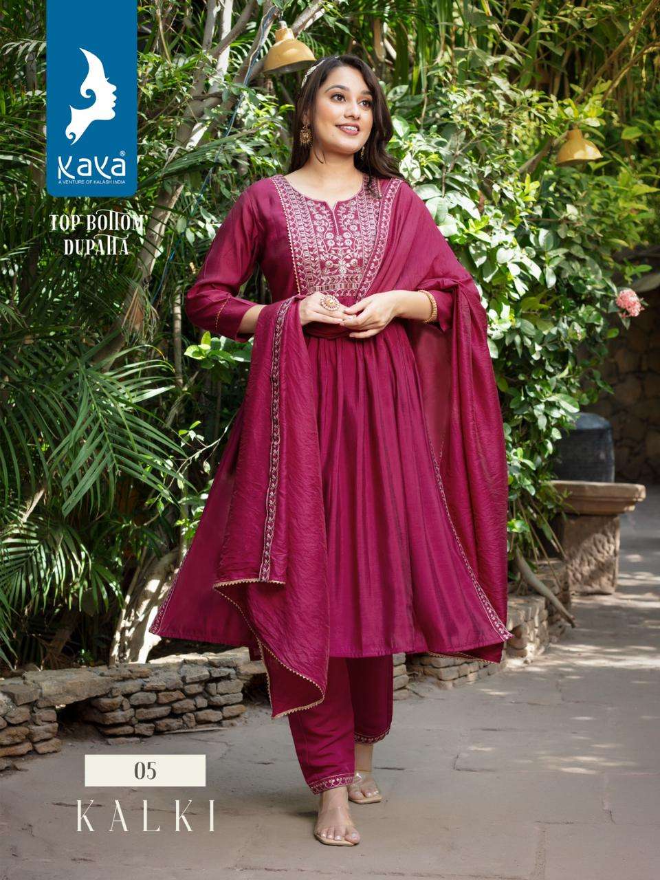 kaya present kalki fancy 3pcs set best designs colours nayra cut kurti with pant and work dupatta