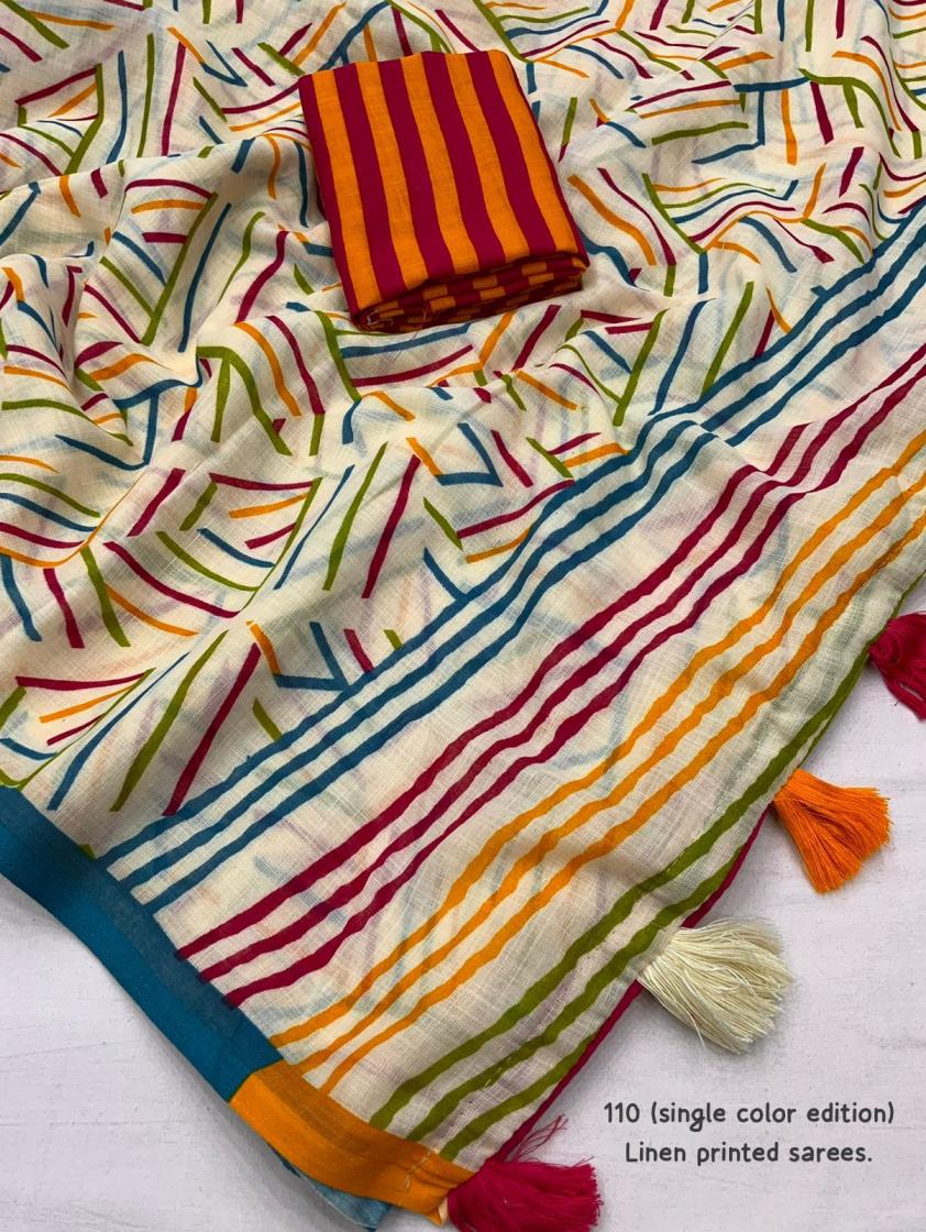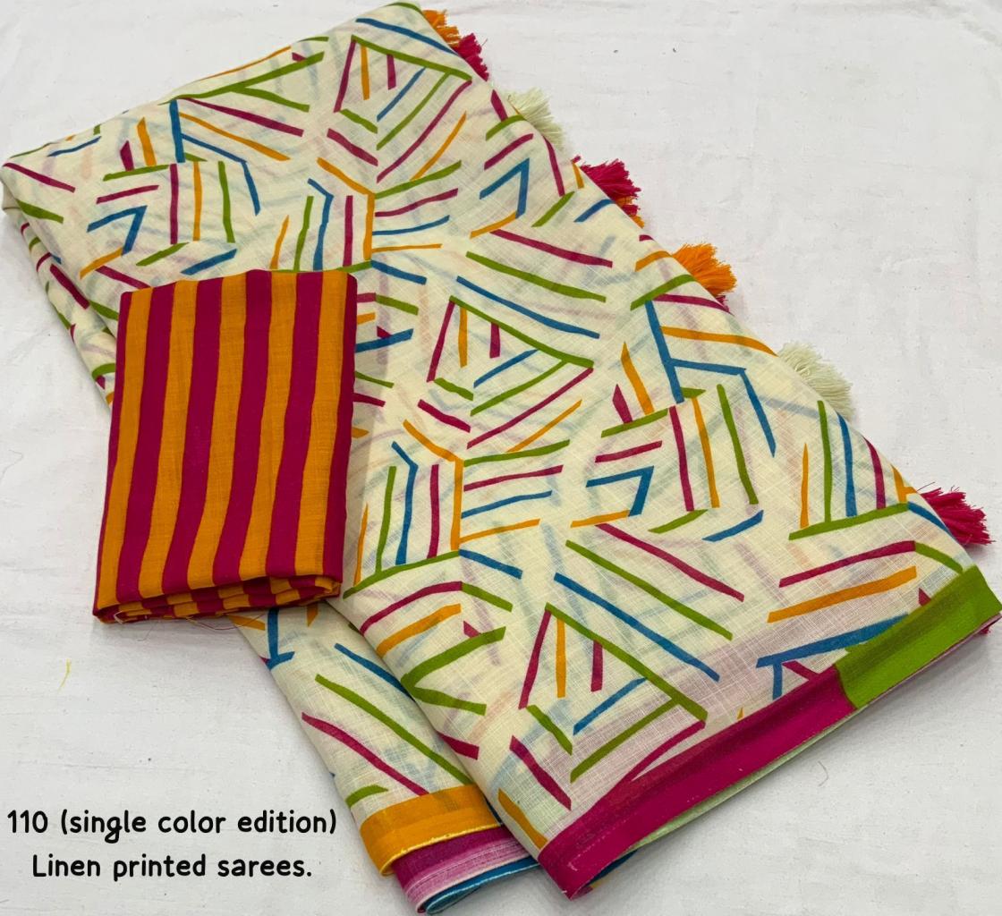 new arrivals new single color editiom in preimum linen KC - colorful linen Quality- soft linen saree with geometric sticks design allover. Cotton tassles on pallu. Blouse- runing linen contrast stripe blouse. Rate - 570+ship Top trusted quality |