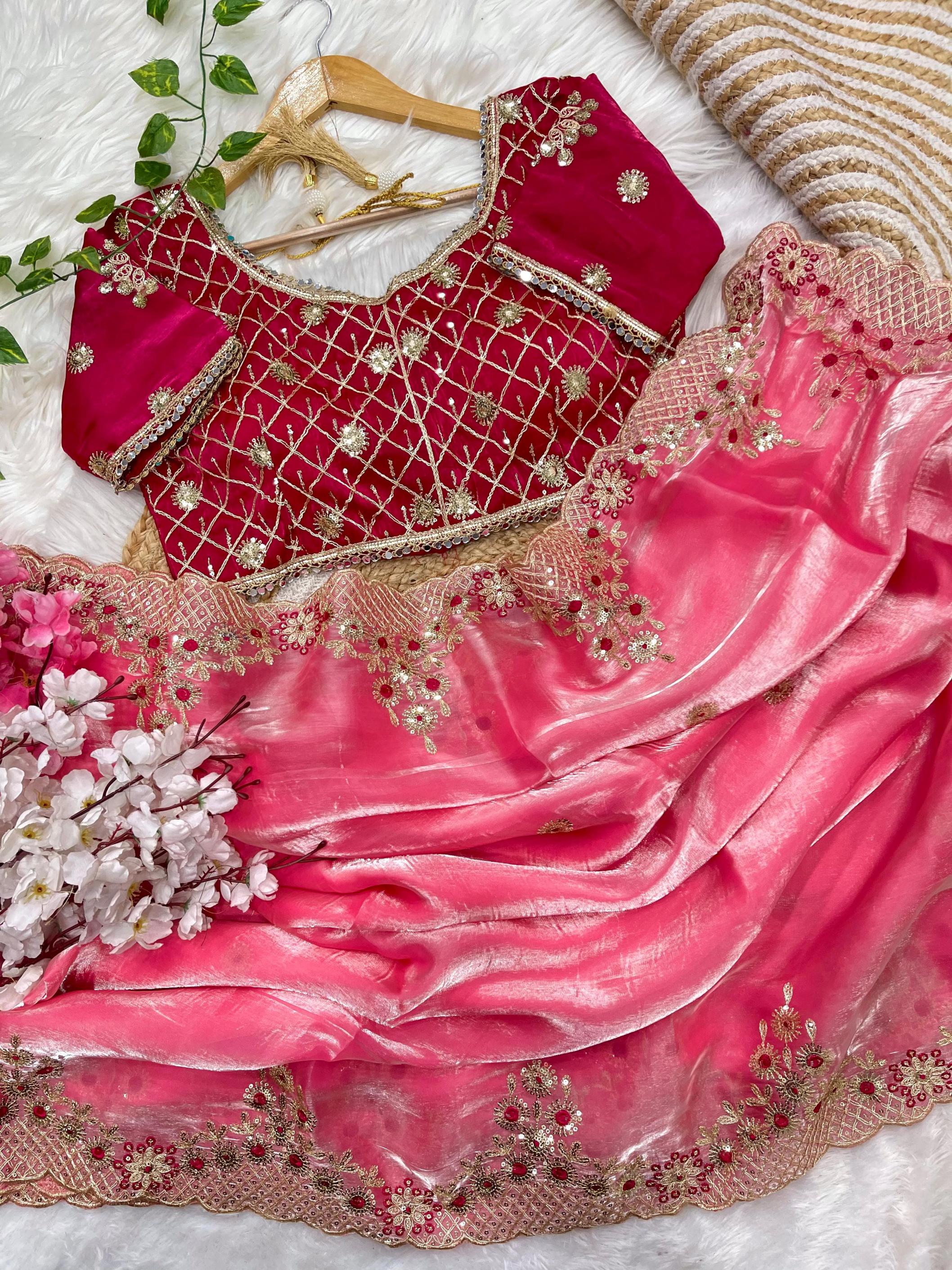 A Fresh New Article 😍 A very soft nd elegant fendy sartin fabric saree with beautiful 3 mm sequence embroidery work border with work buttis in all over saree nd contrast aarco. Paired with fully stiched cording embroidery sequence work blouse with mirror lace touch up nd fancy latkan on running fabric 🎉 Amazing 4 Colours 🎉 At Just ₹1499/- ❣️ |