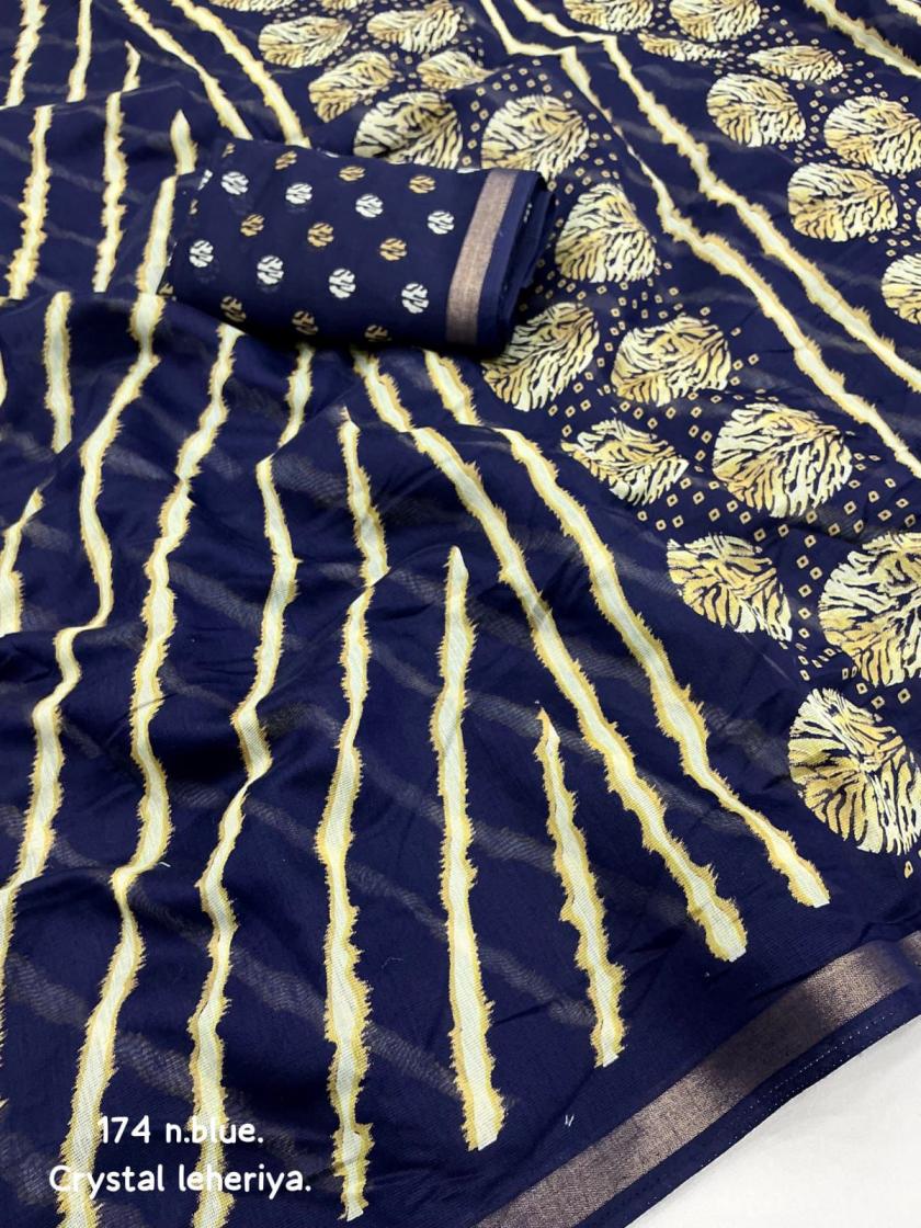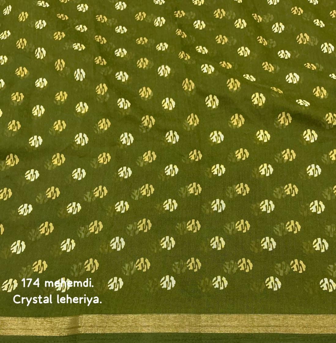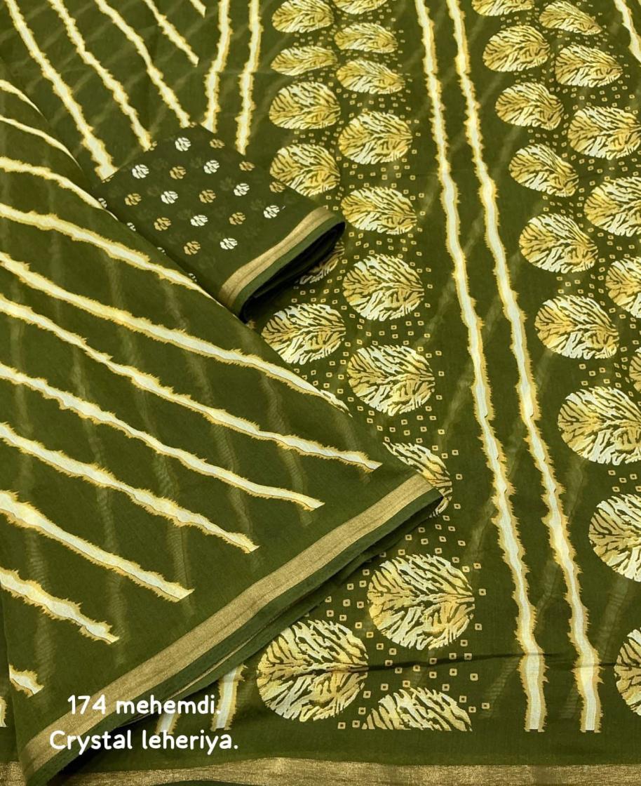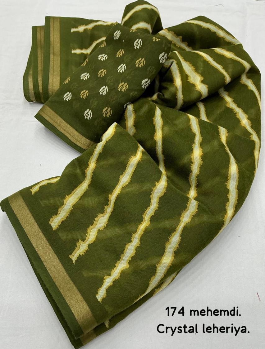 new arrivals New cotton style leheriya saree KC - 174 KC - crystal leheriya. Quality- soft cotton feel saree light weight with zari woven pattu. Leheriya prints. Blouse- seperately printed running blouse. Rate - 450+ahip Top trusted quality |