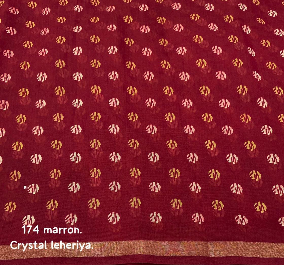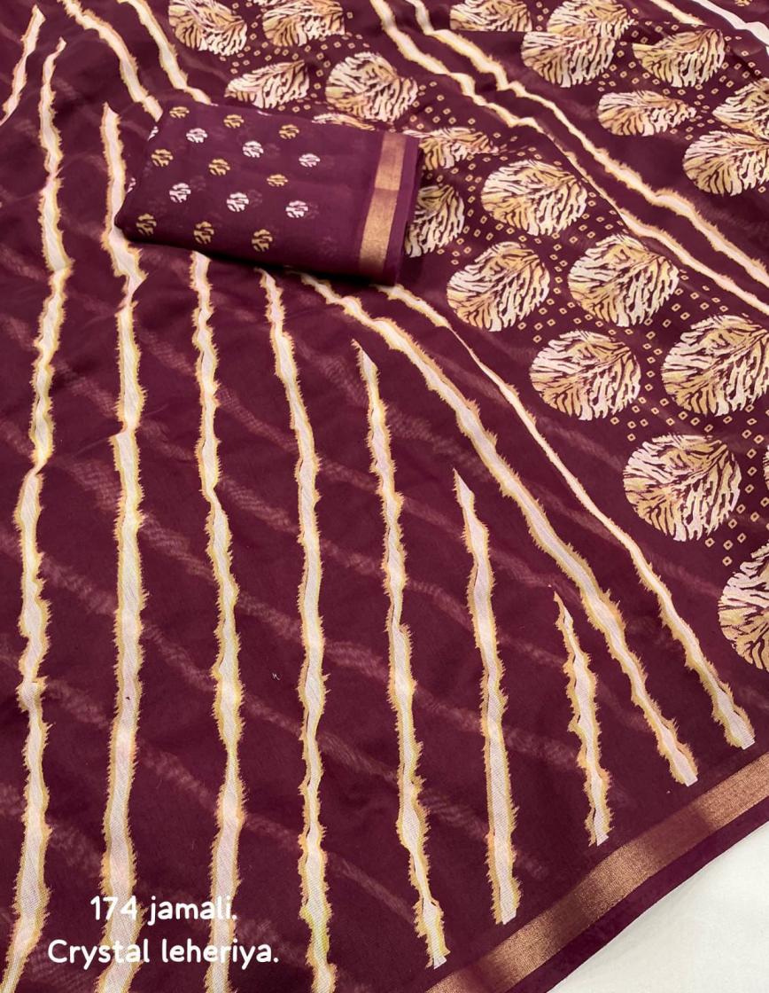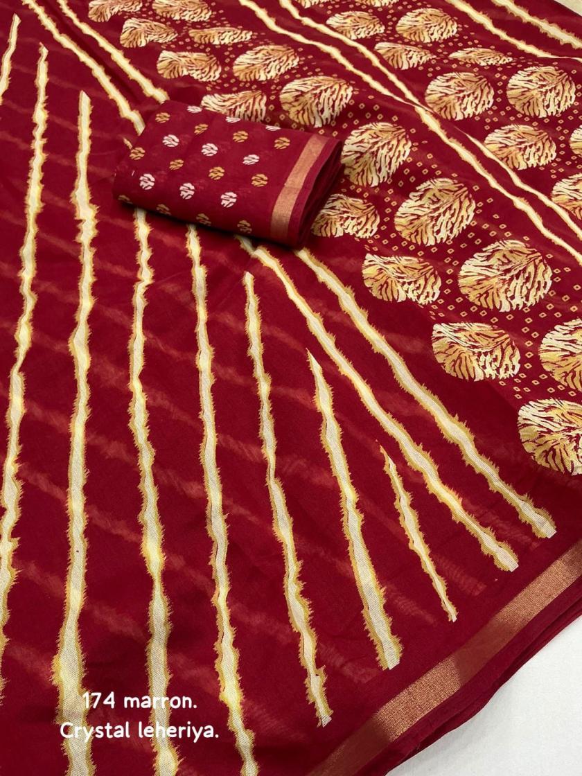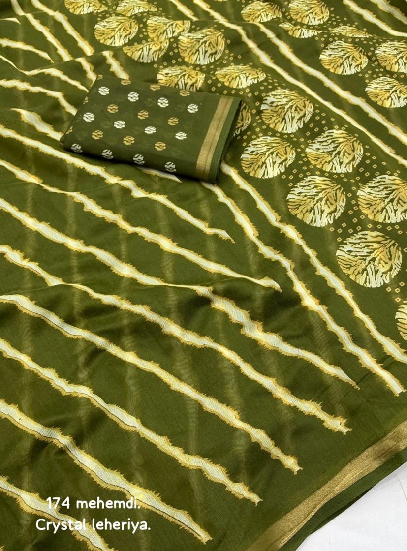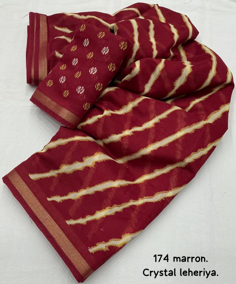 new arrivals New cotton style leheriya saree KC - 174 KC - crystal leheriya. Quality- soft cotton feel saree light weight with zari woven pattu. Leheriya prints. Blouse- seperately printed running blouse. Rate - 450+ahip Top trusted quality |