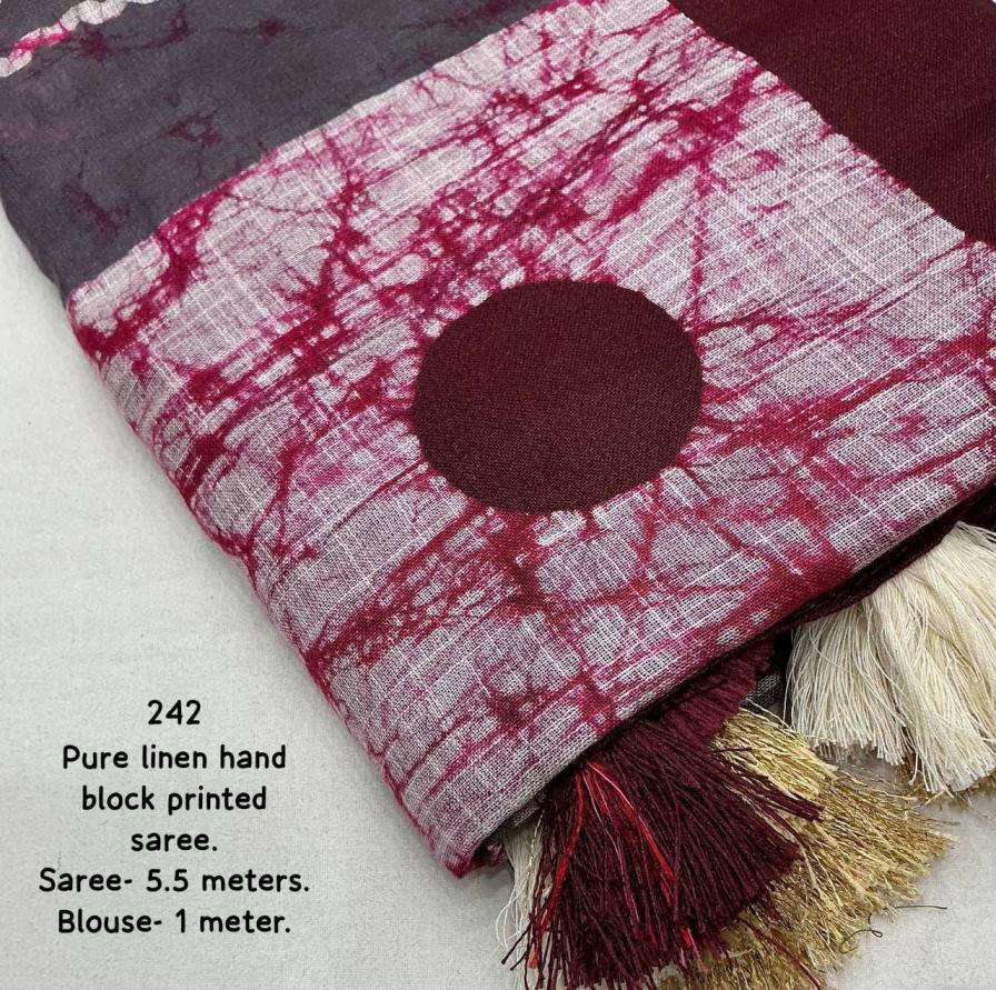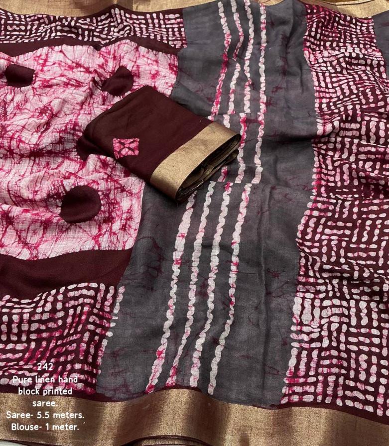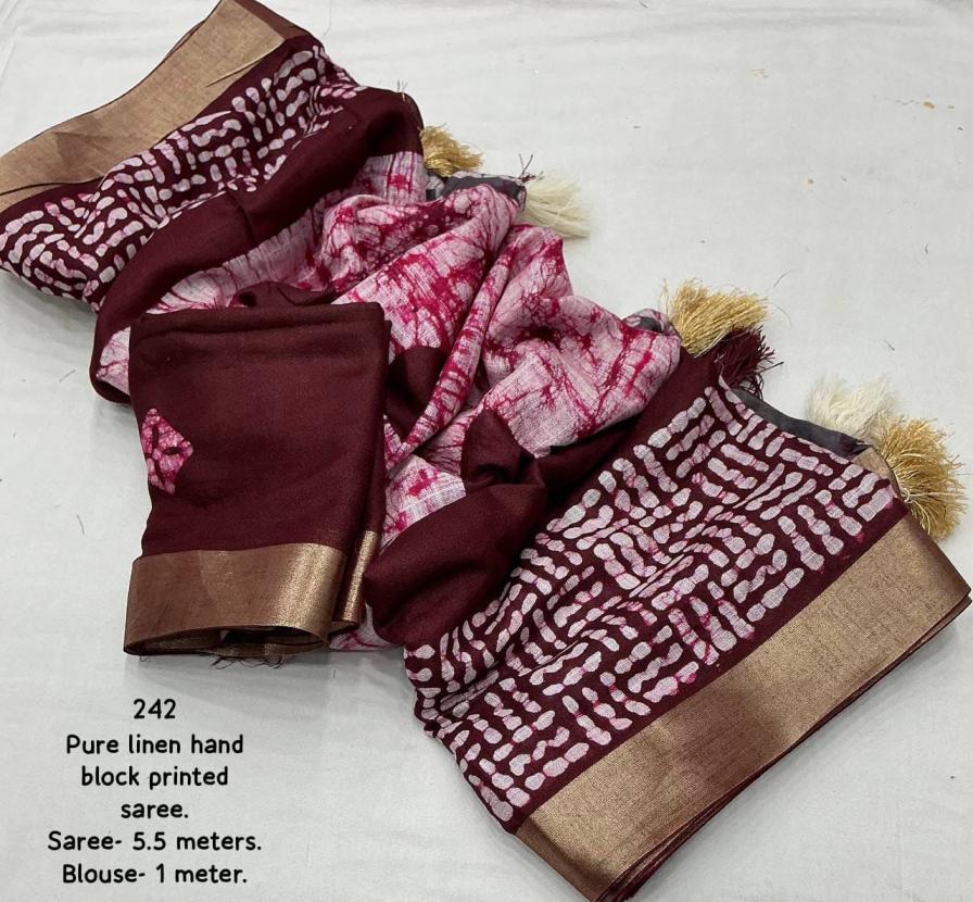 new arrivals New pure premium linen hand block printed saree. kc - 241 yashoda linen. Quality - soft pure linen saree with zari pattu woven border. Handcrafted hand block double batik print. Cotton tassles on pallu. Blouse- pure linen handblock printed blouse. Rate- 1450+ship Top trusted quality |