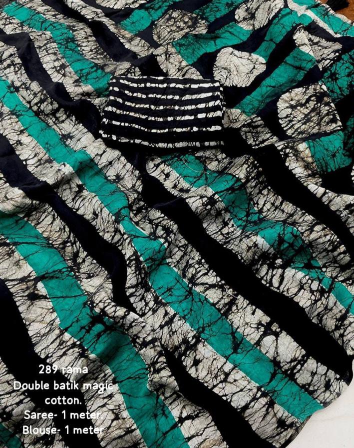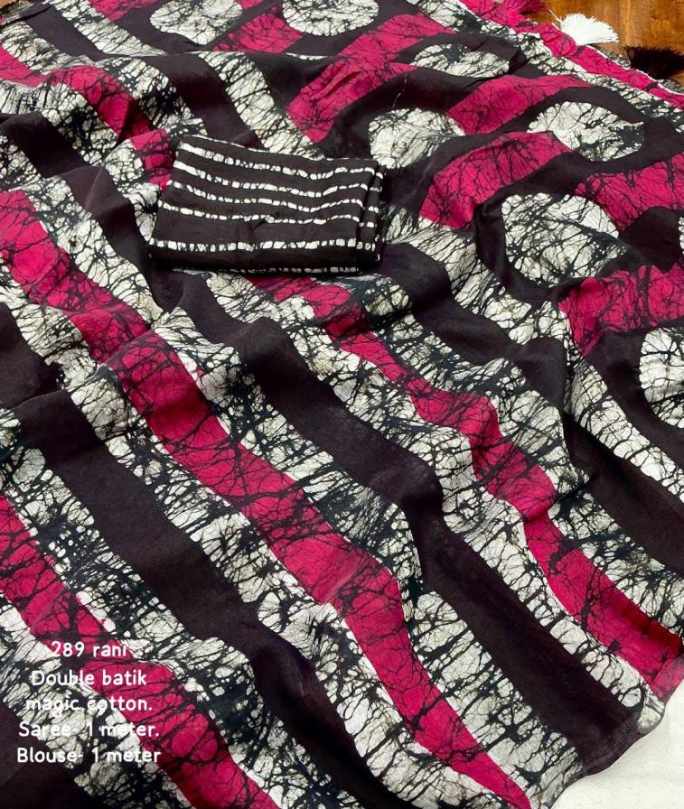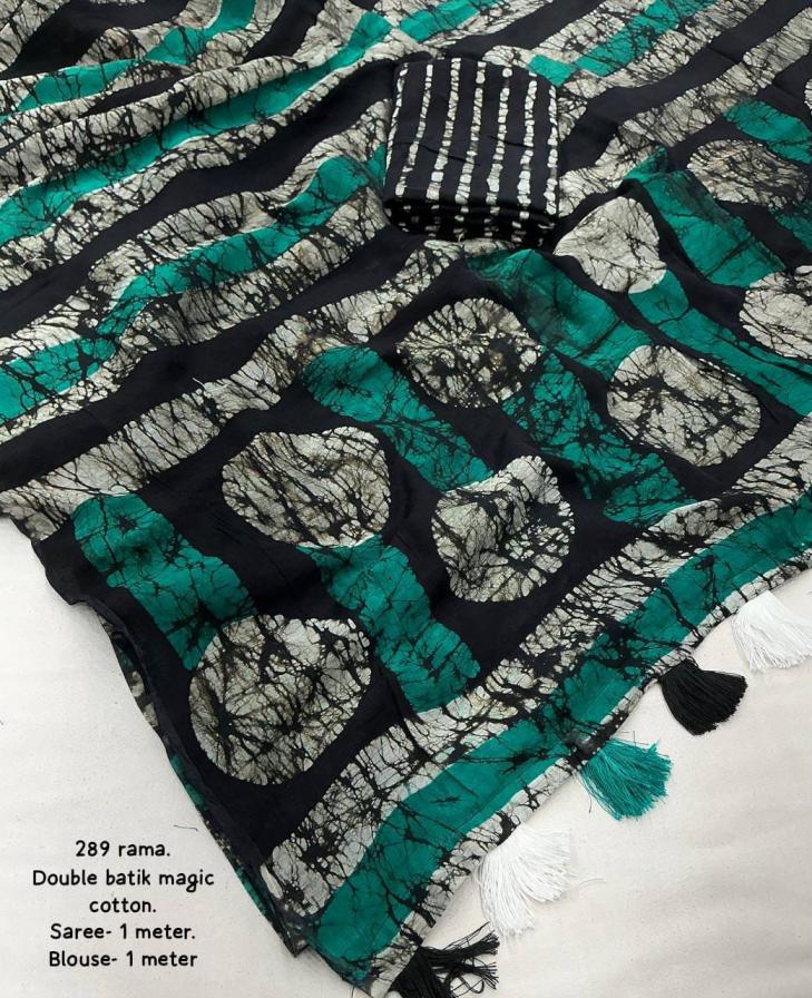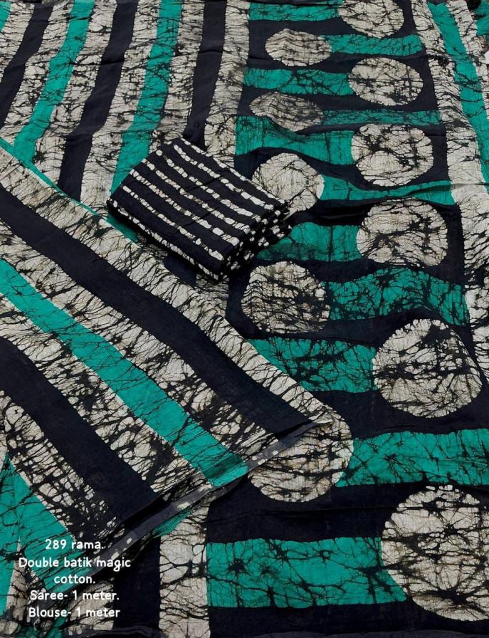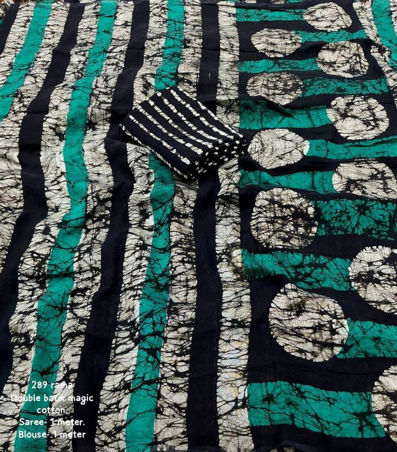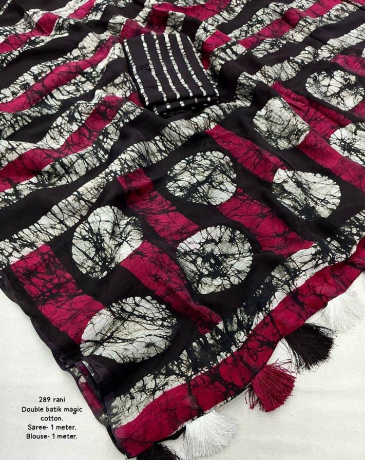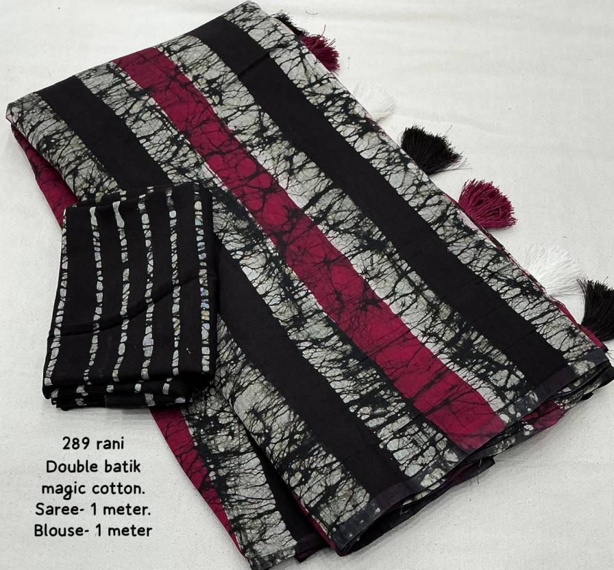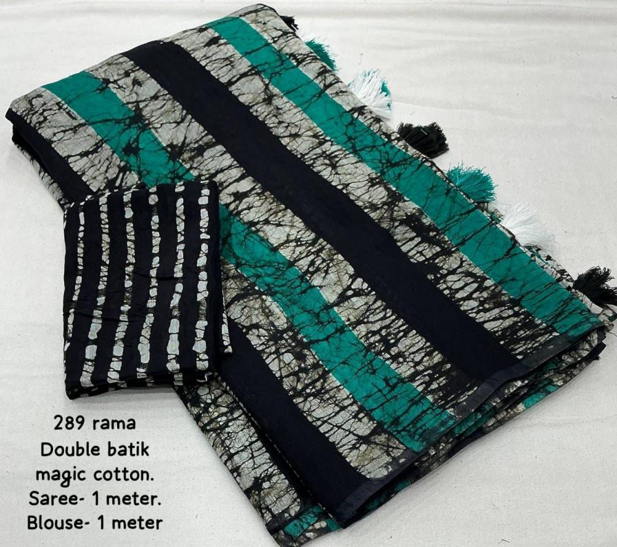 new arrivals New double hand batik magic cotton saree. KC - 289 magic cotton double batik. Pure chanderi cotton saree multicolor hand batik prints. Horizontal linings on body and Polkadot pallu. Cotton tassles on pallu. Two color matchings. Contrast leheriya batik printed blouse. Rate - 1250+ship Top premium quality |