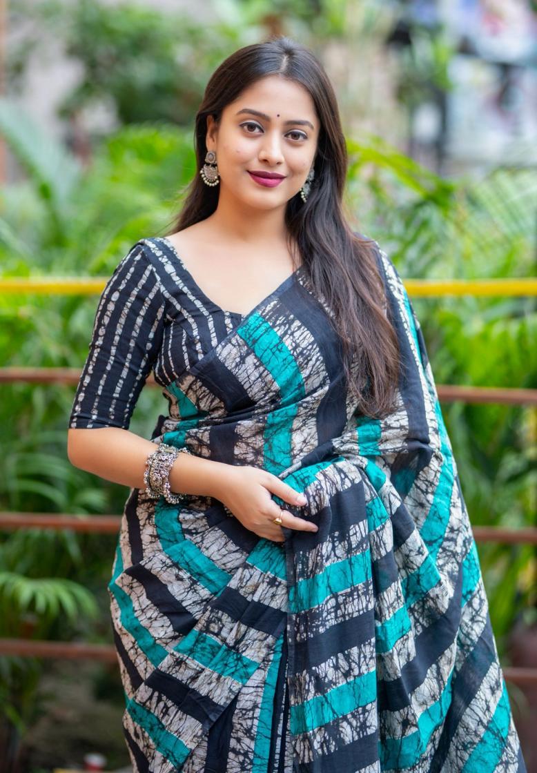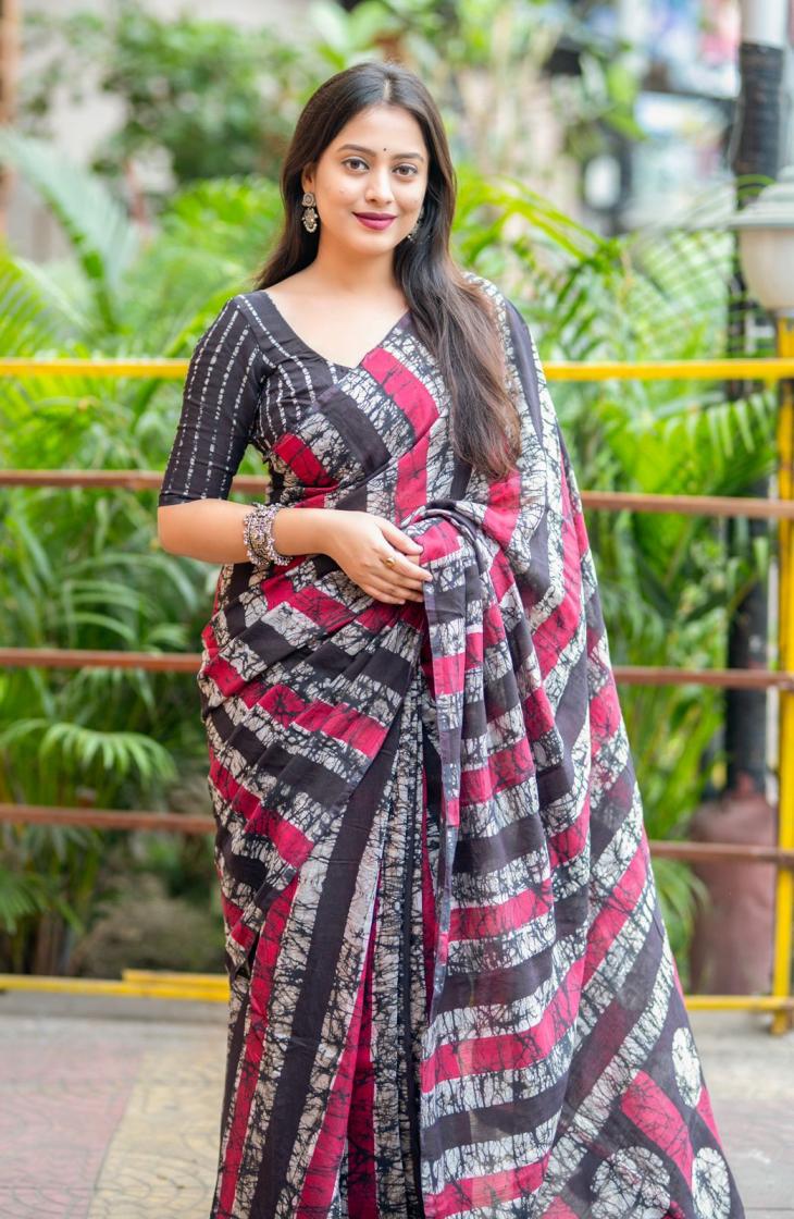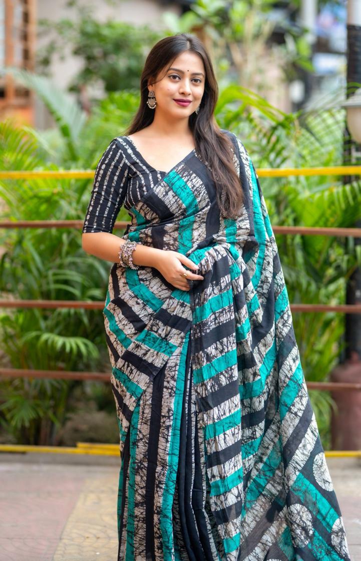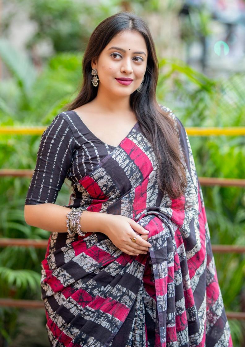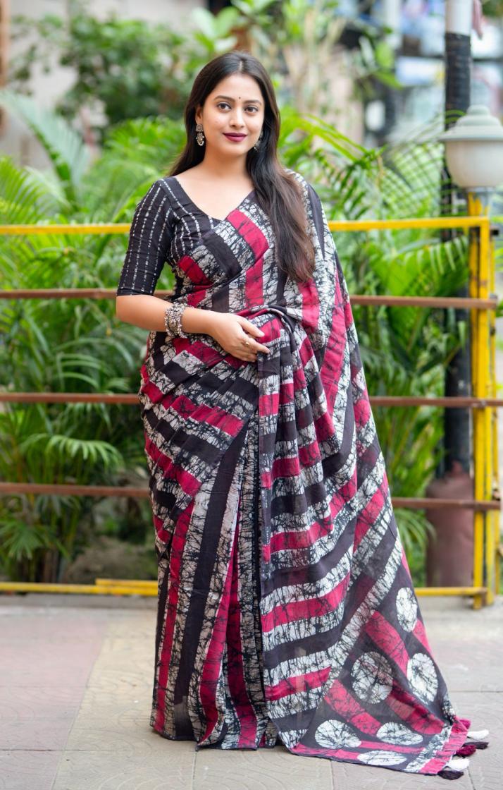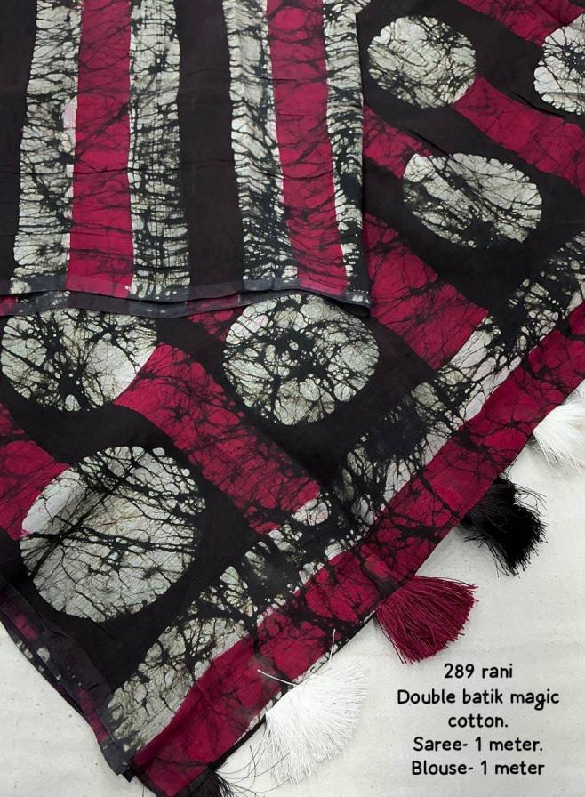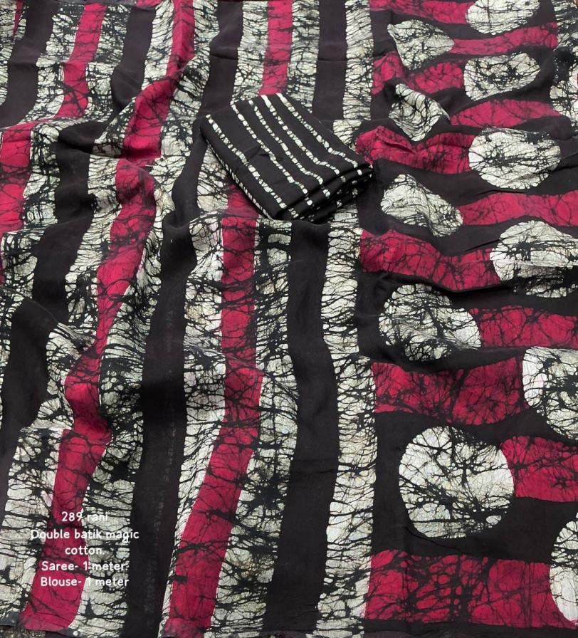 new arrivals New double hand batik magic cotton saree. KC - 289 magic cotton double batik. Pure chanderi cotton saree multicolor hand batik prints. Horizontal linings on body and Polkadot pallu. Cotton tassles on pallu. Two color matchings. Contrast leheriya batik printed blouse. Rate - 1250+ship Top premium quality |