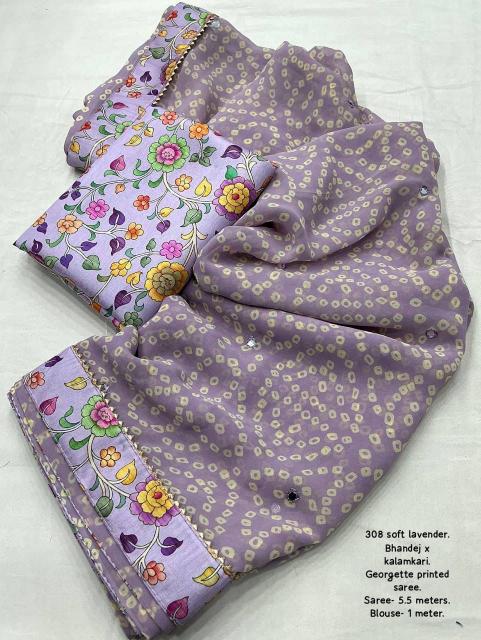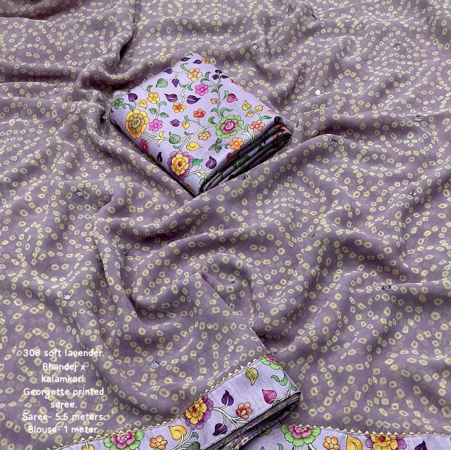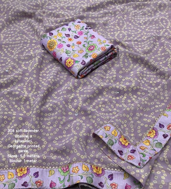New fancy georgette saree BHANDANI X KALAMKARI. kc 308 bhandan georgette. soft georgette saree with bandej prints and perfectly matched kalamkari patched border. slub Bangalori digital printed blouse Rate - 699/- +ship Top trusted quality |