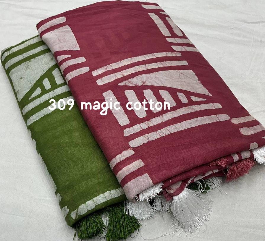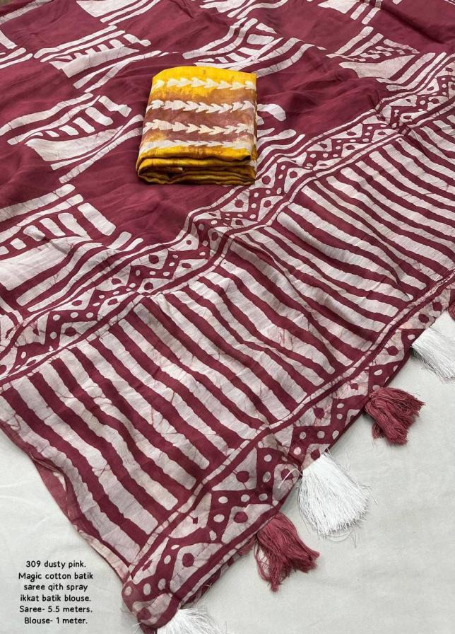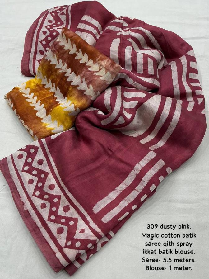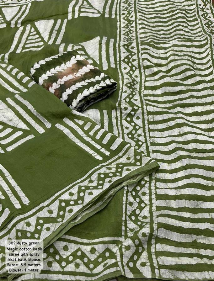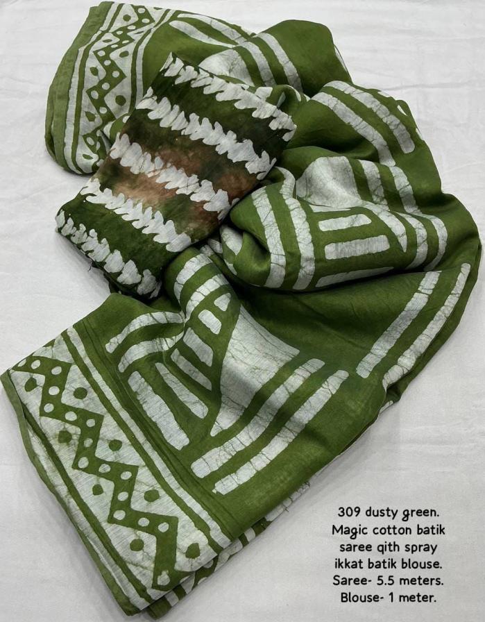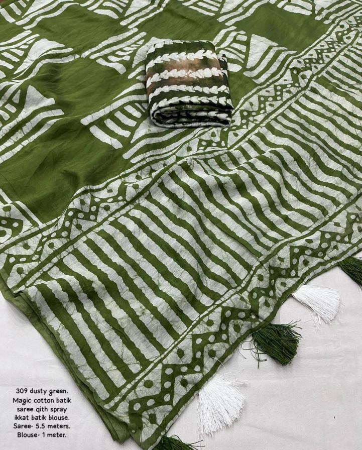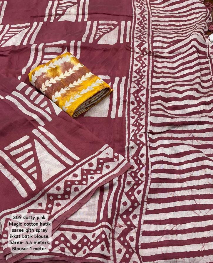 new arrivals New pure chanderi batik saree with designer blouse. #magiccotton KC - 309 magic cotton Pure chanderi cotton saree with hand block batik prints. Cotton tassels on paluu. Pure chanderi cotton blouse with spray style dying and ikkat style batik prints done on it. Rate- 1050/- +ship Top trusted quality |