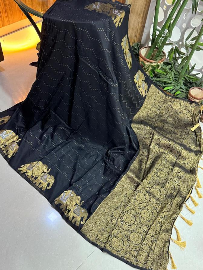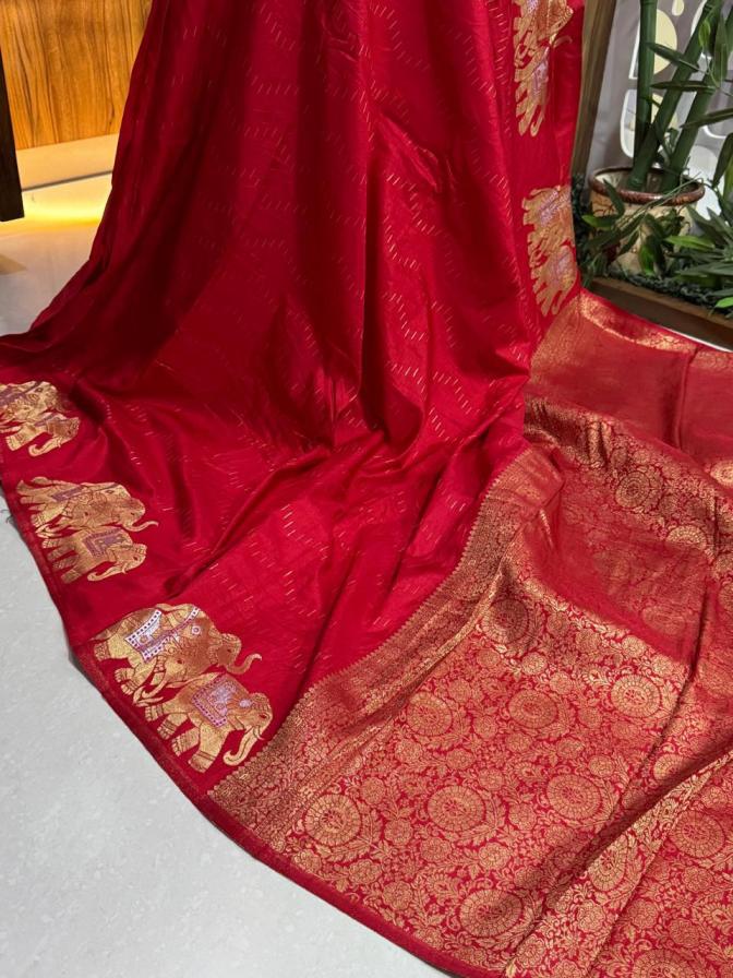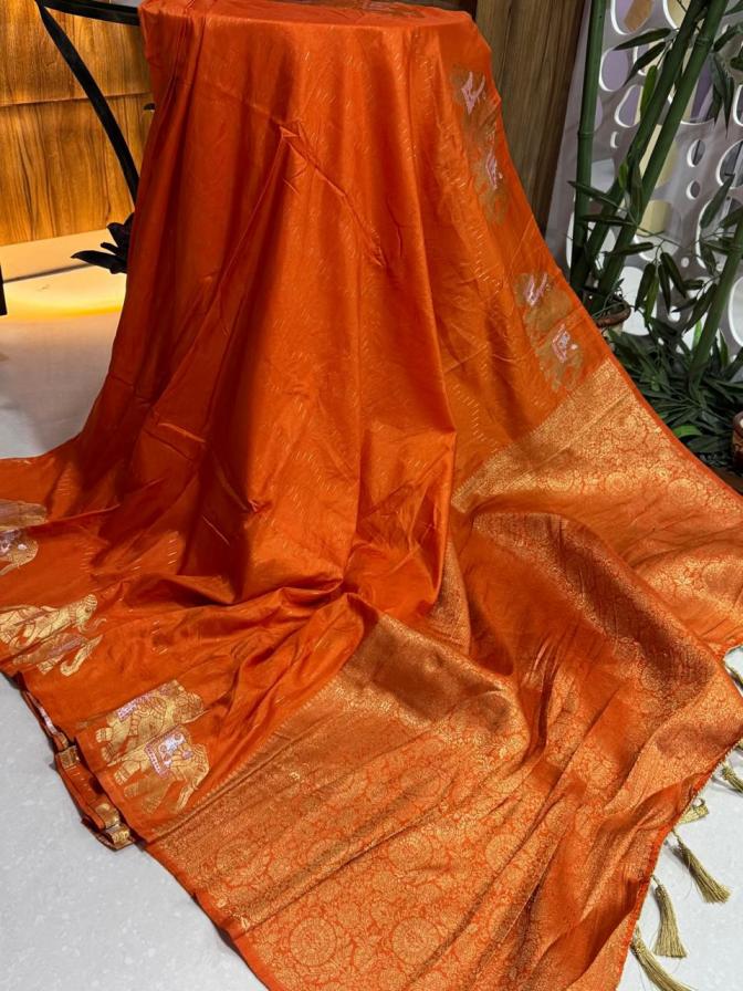 "Experience the grandeur of Banarasi craftsmanship! Our stunning nylon Banarasi hand-dyed saree features: KC-324 Rich, opulent pallu with majestic elephant figure weaving Perfect for weddings, festivals, or special occasions, this exquisite saree is a true masterpiece of Banarasi artistry." Price ₹1399/- |