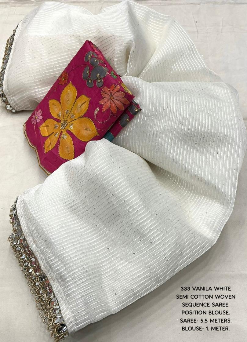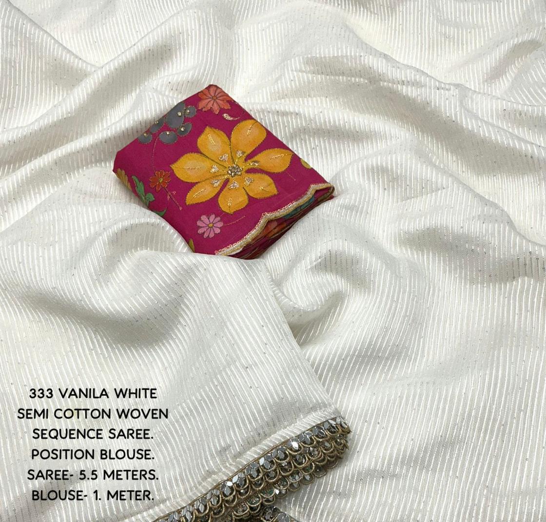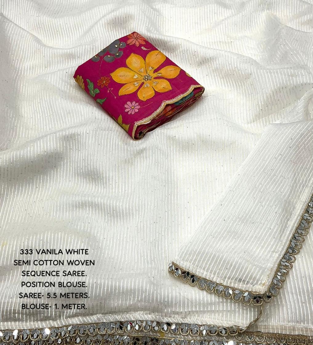 new arrivals New fancy woven sequence semi cotton saree. KC - 333 COTTON SEQUENCE. Soft semi cotton allover woven sequence saree with patched hand mirror lace. Paired beautiful postion print blouse. Hand sticked stone work done on blouse. Rate - 1650+ship Top premium quality |