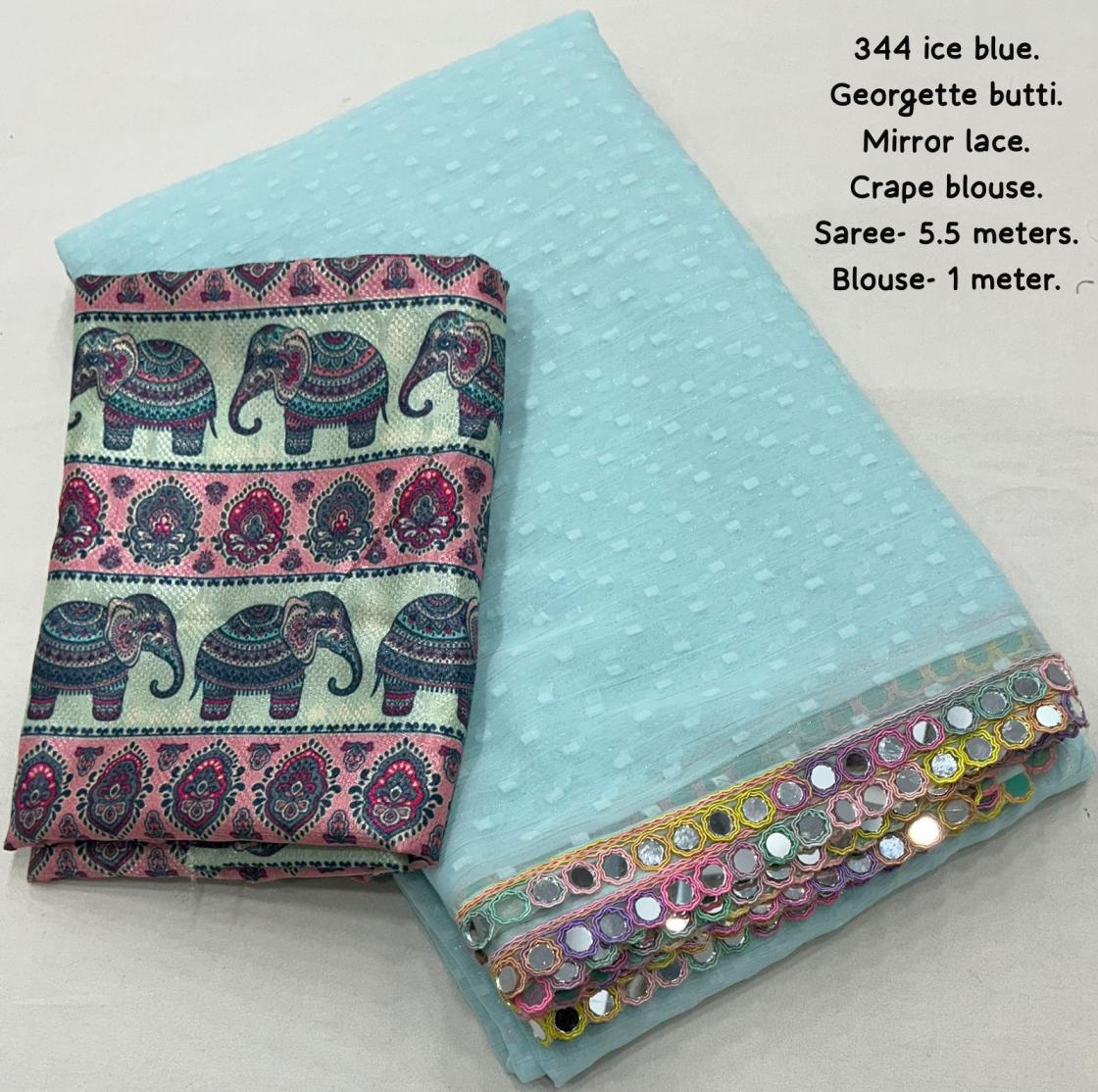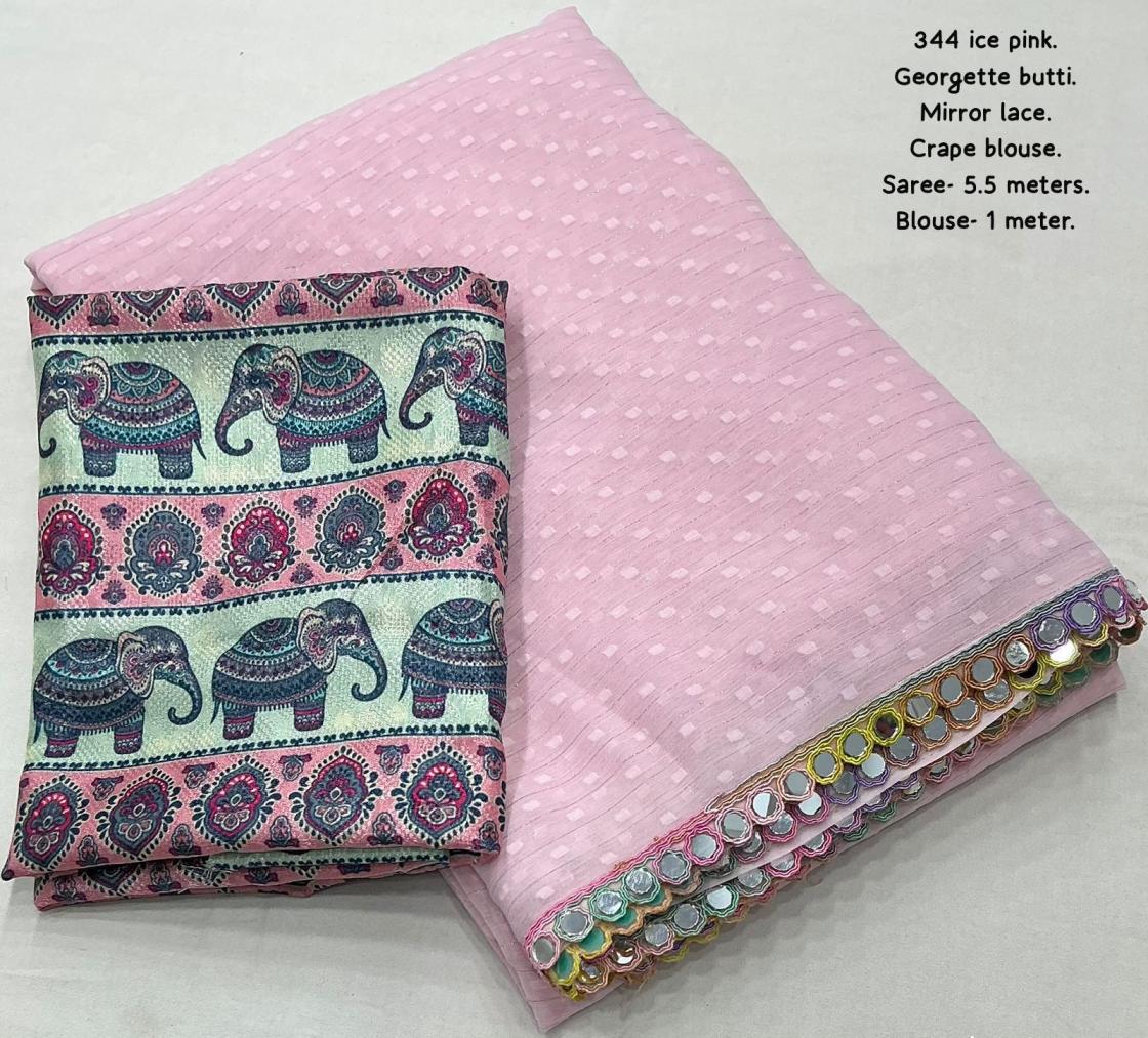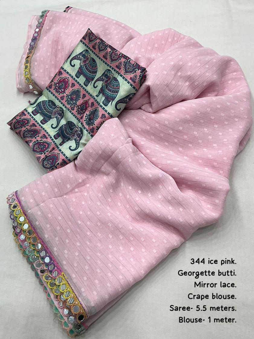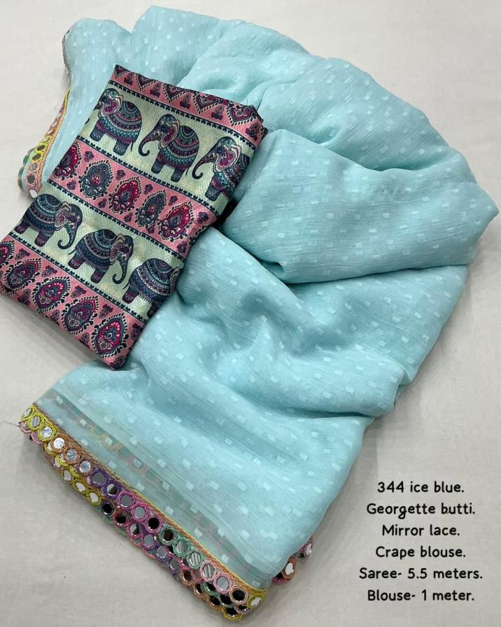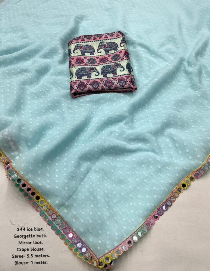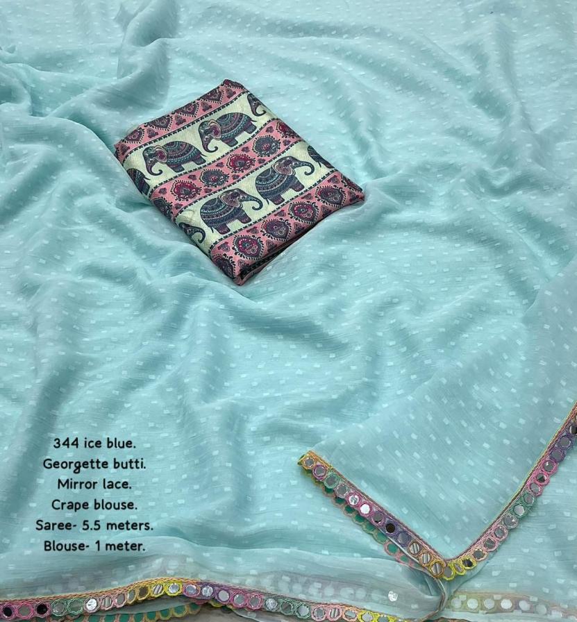 new arrivals New super pastel color range fancy designer saree from kc. KC- 344 ice cream Soft georhette saree with self woven butti design. Multi color ptched lace with real mirror work. Perfect matched digital printed crape silk blouse. Rate - 1050+ship Top trusted quality |