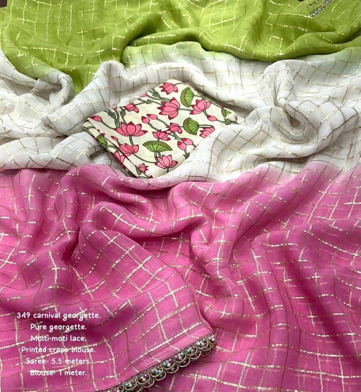 new arrivals New pure georgette trendy chex tri-color shaded saree KC - 349 carnival georgette. Pure georgette zari woven chex saree. Tye and dye tri-color shaded pattern. Prefectky matched coloured moti and stone lace. Simplicity loaded. Self woven crape silk floral digital printed blouse. Rate - 1250/- +ship Top premium quality |