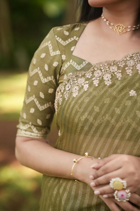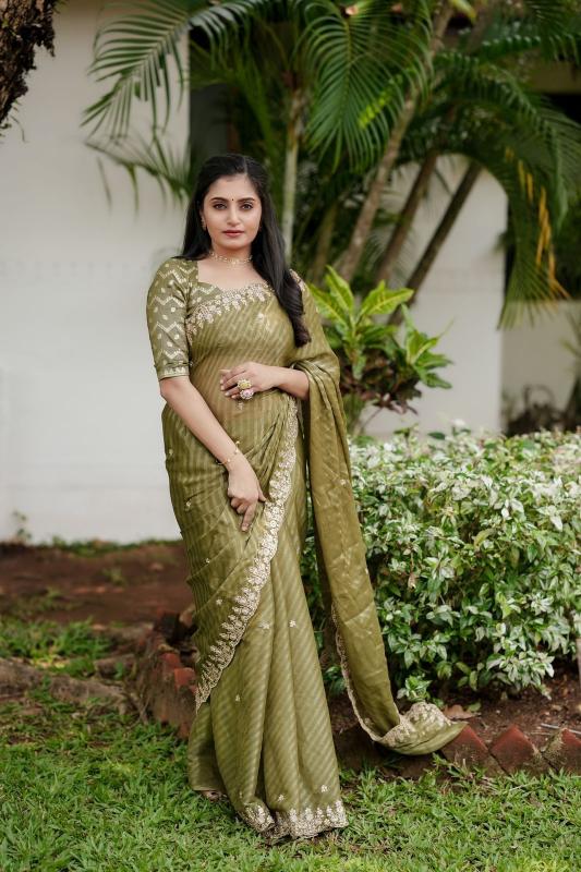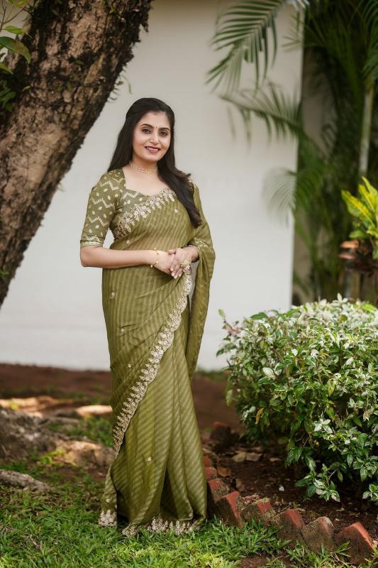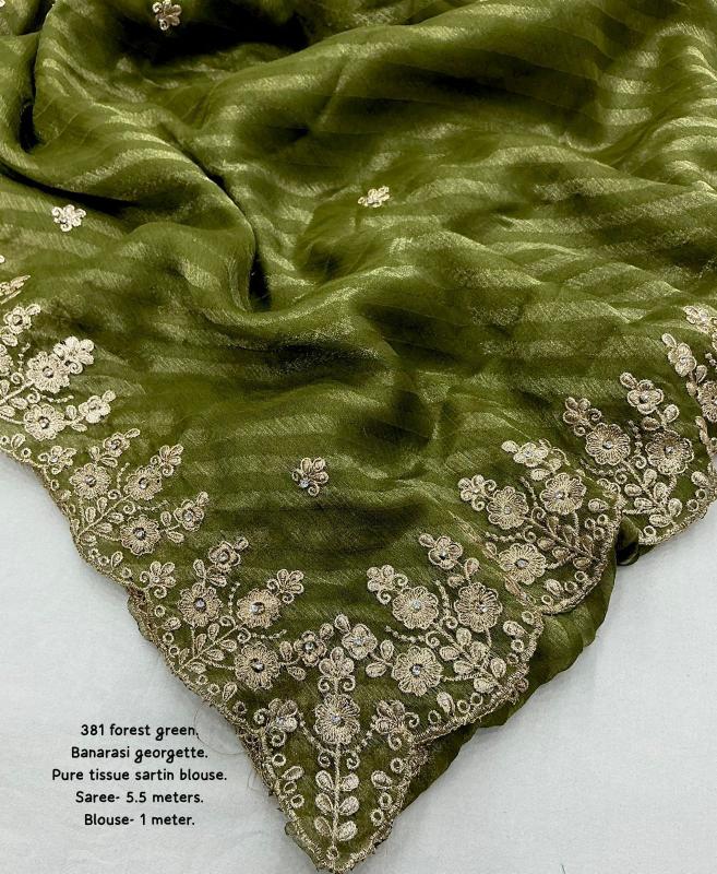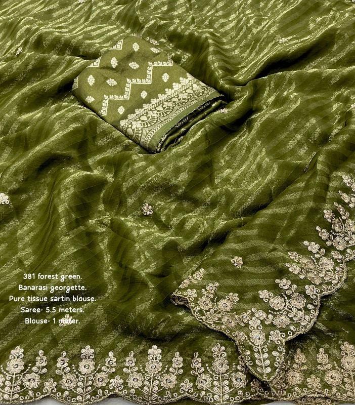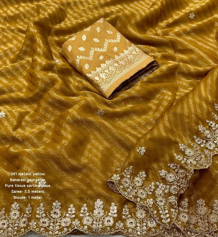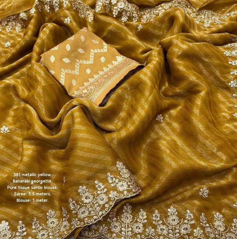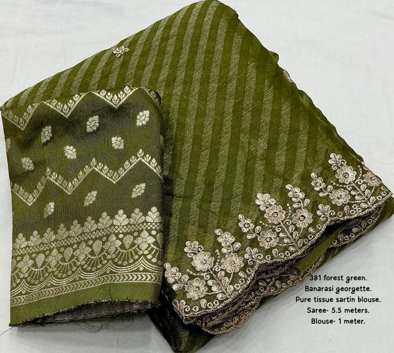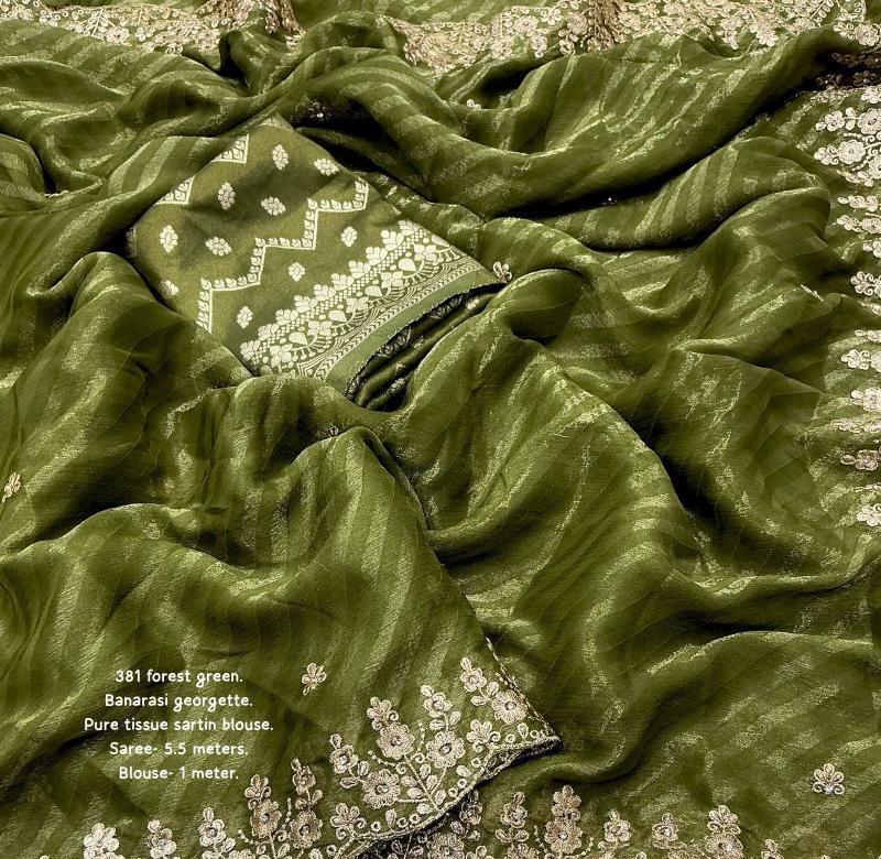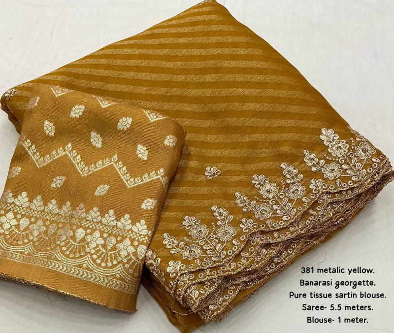 new arrivals New fancy zari emboridary saree KC - 381 banarasi georgette. Soft georgette saree with self woven leheriya and simple shine on it. Zari woven c-pallu emboridady and stone work on it. Pure Tissue sartin banarsi zari zig-zag woven blouse perfectly matched with saree rate - 1350+ship Top premium quality |