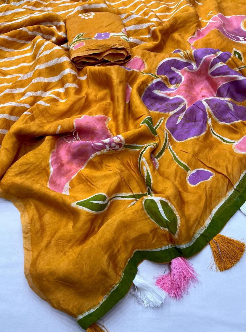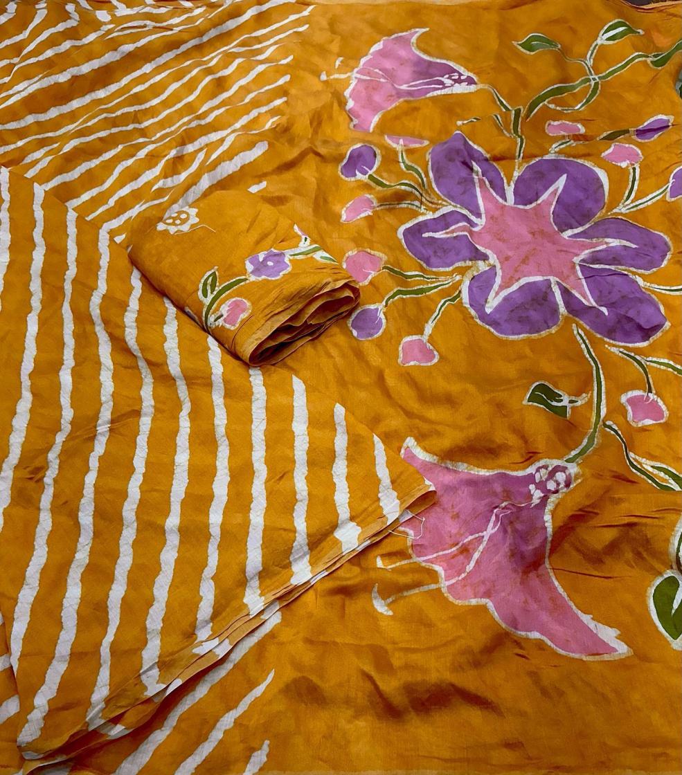 New premium chanderi cotton leheriya saree Soft pure chanderi cotton saree hand batik leheriya allover. Hand painted big pallu with cotton tassels. Perfectly matched pure chanderi blouse with painted selves. Rate - 1350+ship Top premium quality |