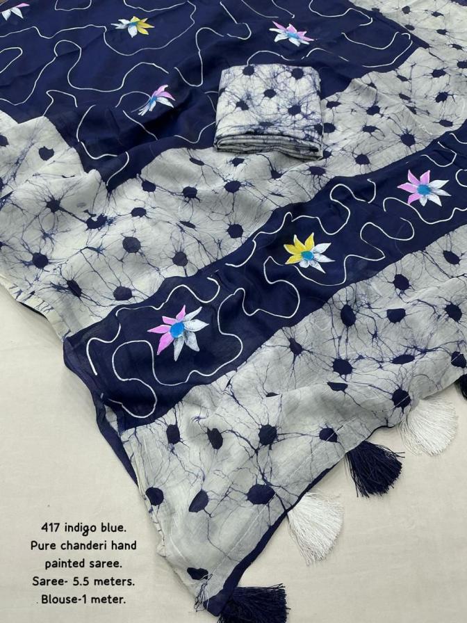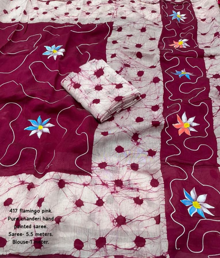 new arrivals New hand painted saree KC - 417 magic paint. Pure Chanderi cotton saree with beautifull combinations of batik prints and hand paints. Cotton tassles on pallu. Blouse- pure chanderi crack batik blouse. Rate - 1350+ship Top premium quality |