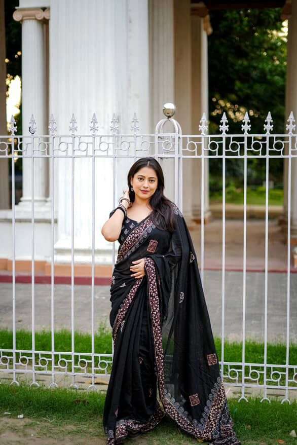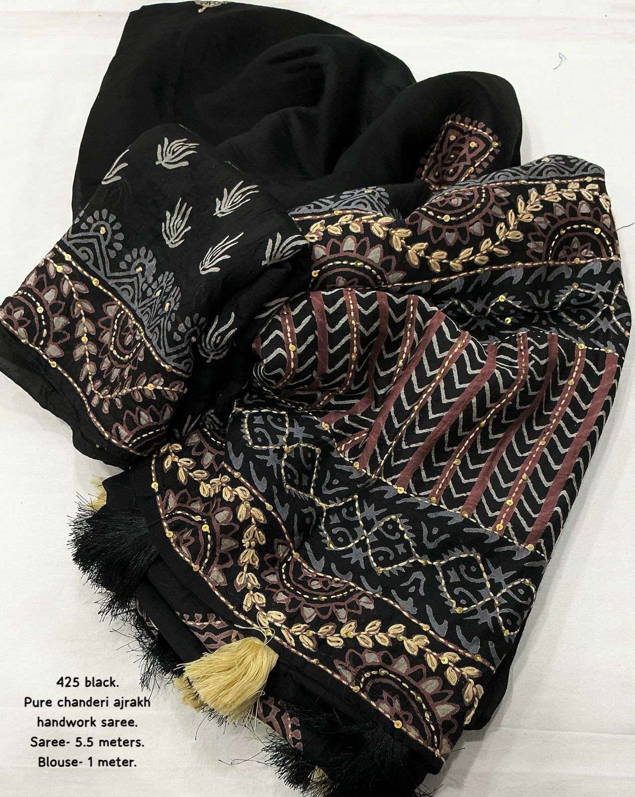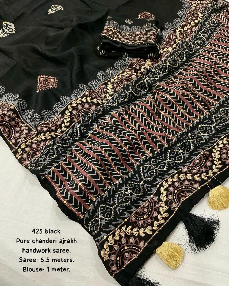new arrivals New premium ajrakh handwork saree KC - 425 ajrakh handwork (black edition) Pure chanderi cotton saree with ajrakh block-prints. Hand kaatha work outings done as per printing design. Cotton tassles on palllu. Running pure chanderi hand block blouse with hand work on selvess. Rate - 2250+ship. Top premium quality |