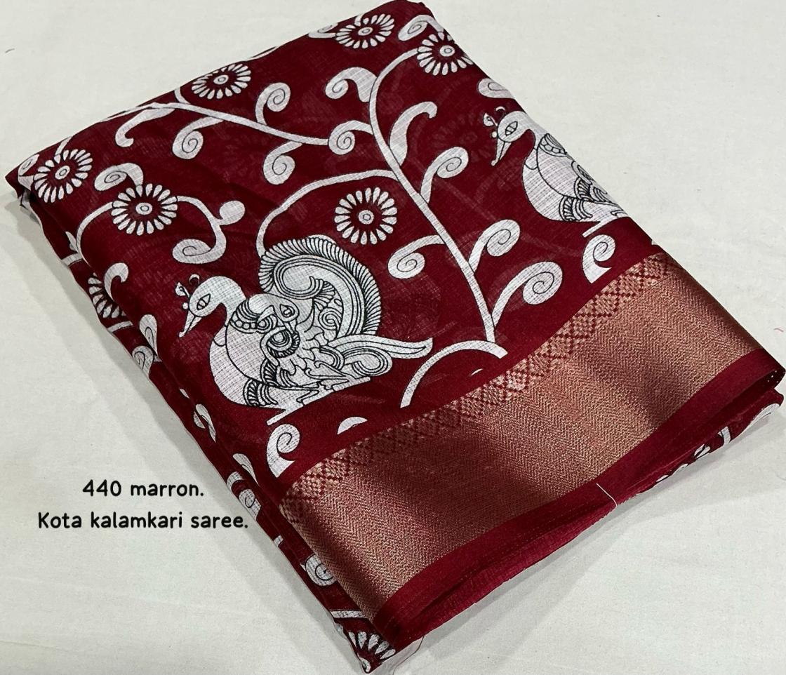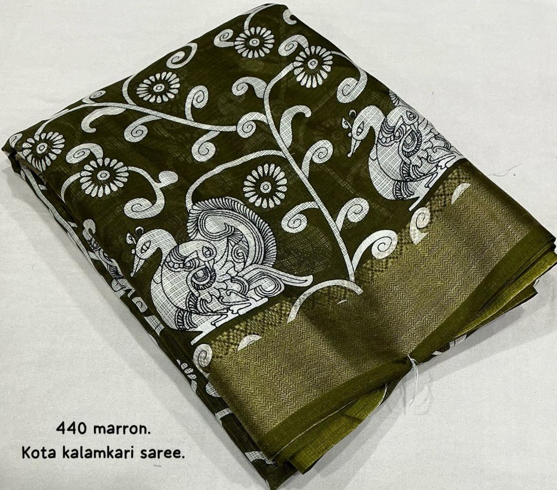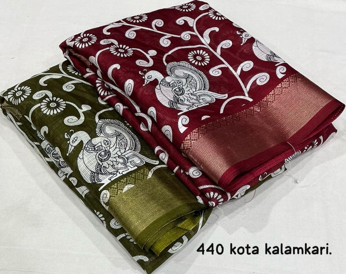 new arrivals New kota kalamkari saree KC - 440 kota kalamkari. Soft kota silk saree with kalamkari prints. Zari pattu woven border. Running blouse printed blouse. Rate - 570+ship Top |