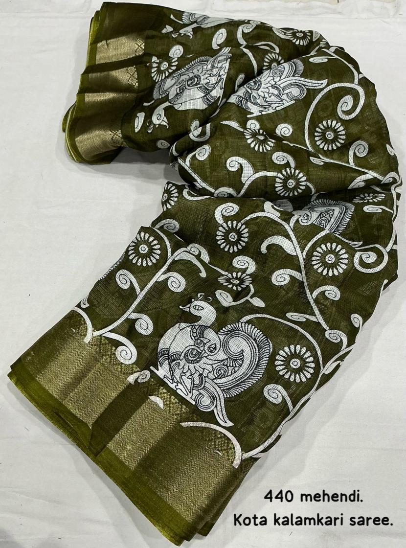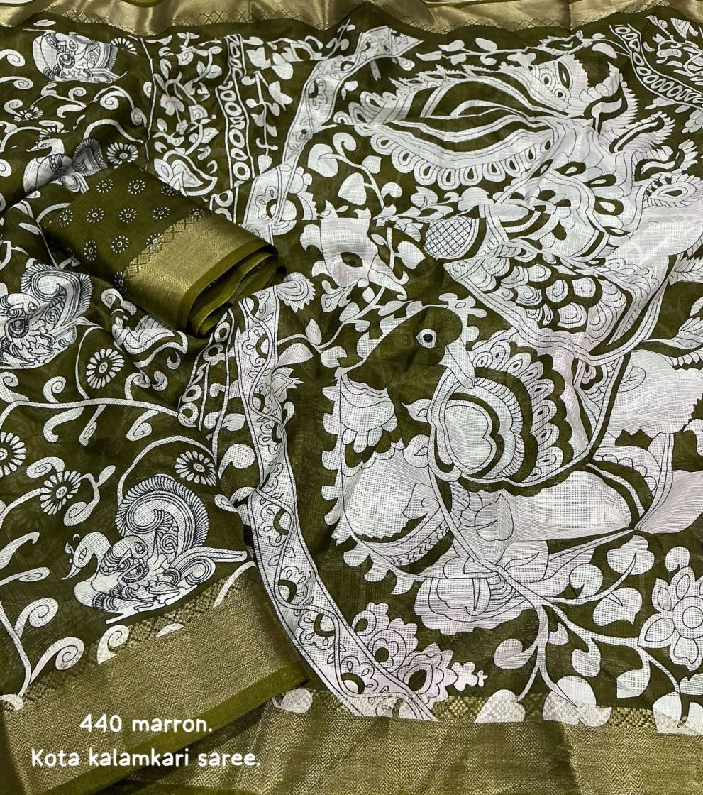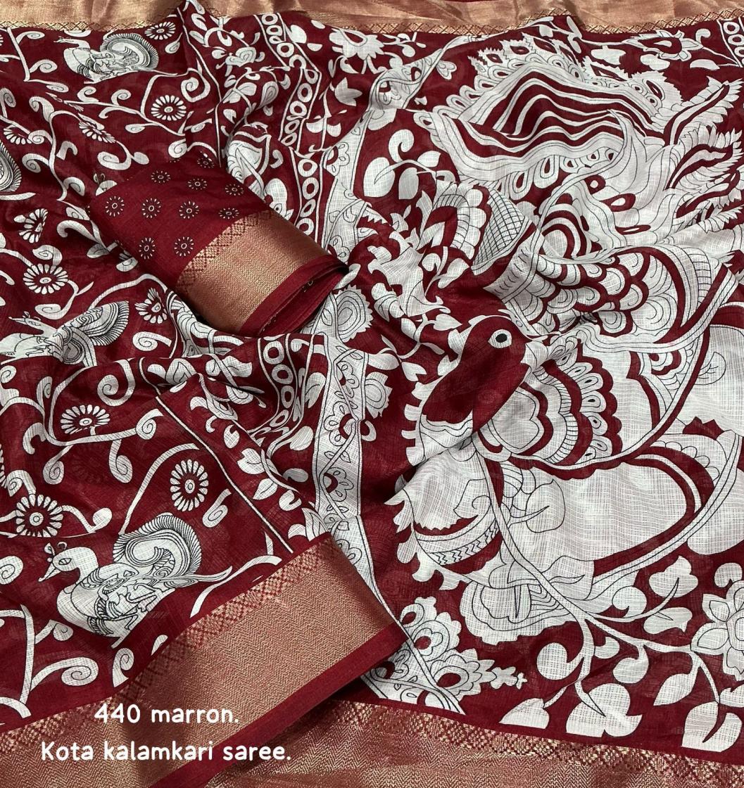 new arrivals New kota kalamkari saree KC - 440 kota kalamkari. Soft kota silk saree with kalamkari prints. Zari pattu woven border. Running blouse printed blouse. Rate - 570+ship Top |
