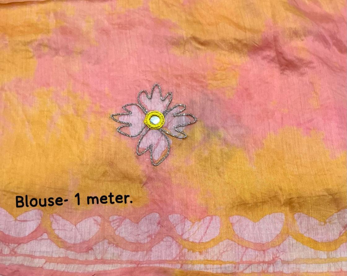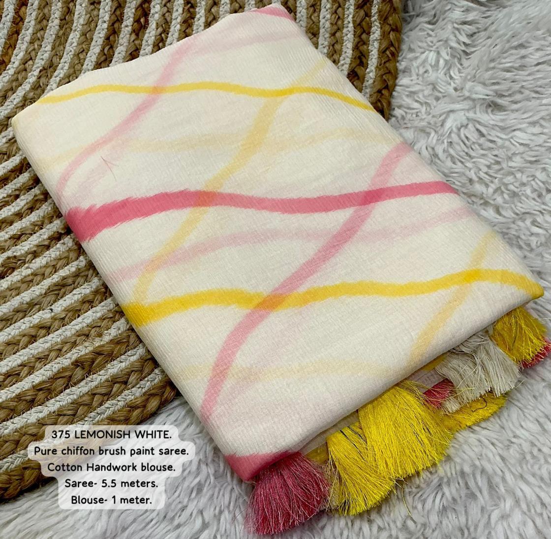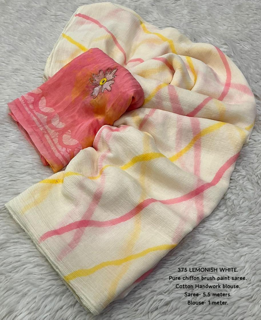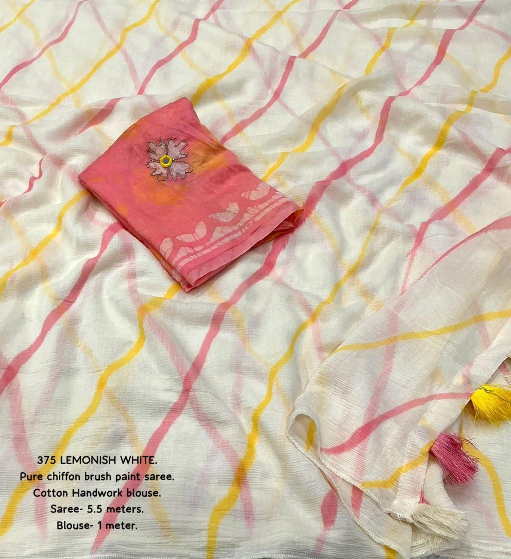 BACK IN STOCK New fancy single color pure chiffon saree. Pure chiffon saree with brush leheriya allover. Pico border and cotton tassels on pallu. Perfectly matched hand spray cotton chanderi blouse. Batik prints over spray and handwork outing with mirroring on blouse. Rate - 1450+ship Top premium quakity |