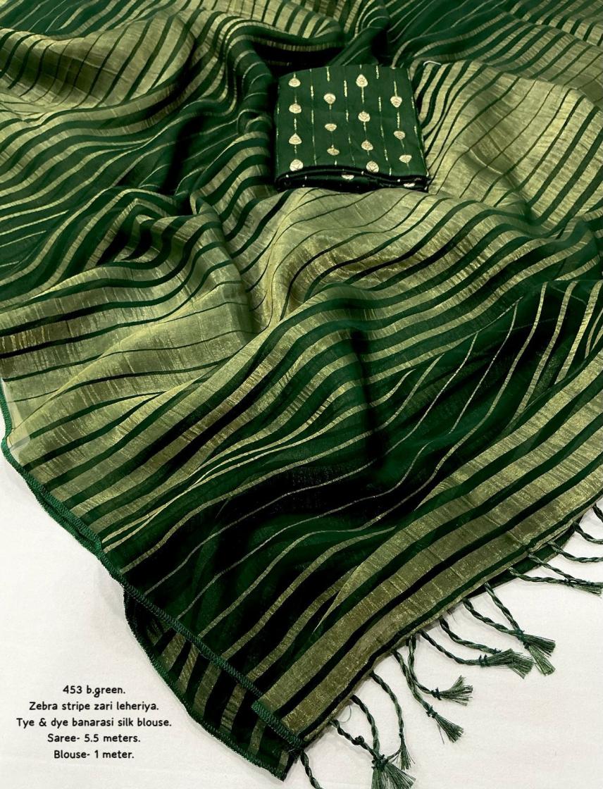 new arrivals New premium georgette zari leheriya saree. kc - 453 zebra leheriya. Soft georgette saree with zebra stripe style leheriya zari woven design. Tassles on pallu with picko border. Blouse- perfectly matched tye & dye banarasi silk zari woven.