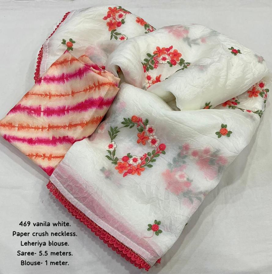 new arrivals New paper crush neckless wmboridary saree. KC - 469 paper neckless. Soft paper crush saree with floral neckless emboridary. Patech cotton lace. Perfectly matched leheriya crape peinted blouse. Rate - 1150+ship Top trusted quality |