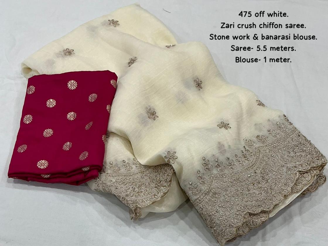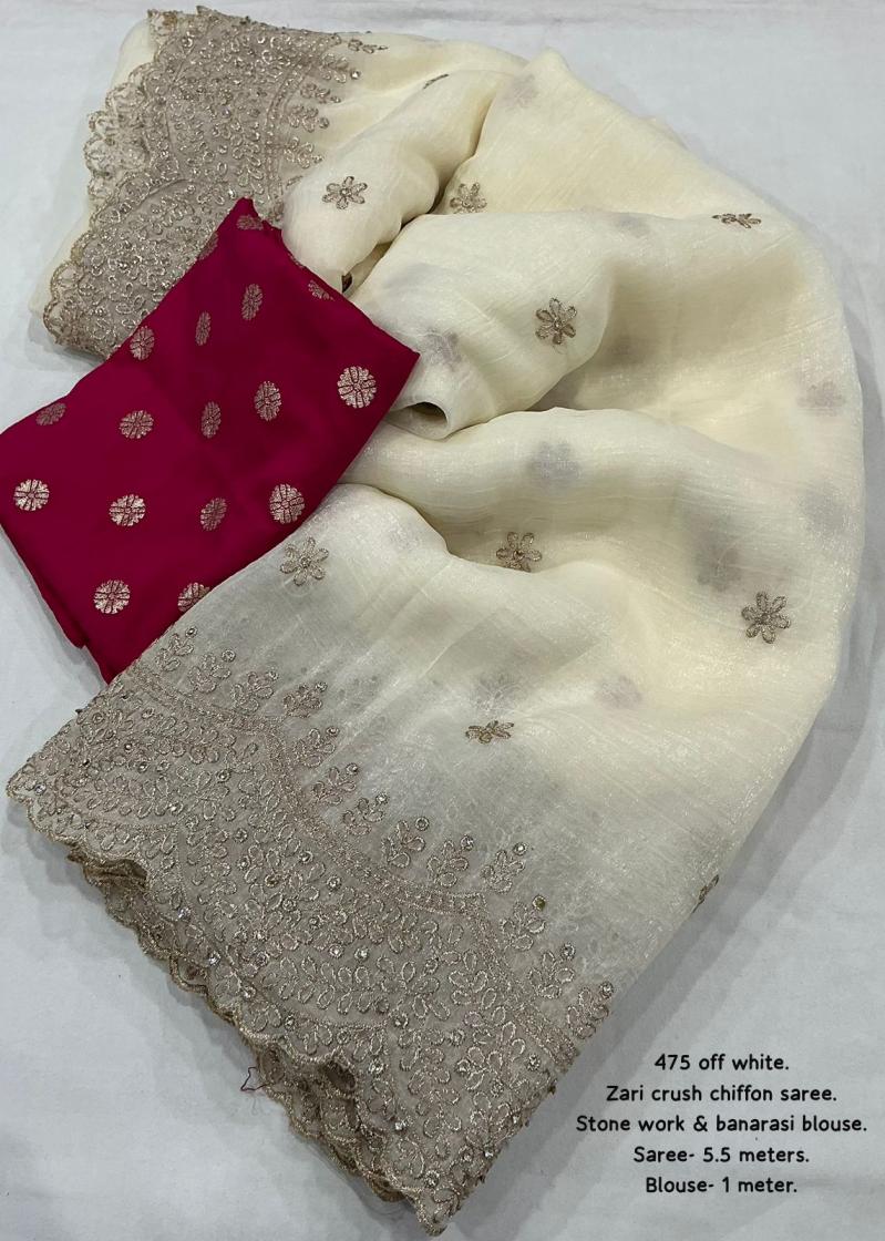 NEW ARRIVALS New fancy off white emboridary saree Single color edition. kc - 475 zari crush (d-3) Quality- soft crunchy crush saree with zari emboriday and stone work on it. Blouse- Contrast rani color banarsi zari woven blouse. Rate - 1400+ship. Top premium quality |