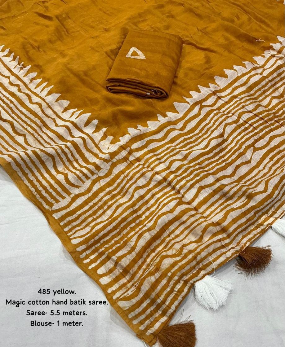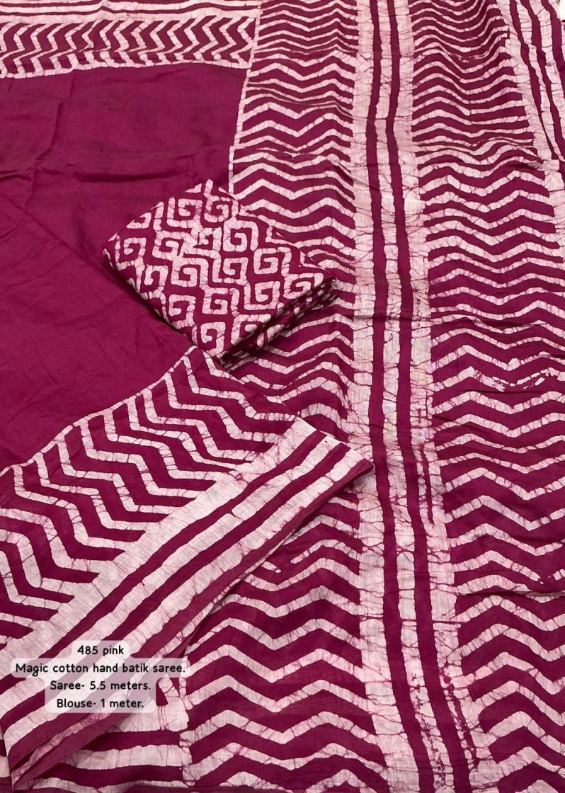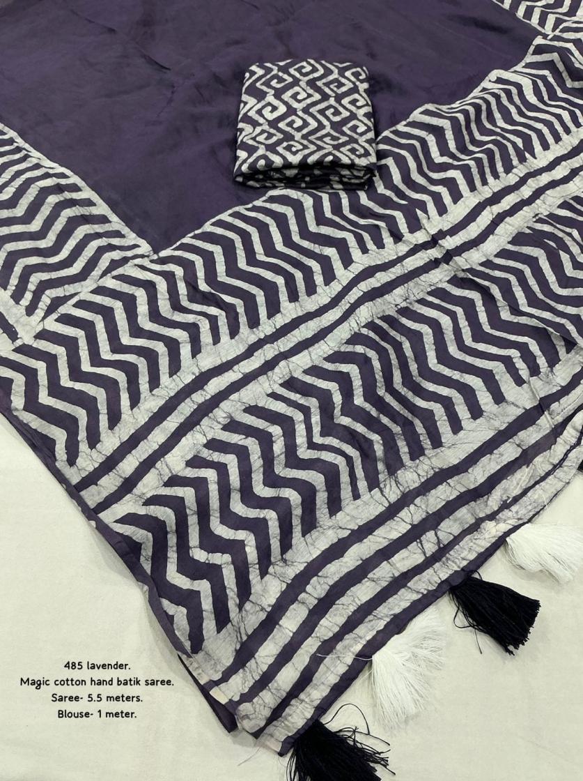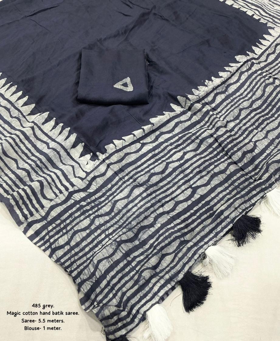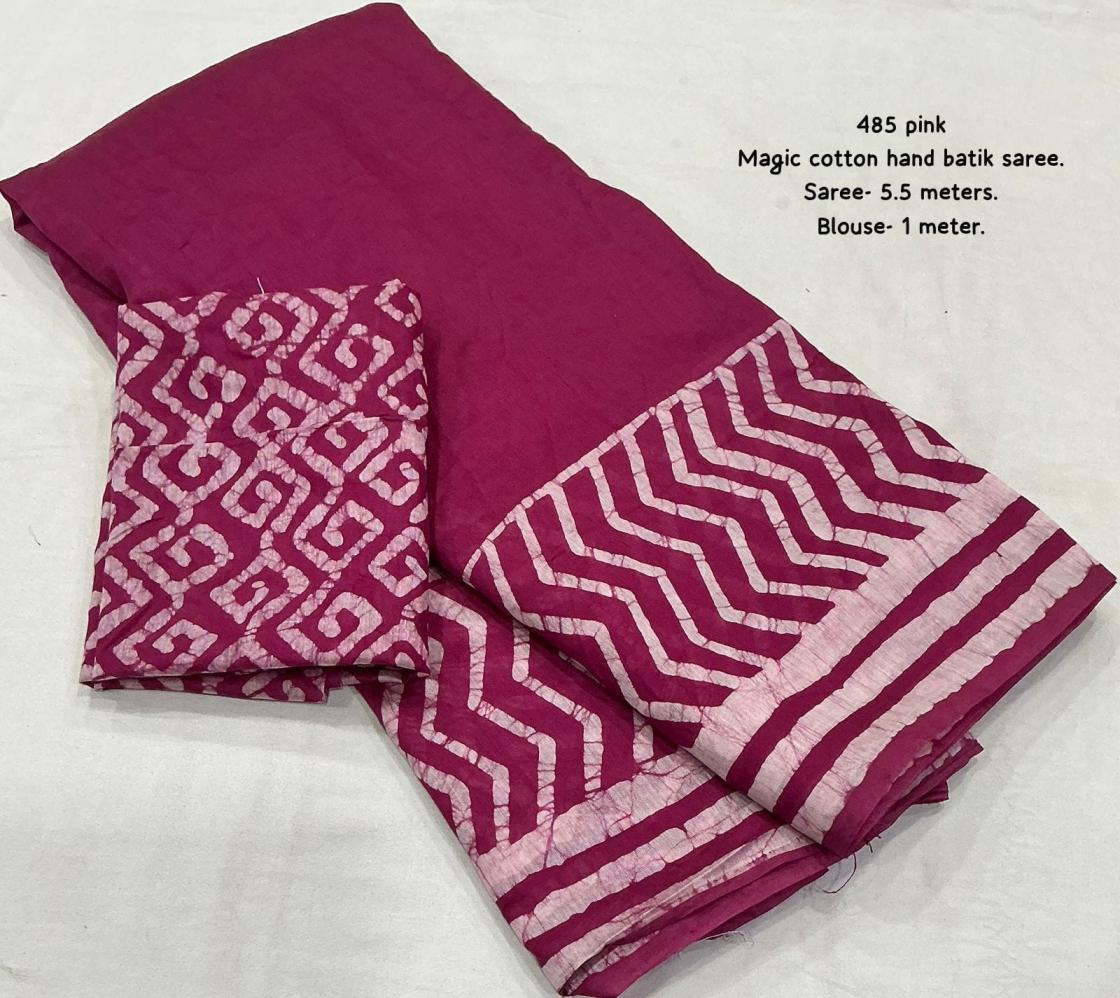 New pure chanderi batik sarees. KC - 485 magic cotton Quality- pure chanderi cotton saree with gala style batik peimts both side and plain in-between. Cotton tassles on pallu. Blouse- runing pure chanderi batik peimted blouse. Rate - 950+ship Top trusted quality |