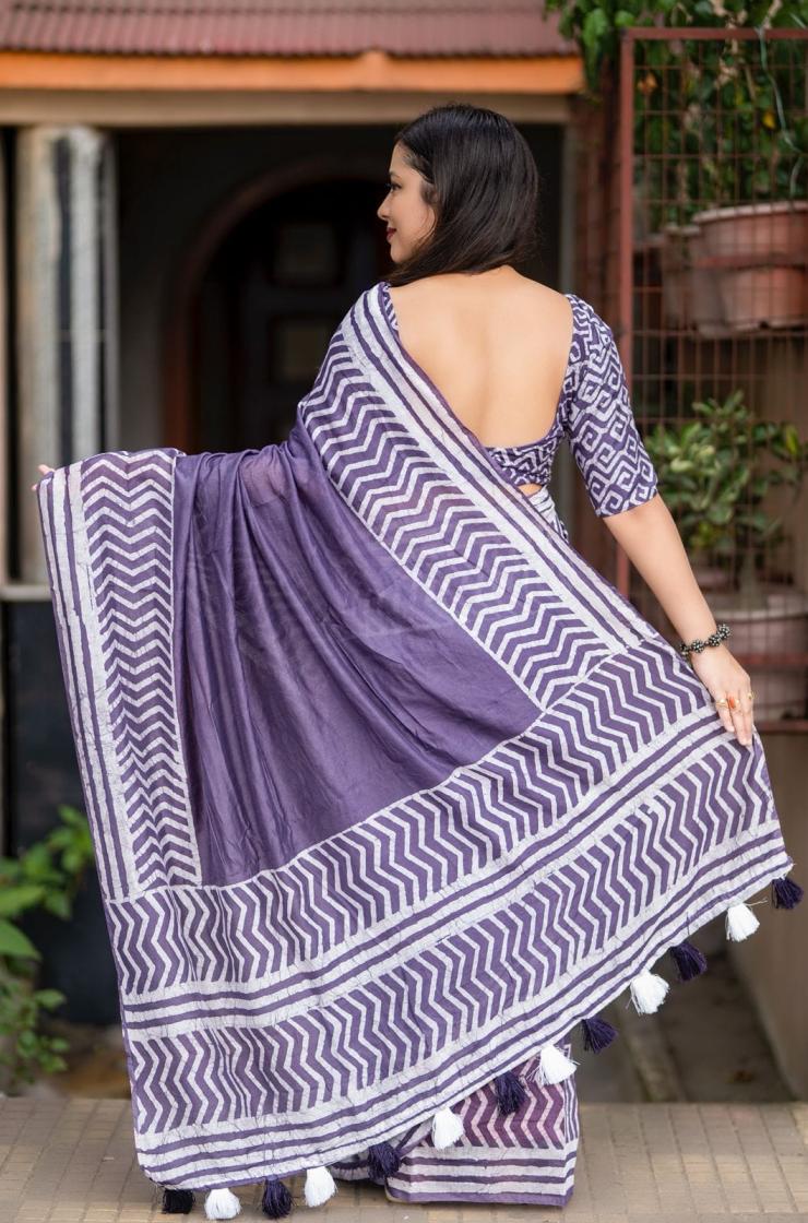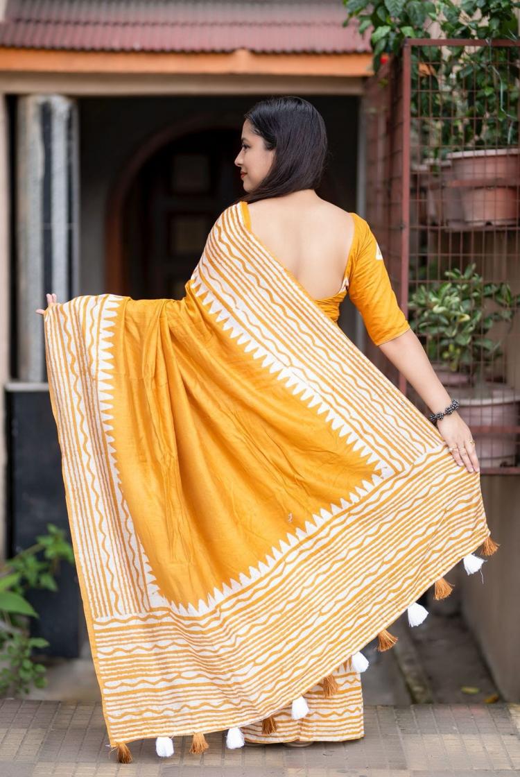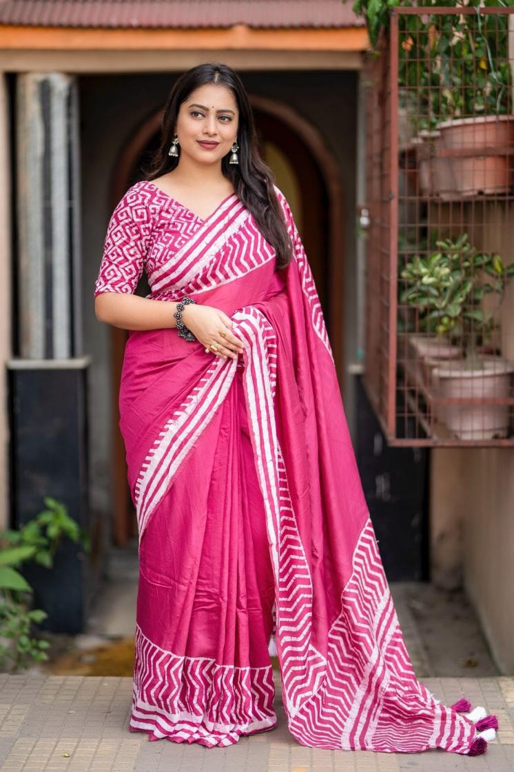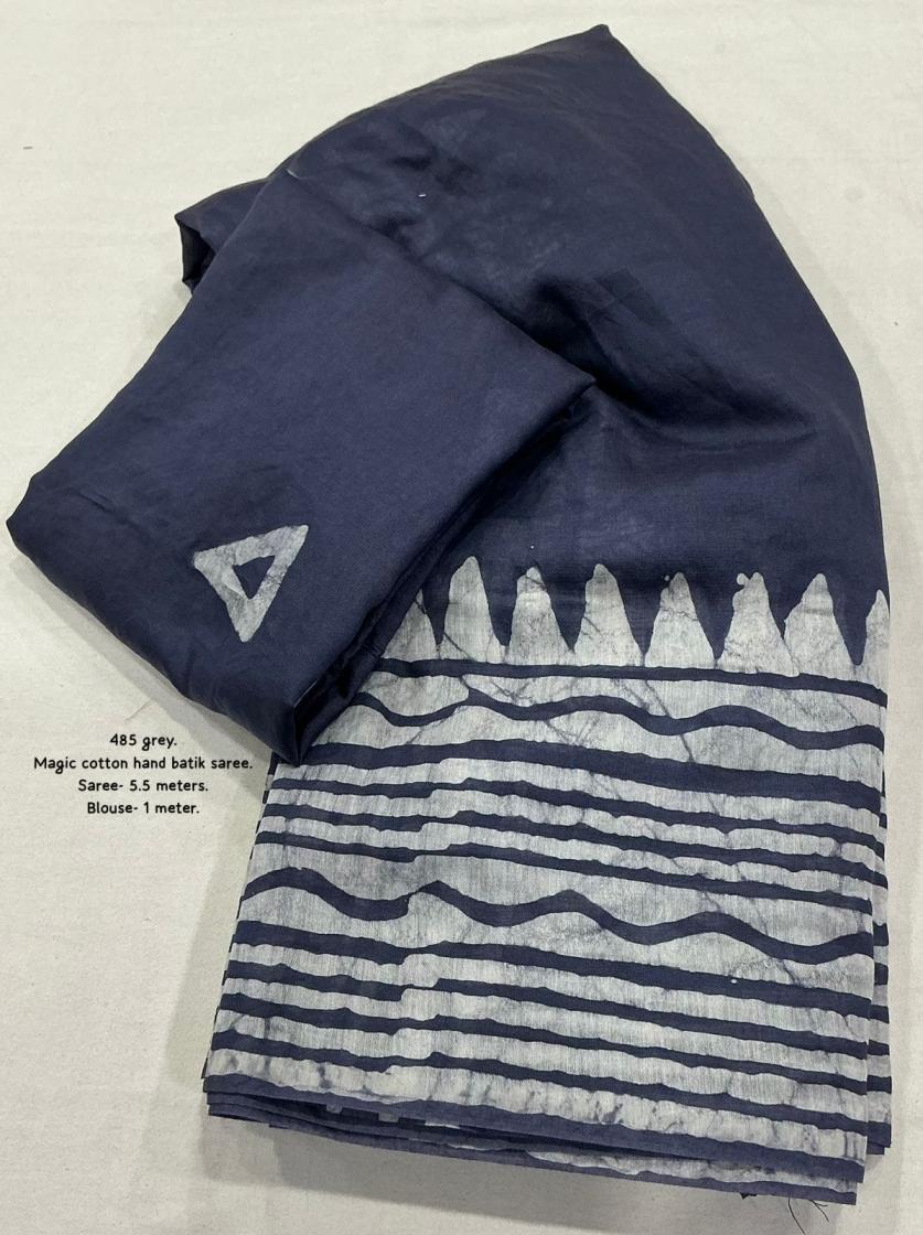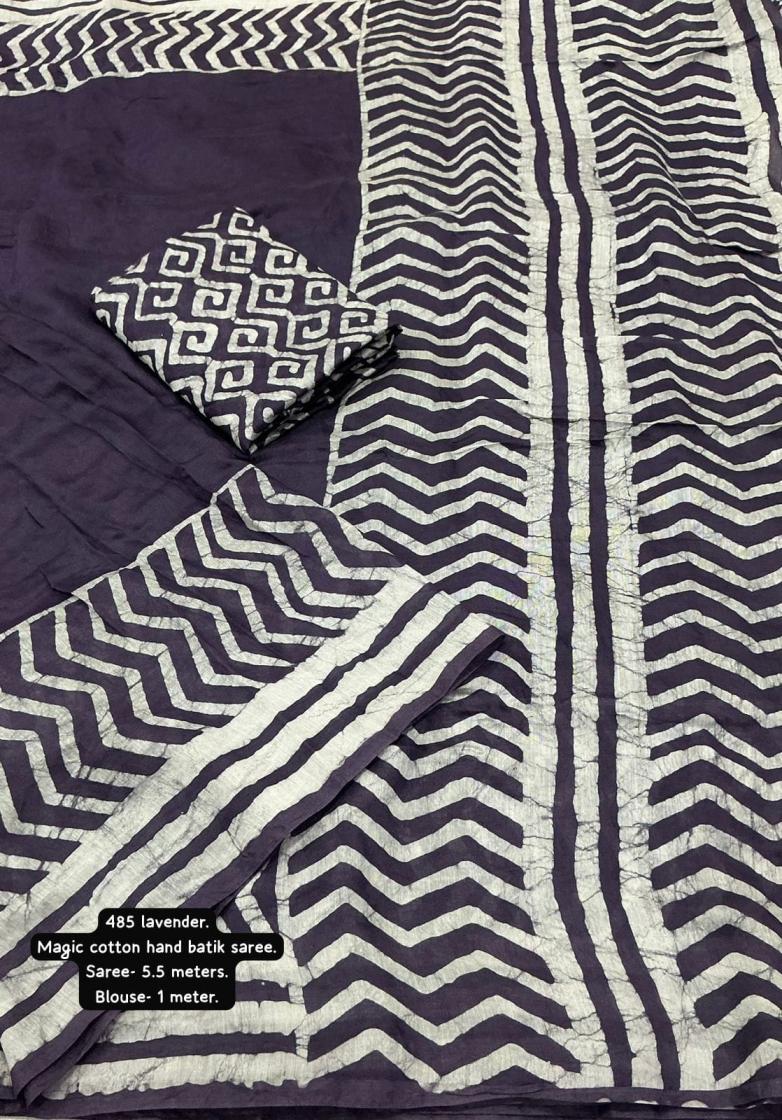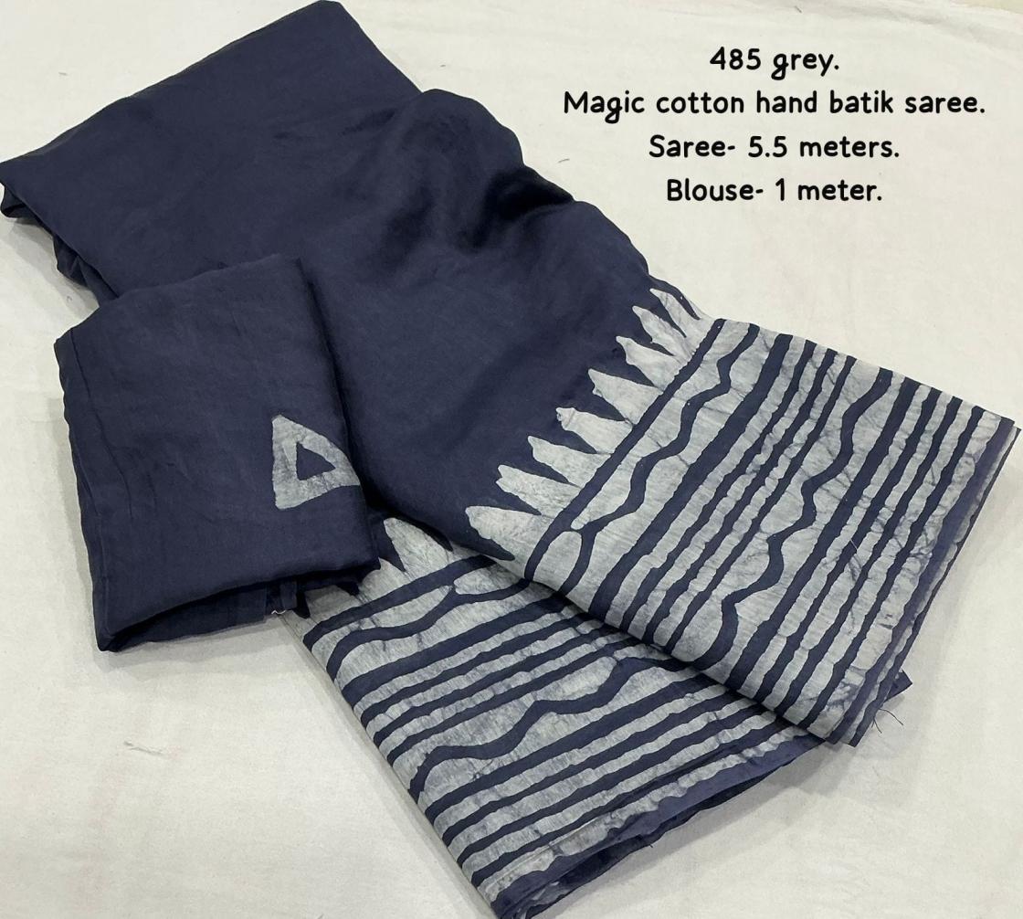 New pure chanderi batik sarees. KC - 485 magic cotton Quality- pure chanderi cotton saree with gala style batik peimts both side and plain in-between. Cotton tassles on pallu. Blouse- runing pure chanderi batik peimted blouse. Rate - 950+ship Top trusted quality |