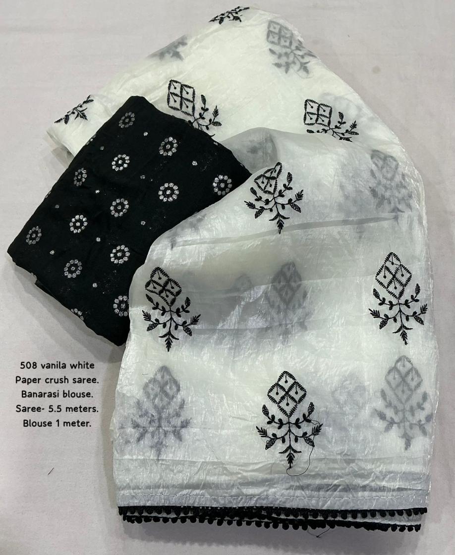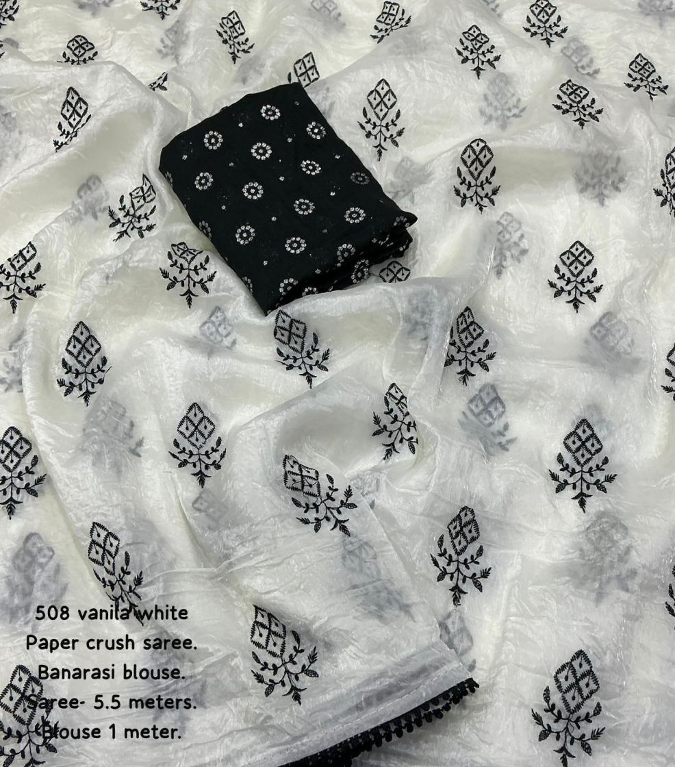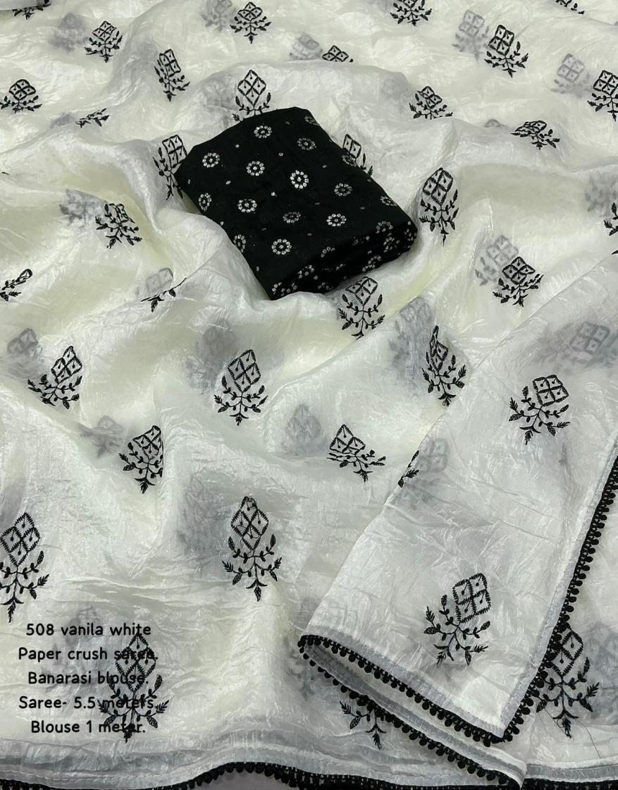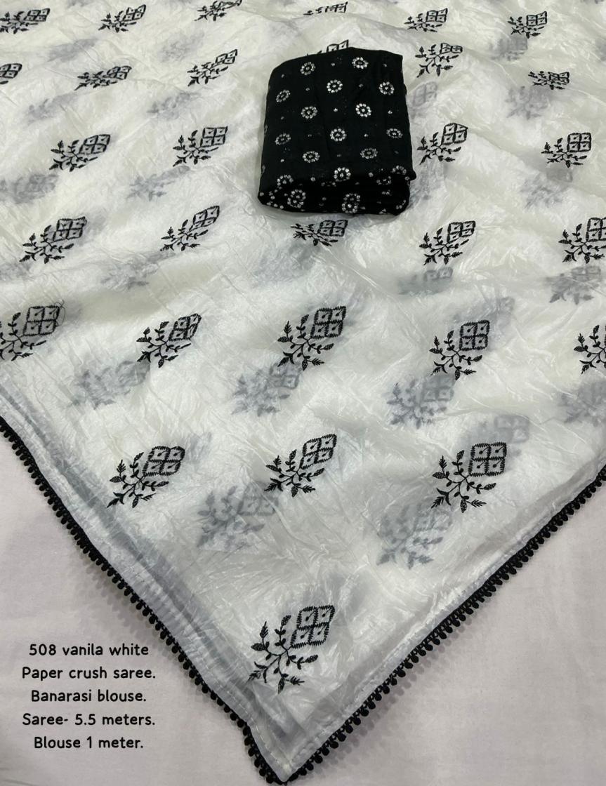 new arrivals New beautiful black white saree Vanilla whie single color edition. KC - 508 black white Black cotton patched lace. Perfectly matched pure Banarasi silk blouse. Rate - 1050+ship. Top trusted quality |