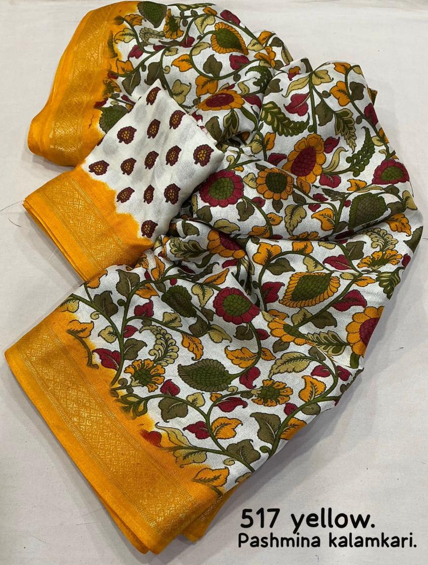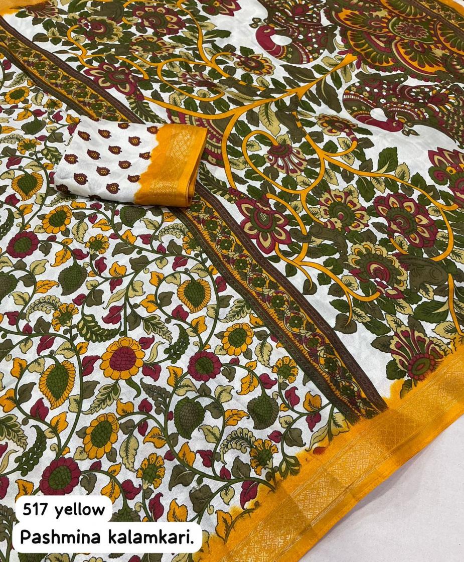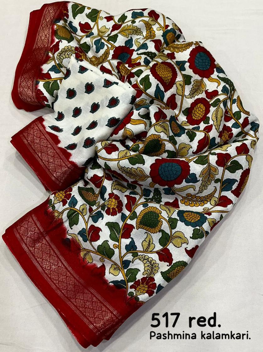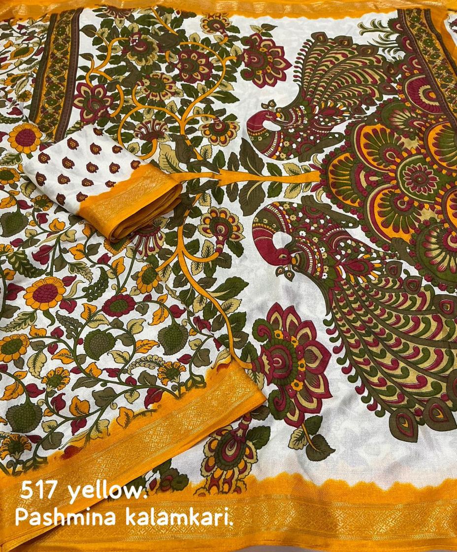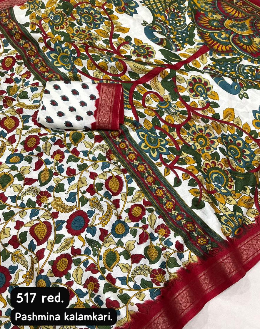 new arrivals New fancy printed saree. KC - 517 pashmina kalamkari. Soft cotton crape saree with self woven design and zari pattu border. Running printed blouse. Rate - 550+ship. Top trustee quality |