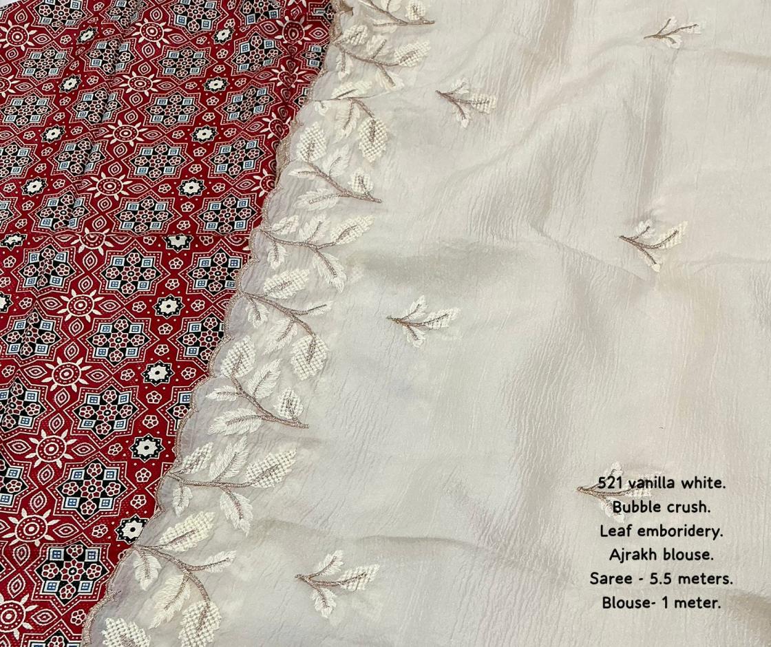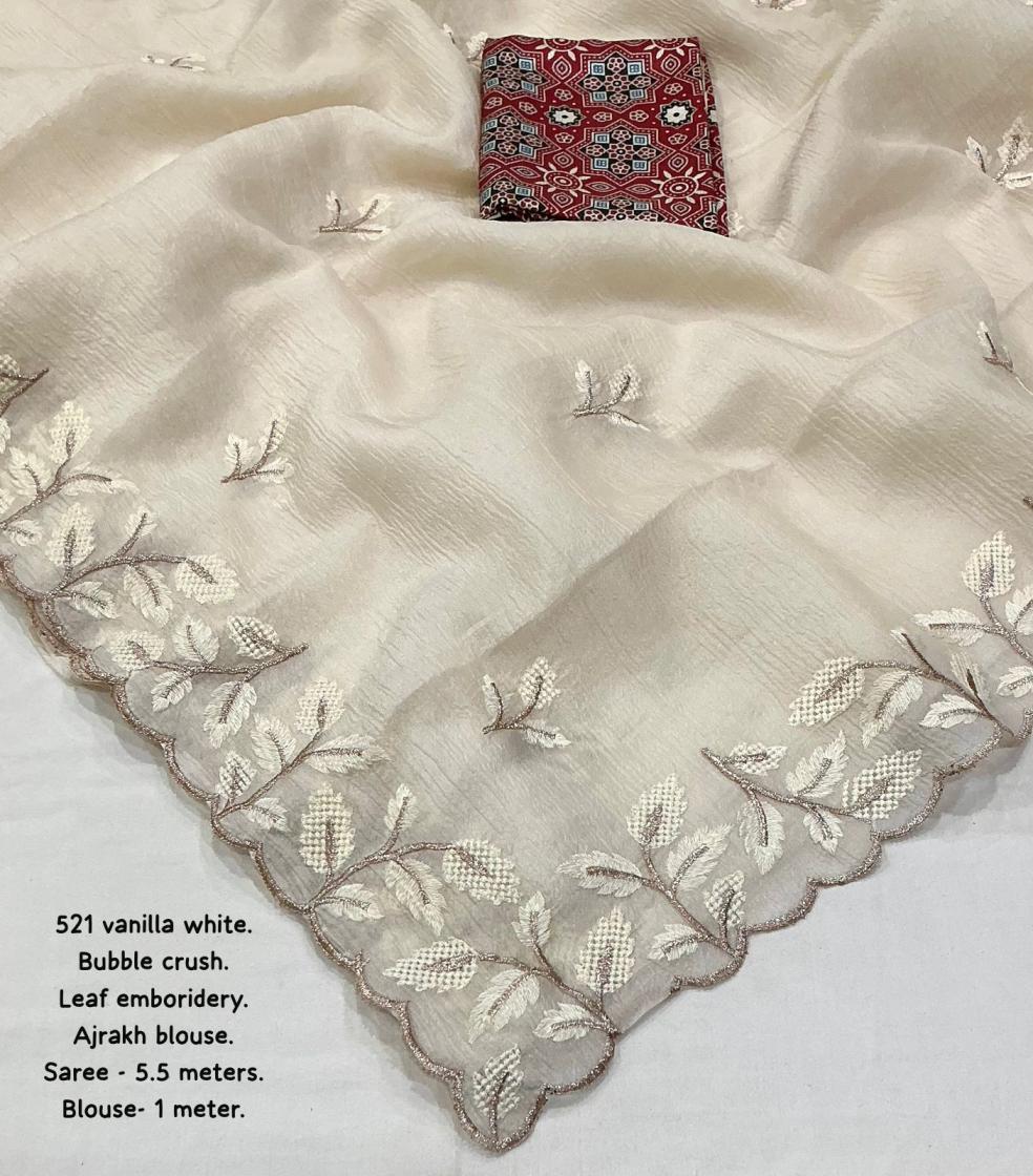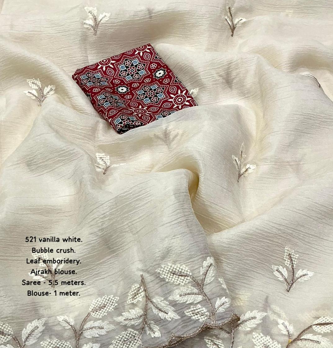 New arrivals New ivory crush embroidery saree Single Color edition. Ivory white. KC - 521 ivory crush Soft wrinkle crush saree with tone to tone embroidery leaf design. Contrast ajrakh style crape silk printed blouse. Rate - 1199+ship. Top trusted |
