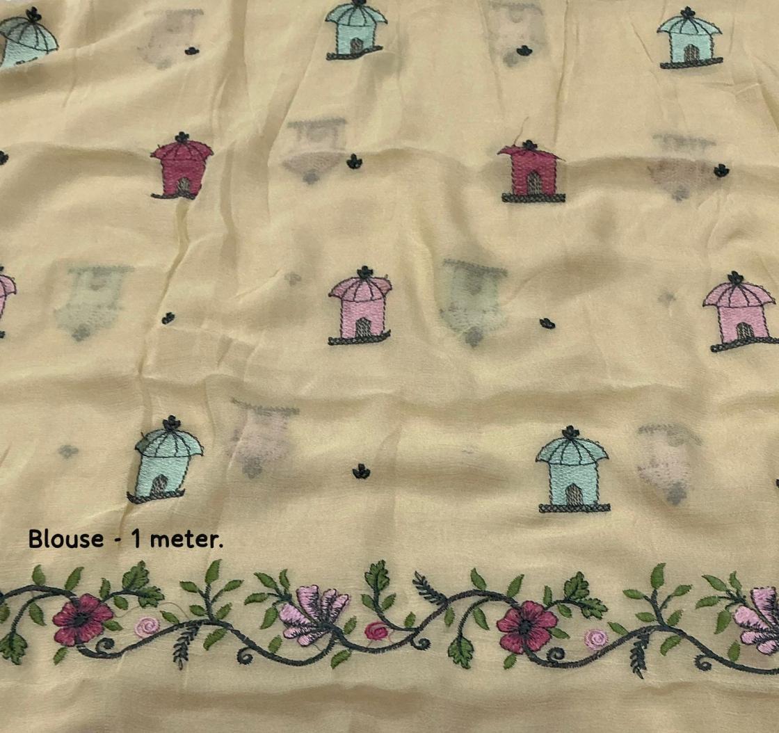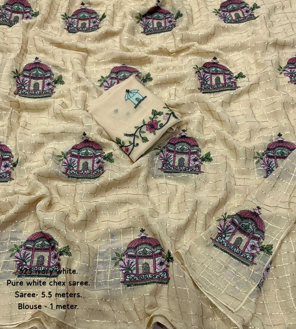 new arrivals One of best selling pure georgette saree in whole new look. Jharokha theme used in emboridary. Single color edition. kc - 525 georgette jharokha. Pure georgette saree with allover zari woven chex. Jharokha (window) style embroidery buttas in light dusty thread used. Tone to tone pure Georgette embroidery blouse. Rate - 1450+ship. Top trusted quality |
