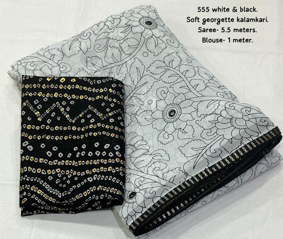 new arrivals New black & white georgette saree KC - 555 georgette kalamkari. Soft georgette printed saree in pencil style kalamkari. Patched black sequence lace. Perfectly matched foil bhandani blouse. Rate - 630+ship. Top trusted quality |