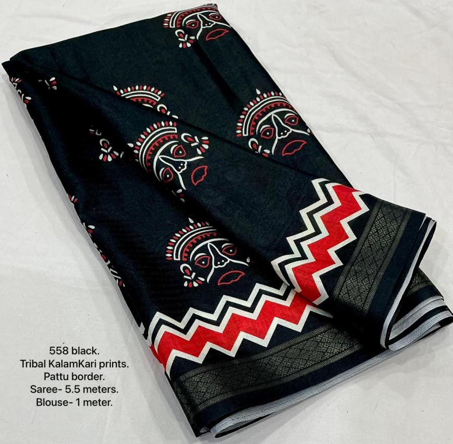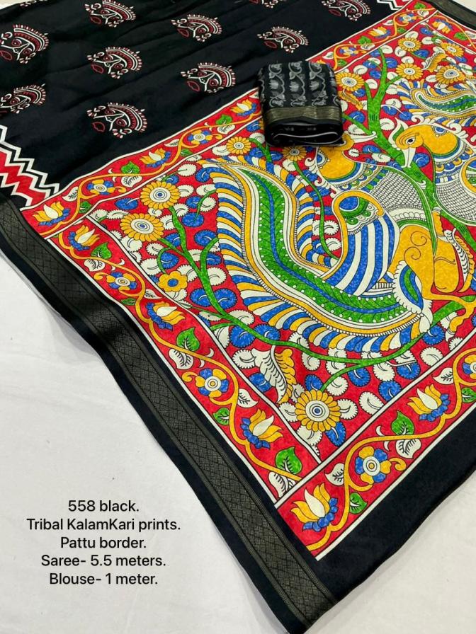 new arrivals New fancy traibal style black saree. KC - 558 tribal kalamkari. Soft pashmina silk saree with zari pattu woven border and self jacq woven design. Beautiful combination of tribal prints with KalamKari pallu. Running Contrast printed blouse. Rate - 650+ship. Top trusted quality |