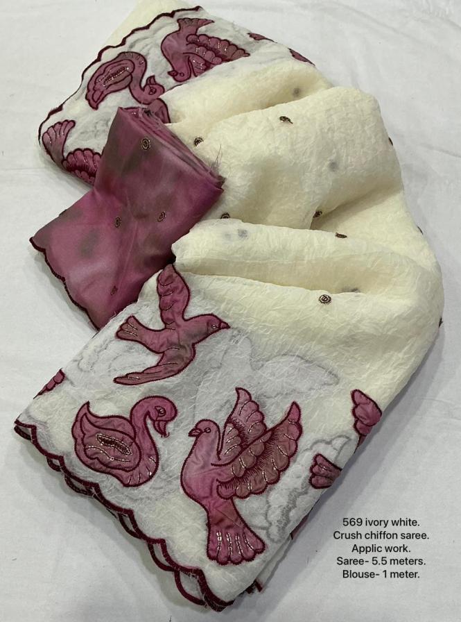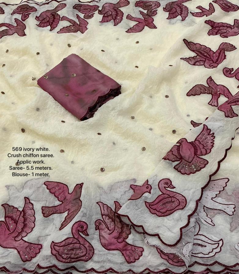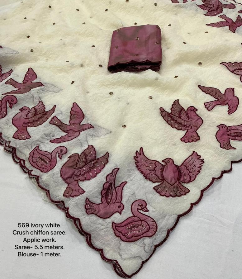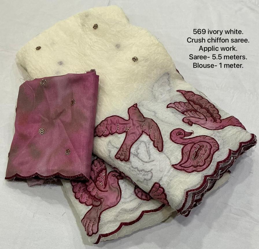 new arrivals New premium saree KC - 569 applic crush. Soft ivory white crush chiffon saree. Applic work done. Beautiful combination of embroidery and fabric patch work. Scaleup border. Perfectly matched crape shibor style with embroidery. Rate - 1550+ship. Top trusted quality |