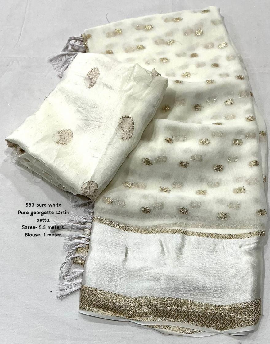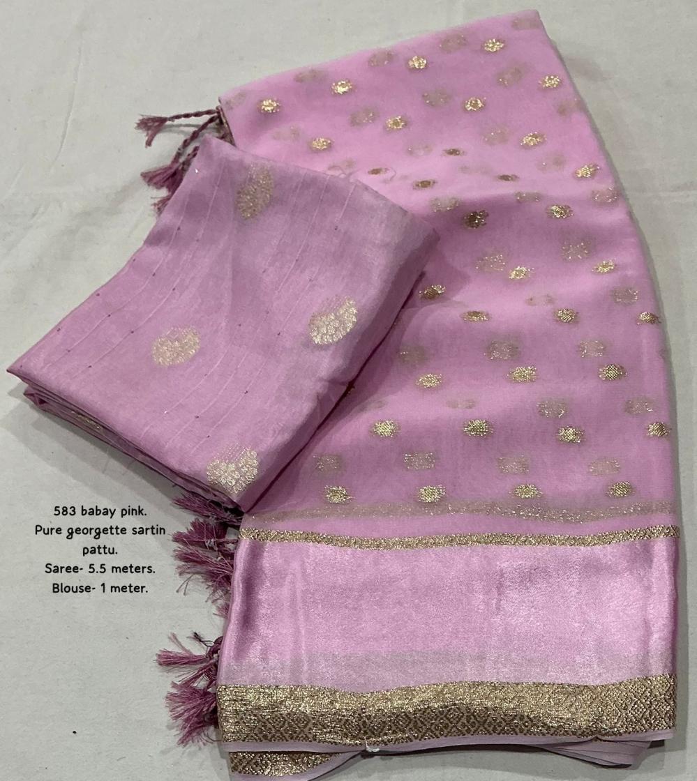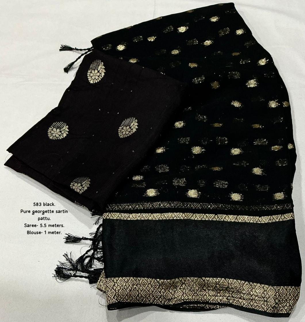new arrivals New preimum pure geirgeette collection kc - 583 pure georgette sartin pattu, Pure georgette sartin pattu saree with zari butti allover. Tassles on pallu. Both side sartin pattu. Perfectly matched pure dolla silk tye & dye blouse. Rate - 1350+ship. Top premium quality |